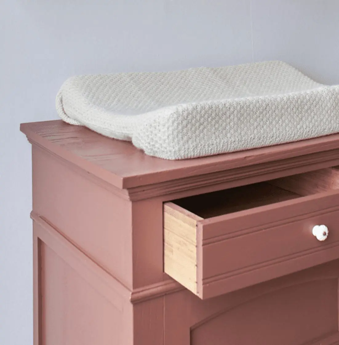 Op je commode komt een aankleedkussen. De gemiddelde afmetingen van een aankleedkussen zijn 47 cm breed en 70 cm lang. Je wilt een blad dat minstens deze afmetingen heeft. Wij zorgen ervoor dat al onze commodes minimaal 47 a 48 cm diep zijn, soms verlengen we een blad aan de achterkant. Een extra voordeel wat hier bij komt is dat het blad iets uitsteekt, en daardoor over de plint valt. De commode sluit dan netjes aan tegen de muur.