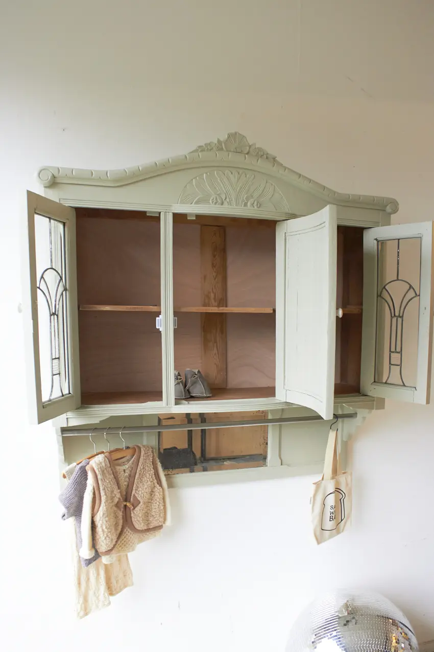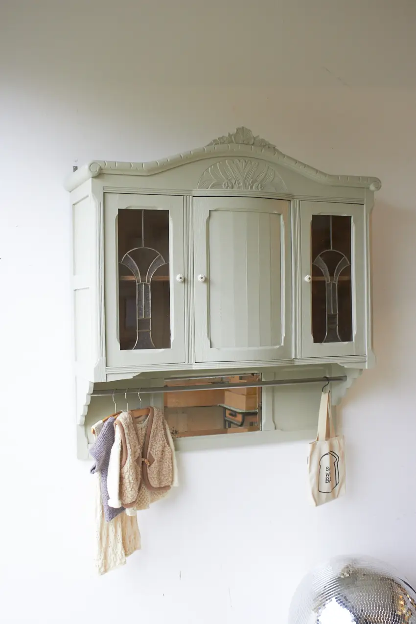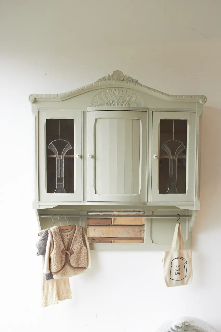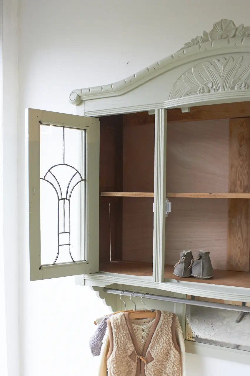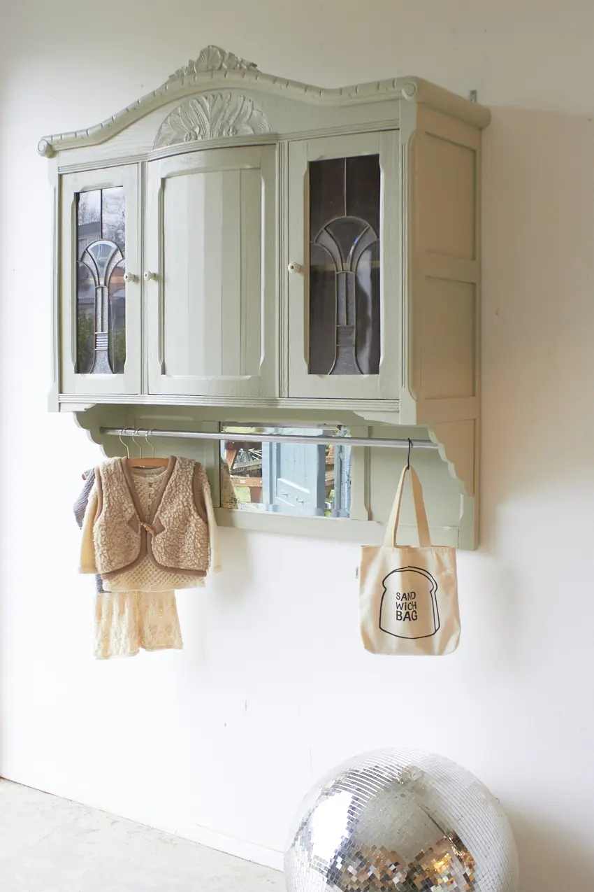 Wauw, wat een prachtige vintage hangkast met glas in lood in onze kleur Voorjaar is dit geworden. Oorspronkelijk was dit de bovenkant van een buffetkast. Wij hebben er nu een hangkast van gemaakt. Nu helemaal klaar voor een nieuwe plek.