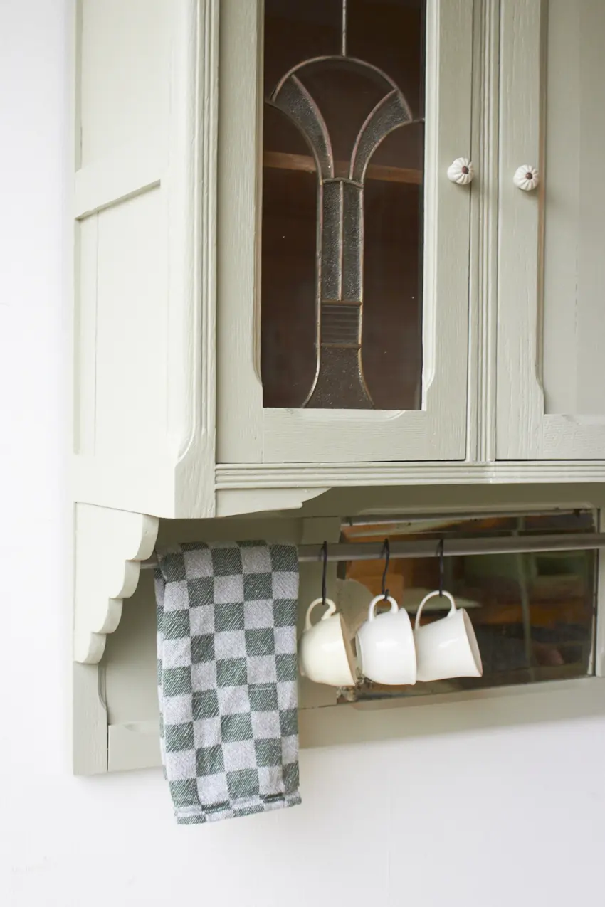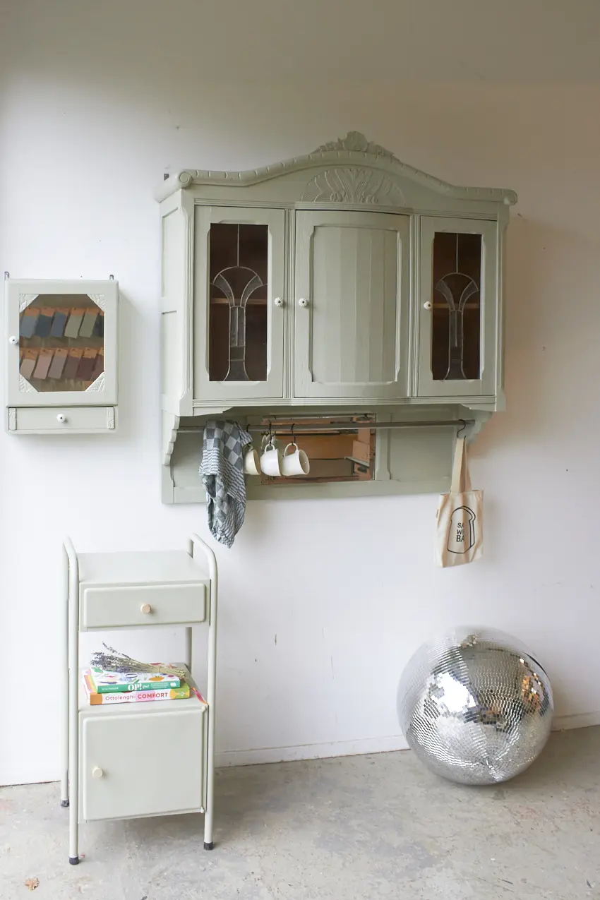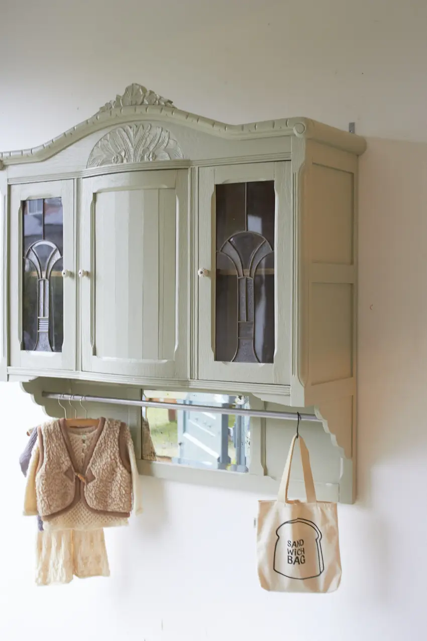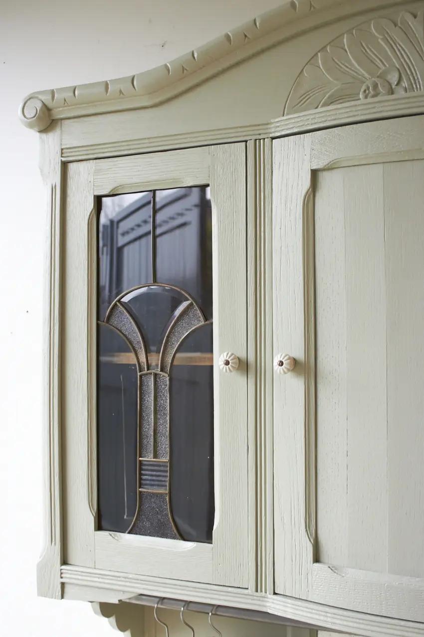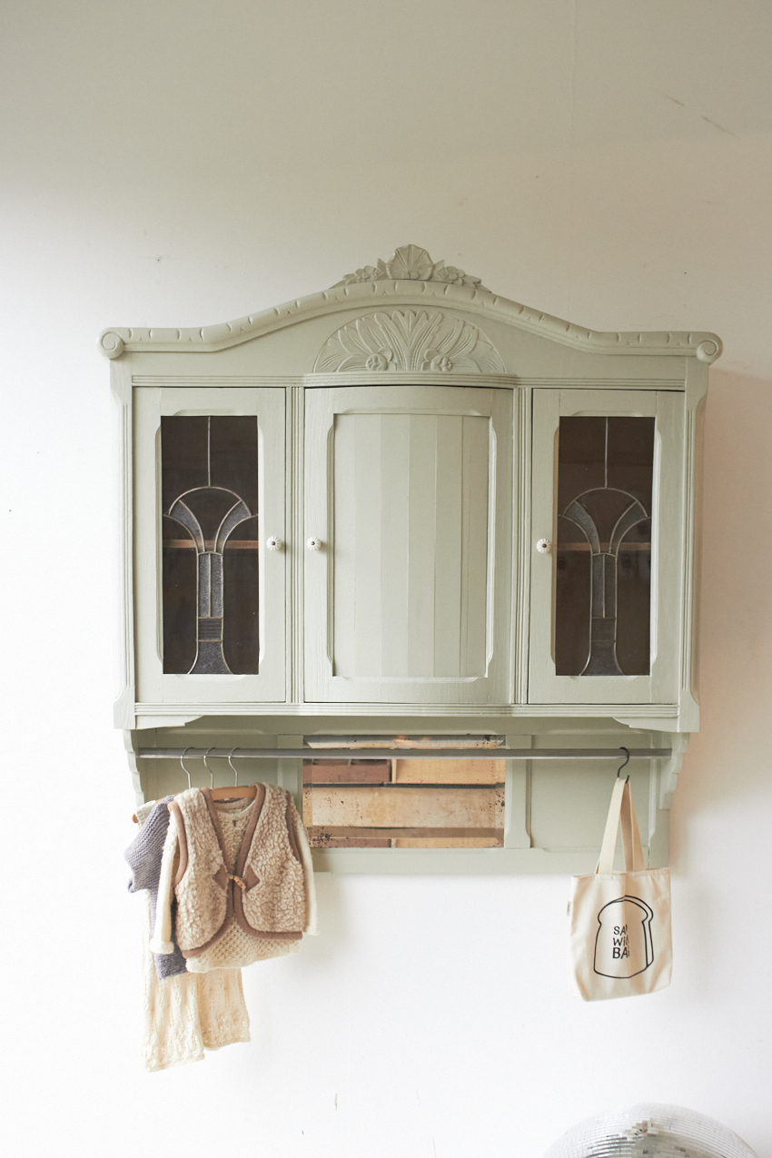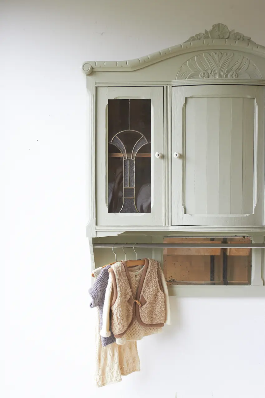 Wauw, wat een prachtige vintage hangkast met glas in lood in onze kleur Voorjaar is dit geworden. Oorspronkelijk was dit de bovenkant van een buffetkast. Wij hebben er nu een hangkast van gemaakt. Nu helemaal klaar voor een nieuwe plek.