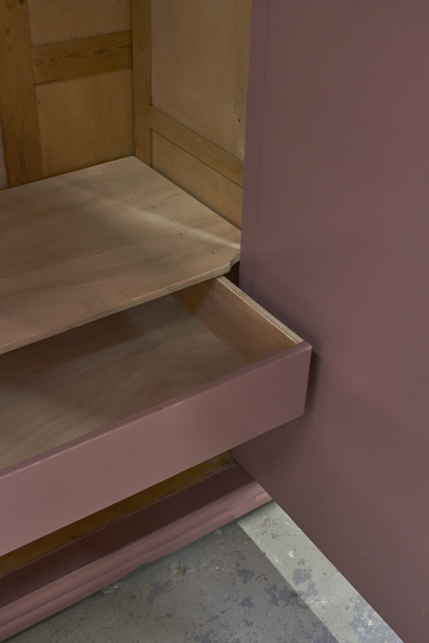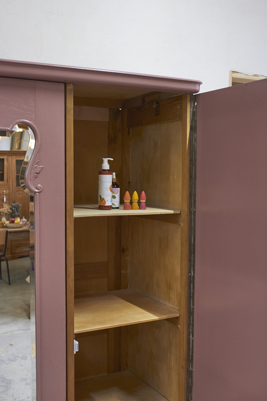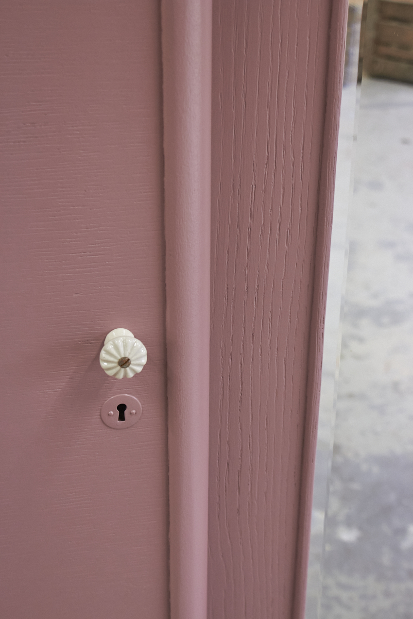 De bodem hebben we kunnen hergebruiken en goed opgeschuurd. De indeling is opnieuw op maat gemaakt. Rechts zitten drie planken en links een roede met daaronder een plank en een grote lade. De spiegel is geslepen en heel oud, heeft hier en daar vlekjes en een ronde kras. Wij vinden dat niet erg, het geeft de kast zoveel sfeer. De deuren sluiten nu weer netjes door de magneetjes en de porseleinen knoppen. Na alle reparaties hebben we hem geschilderd in onze kleur Bes. Wat een goede keuze! Fris roze, paars ja een hele fijne toevoeging en zo leuk te combineren met onze kleur Heide.