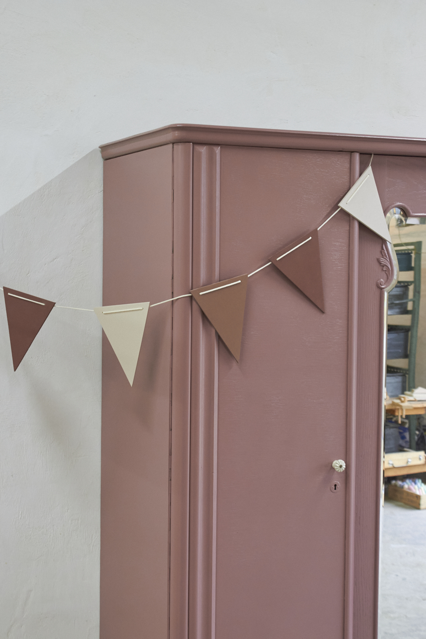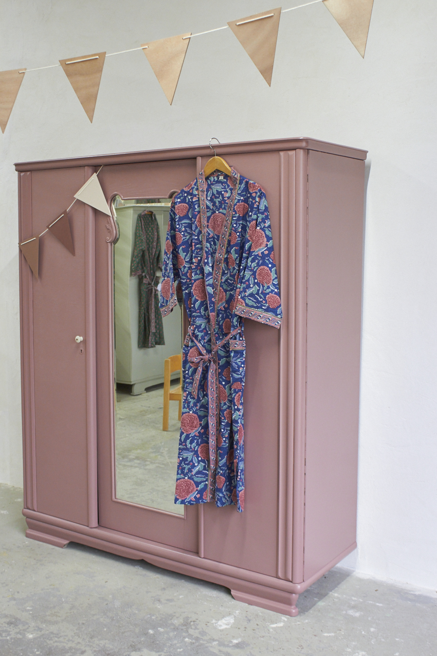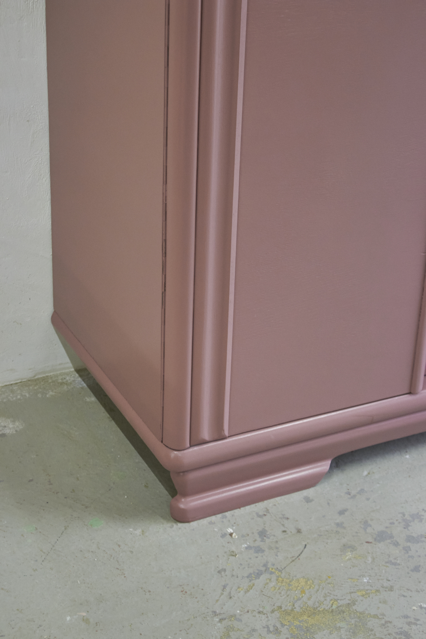 De bodem hebben we kunnen hergebruiken en goed opgeschuurd. De indeling is opnieuw op maat gemaakt. Rechts zitten drie planken en links een roede met daaronder een plank en een grote lade. De spiegel is geslepen en heel oud, heeft hier en daar vlekjes en een ronde kras. Wij vinden dat niet erg, het geeft de kast zoveel sfeer. De deuren sluiten nu weer netjes door de magneetjes en de porseleinen knoppen. Na alle reparaties hebben we hem geschilderd in onze kleur Bes. Wat een goede keuze! Fris roze, paars ja een hele fijne toevoeging en zo leuk te combineren met onze kleur Heide.