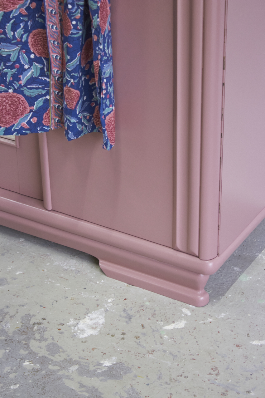 Deze vintage demontabele kledingkast is zo mooi geworden in onze nieuwe kleur Bes en heeft er al een heel leven op zitten, wat hem dat mooie karakter geeft. Het is de perfecte kast voor op de baby- kinder- of slaapkamer. Alle drie de deuren kunnen open en achter de deuren is er genoeg opbergruimte om kleding op te bergen. Deze spiegelkast heeft een fijne uitstraling.