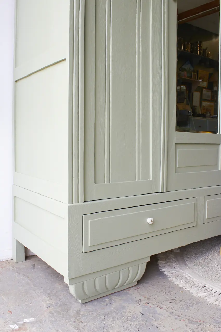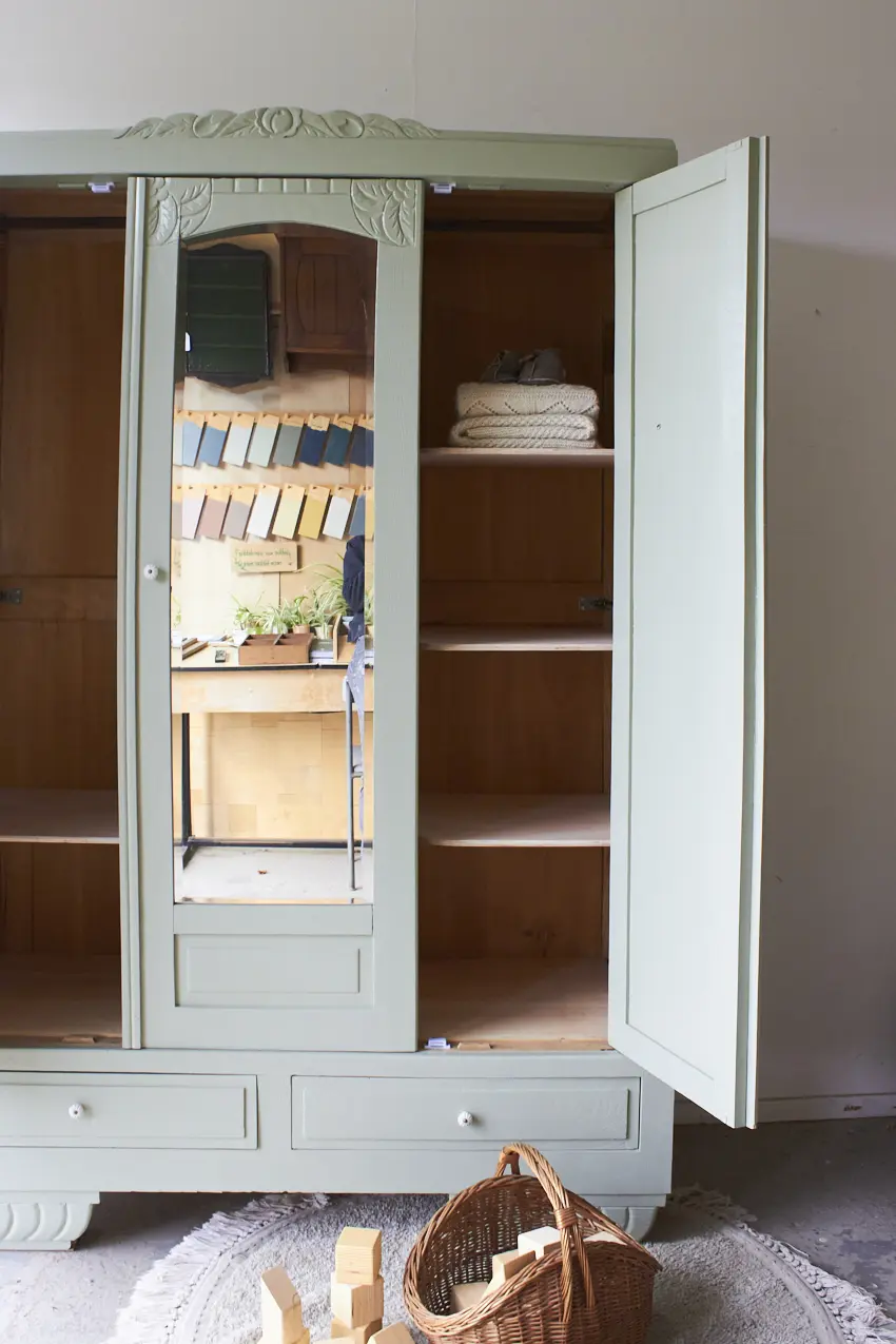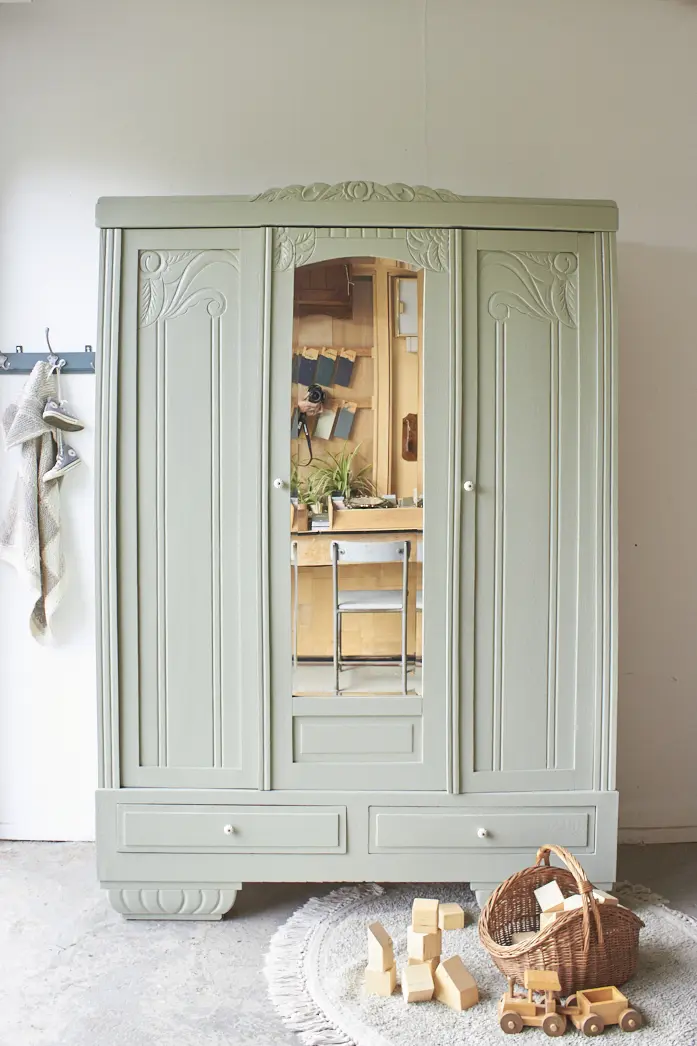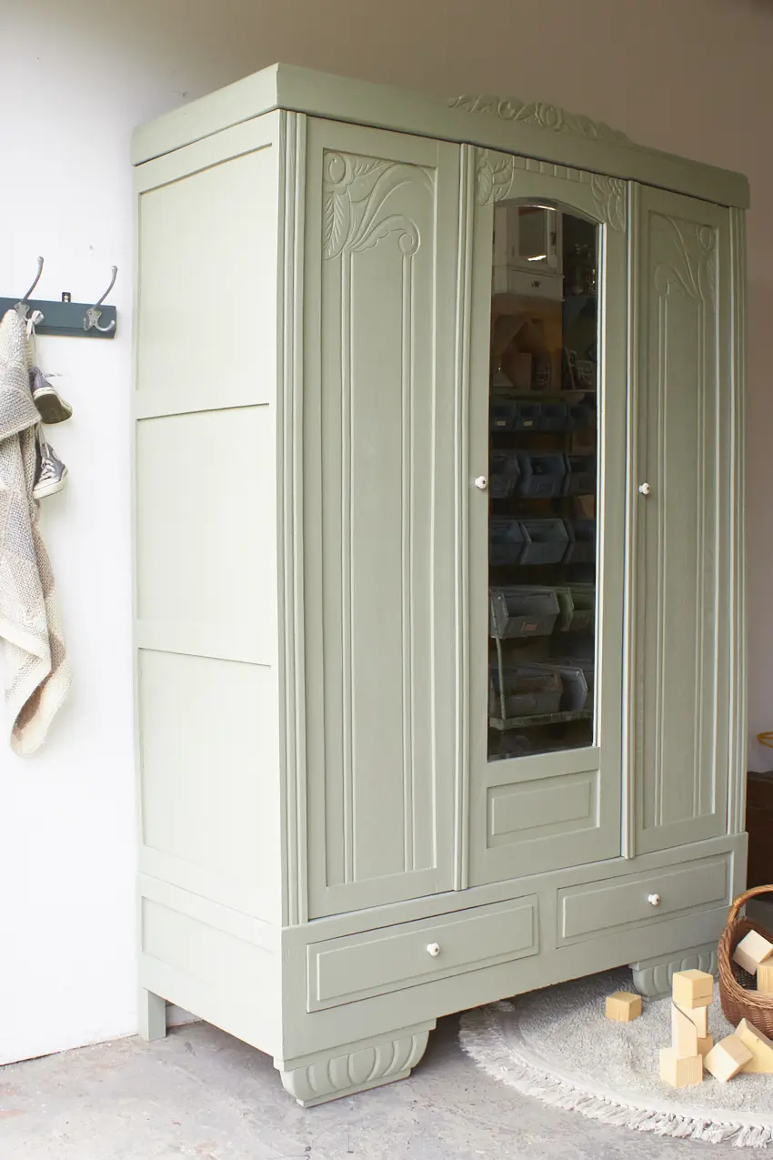We hebben voor deze prachtige kast gekozen voor onze kleur Artisjok. Artiskok is zo’n mooie, kalme kleur. Als je een meubel in de kleur Artisjok schildert, past het overal bij. Dat zijn de wetten van de natuur, leerde ik ooit van Liselot van Studio HEM. Natuurlijke groentinten kunnen met alles. Een allemansvriend, maar wel een kleur met karakter.
