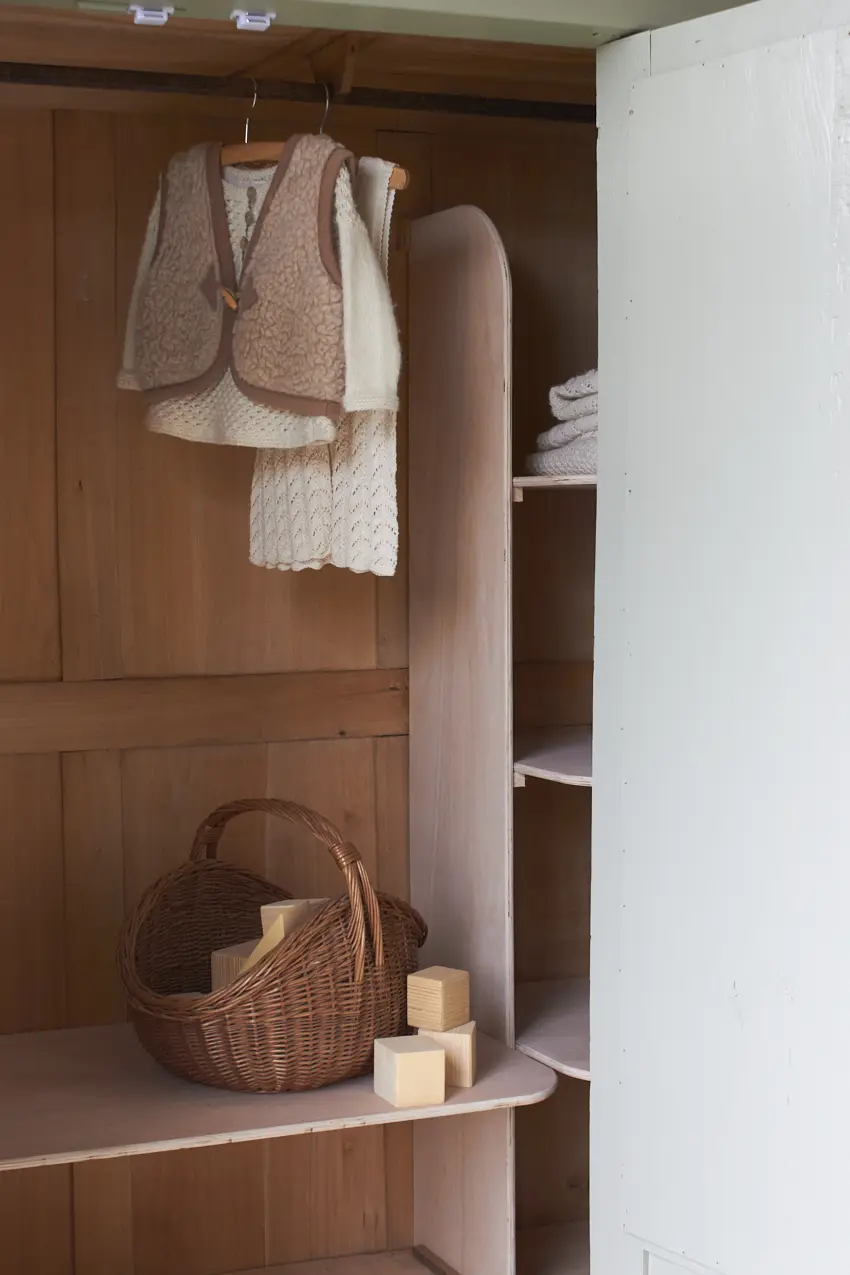 De kast heeft drie deuren. Met links in het grote vak een roede bovenin en een plank onderin. In het rechter gedeelte loopt de roede door, en zijn er nog 3 planken geplaatst. Alle planken zijn er uit te halen, zodat je de roede ook in zijn geheel kunt gebruiken, mocht je dat liever willen. r is een roede en drie legplanken. De deuren sluiten met een magneetje en met een lief porseleinen knopje. Wat een fijn resultaat!