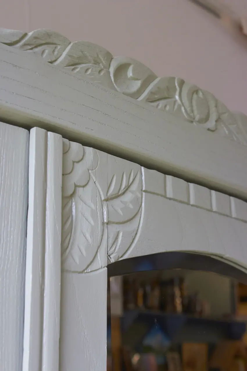 10834-1 Artisjok groene driedeurs kast met houtsnijwerk en vintage spiegel