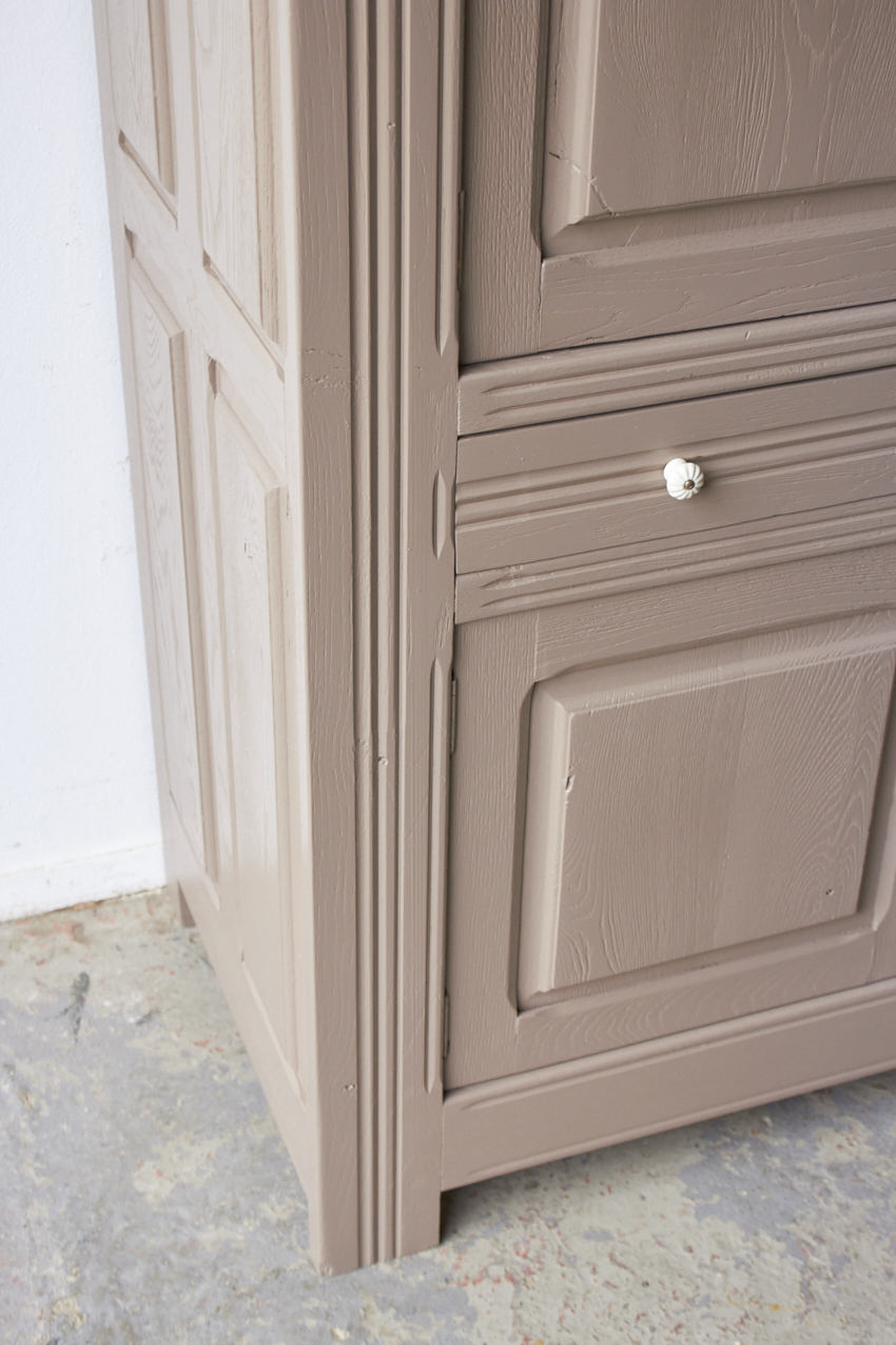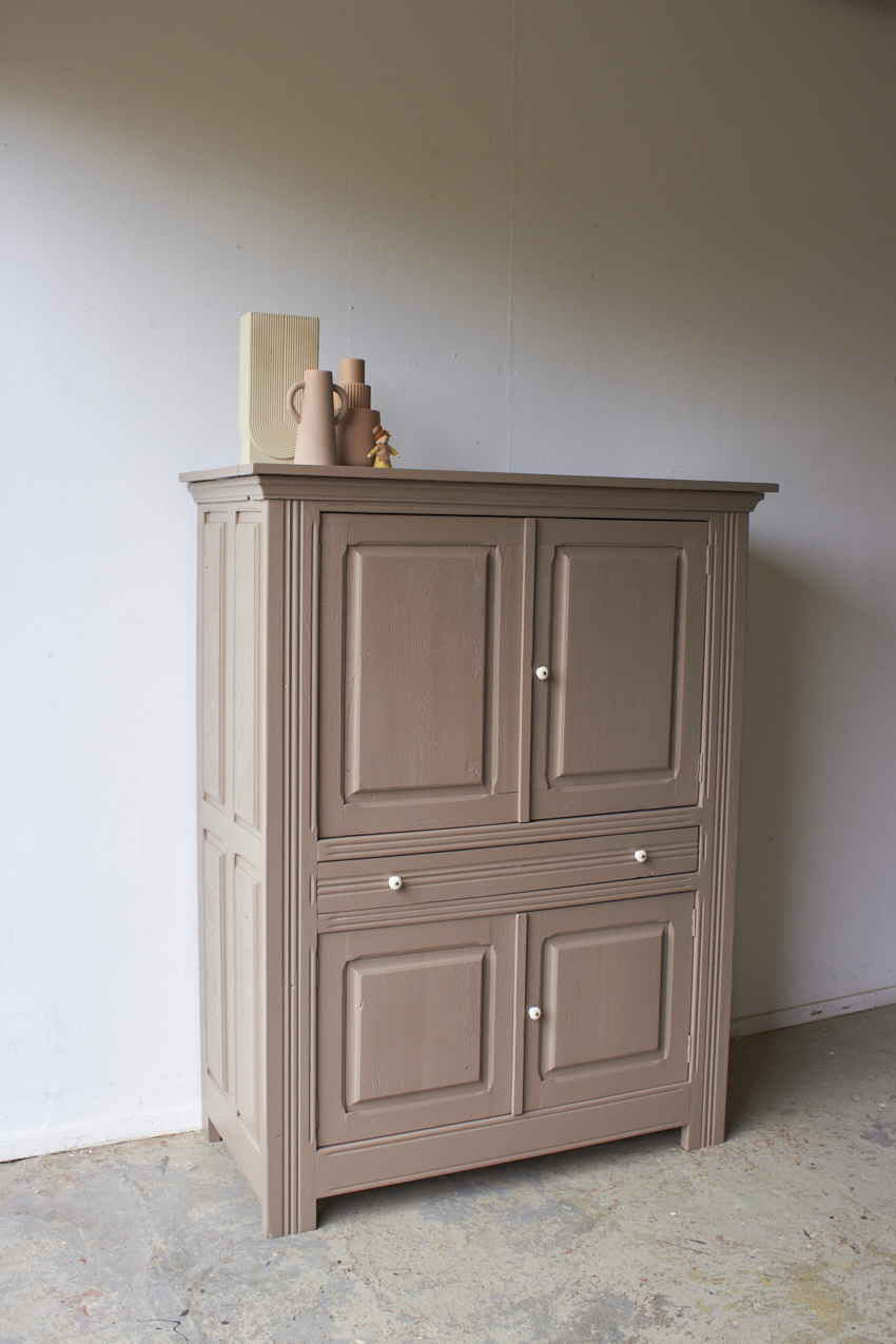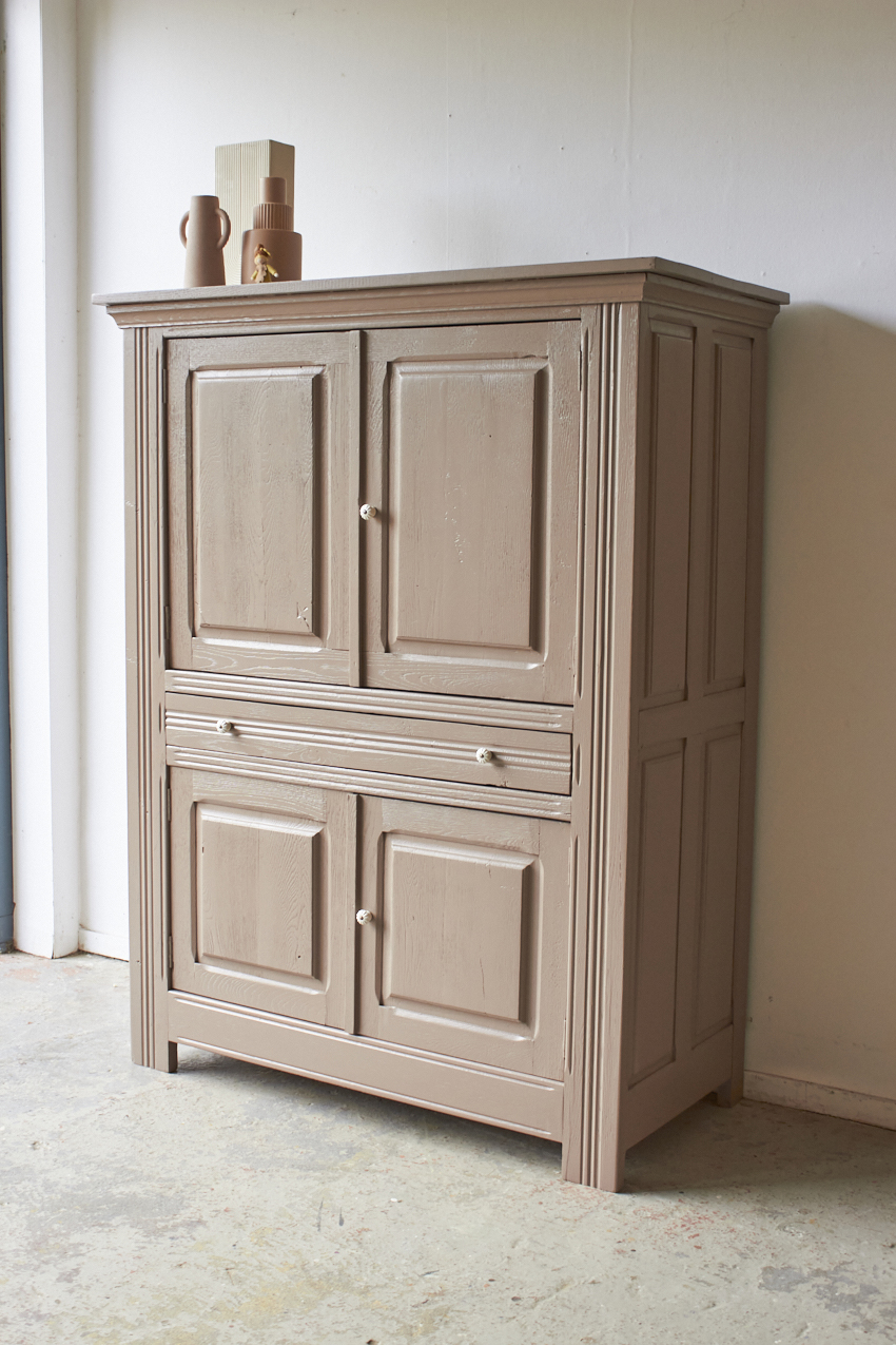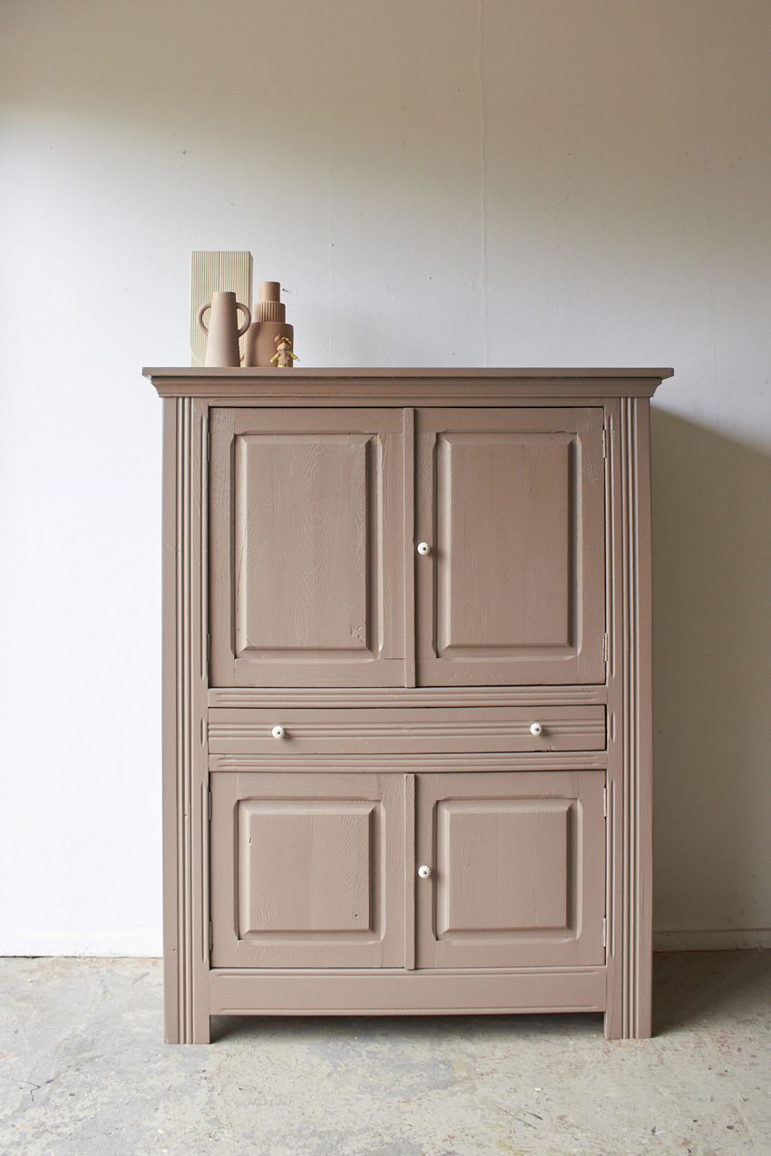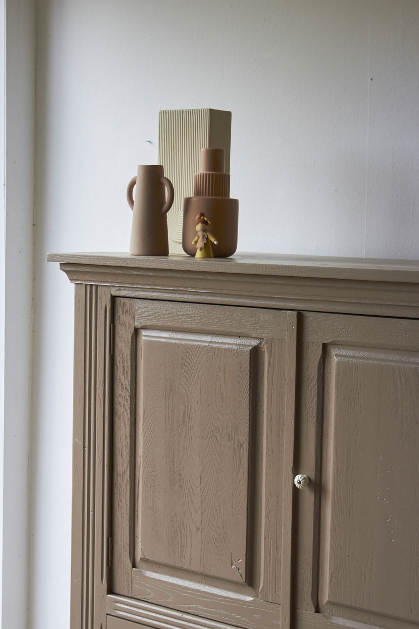 Toen de kast terugkwam van de zandstralers hebben we het meubel grondig schoongemaakt. Ook hebben we haar een anti-houtworm behandeling gegeven. De kast is daarna helemaal nagelopen en waar nodig gerepareerd. Daarna hebben we gekozen voor onze fijne kleur Hazel.