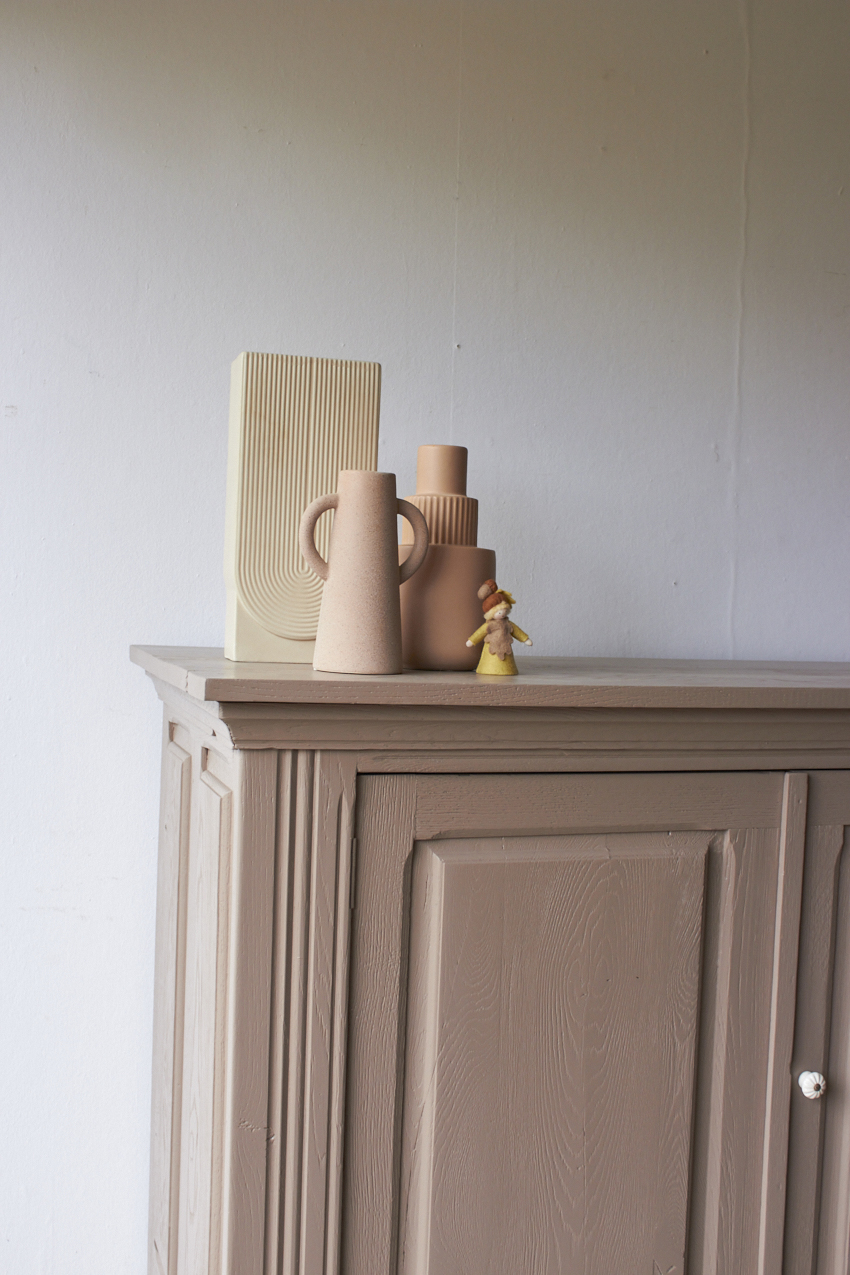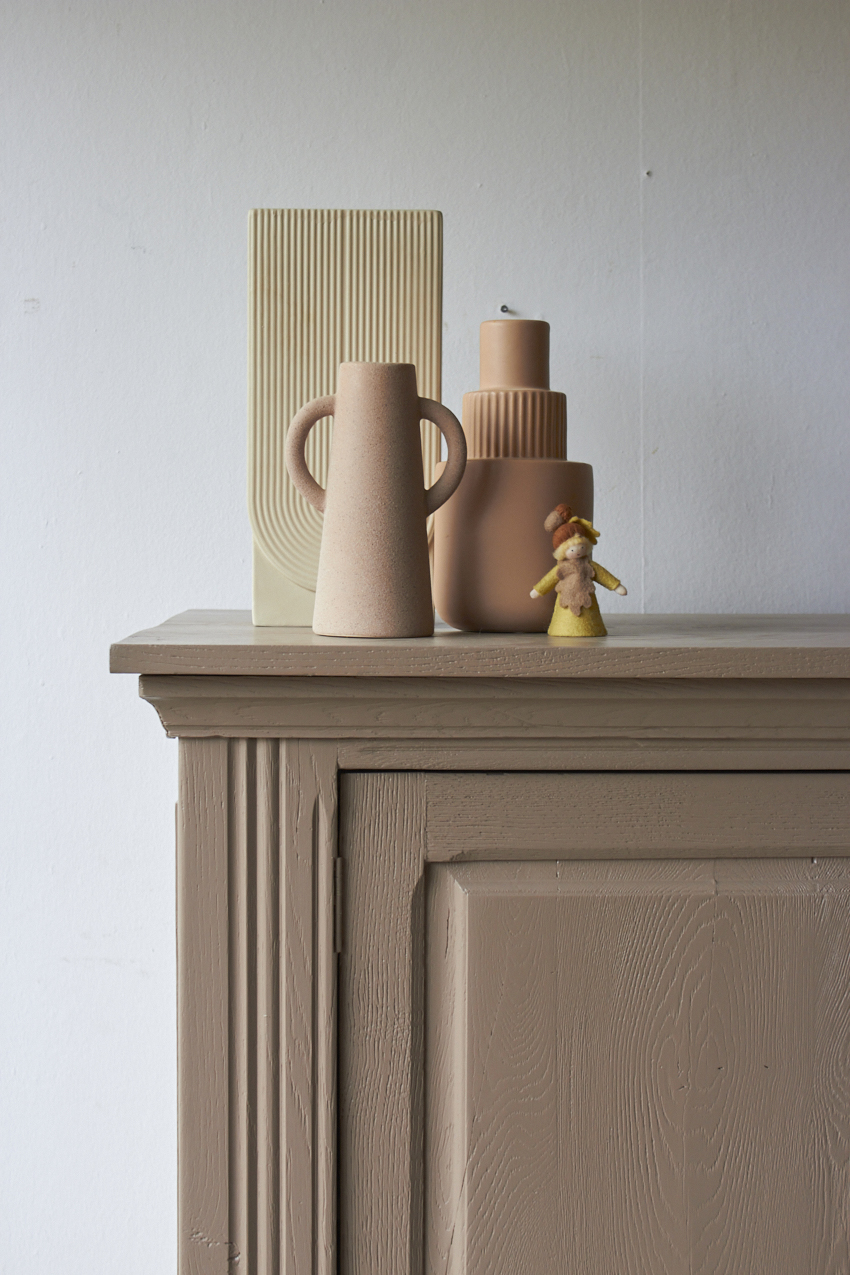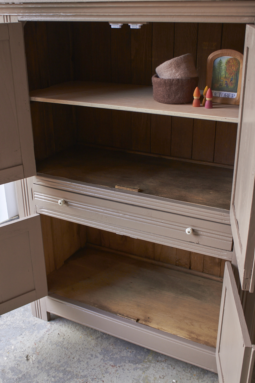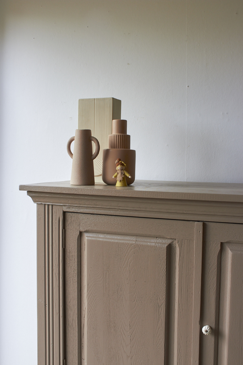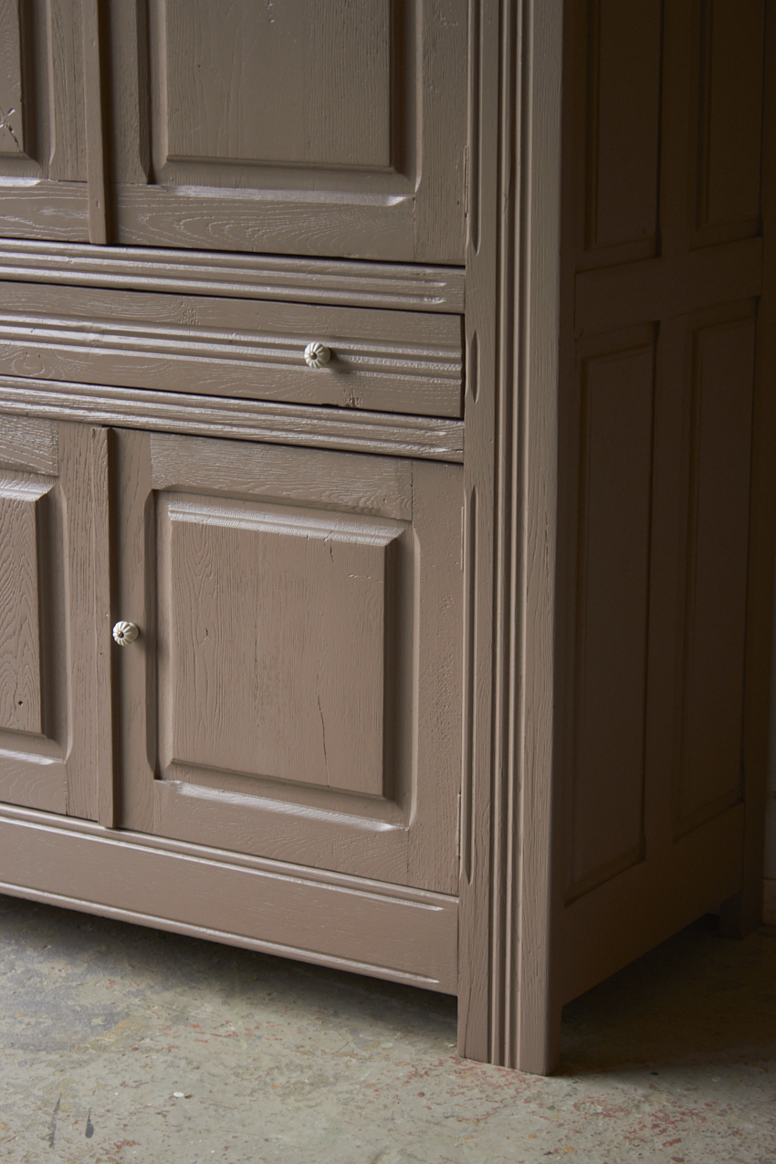 Toen de kast terugkwam van de zandstralers hebben we het meubel grondig schoongemaakt. Ook hebben we haar een anti-houtworm behandeling gegeven. De kast is daarna helemaal nagelopen en waar nodig gerepareerd. Daarna hebben we gekozen voor onze fijne kleur Hazel.