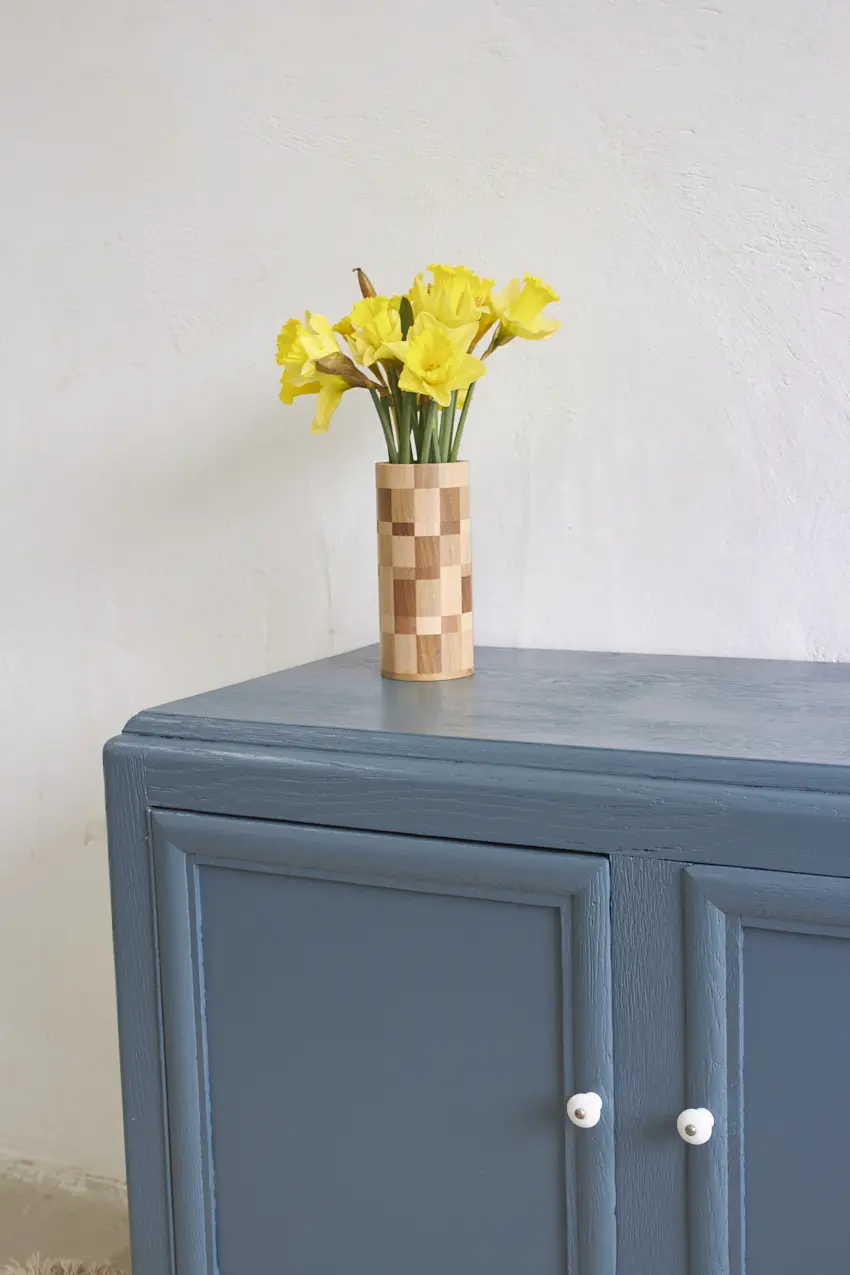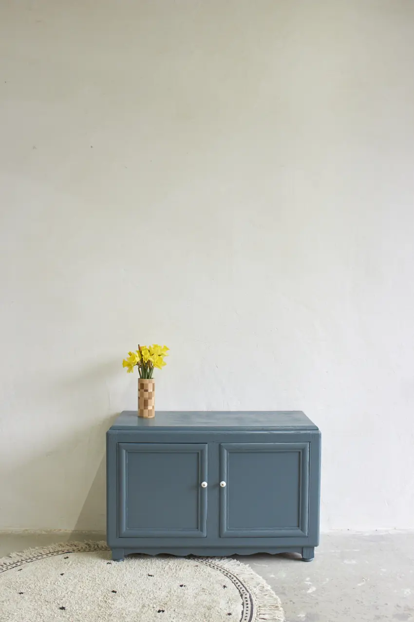Dit meubel hebben we gevonden in België en is daarna naar de meubelstraler gegaan, waar alle oude laklagen volledig zijn verwijderd. Vervolgens hebben we de kast grondig schoongemaakt en behandeld met een anti-houtwormspray. Zo weten we zeker dat eventueel aanwezige houtworm geen kans meer heeft, wel zo’n fijn idee. De deurtjes sluiten perfect dankzij een magneetsluiting en de porseleinen knopjes maken het geheel helemaal af. De kast is nu helemaal klaar voor een nieuwe plek en een nieuw verhaal.
