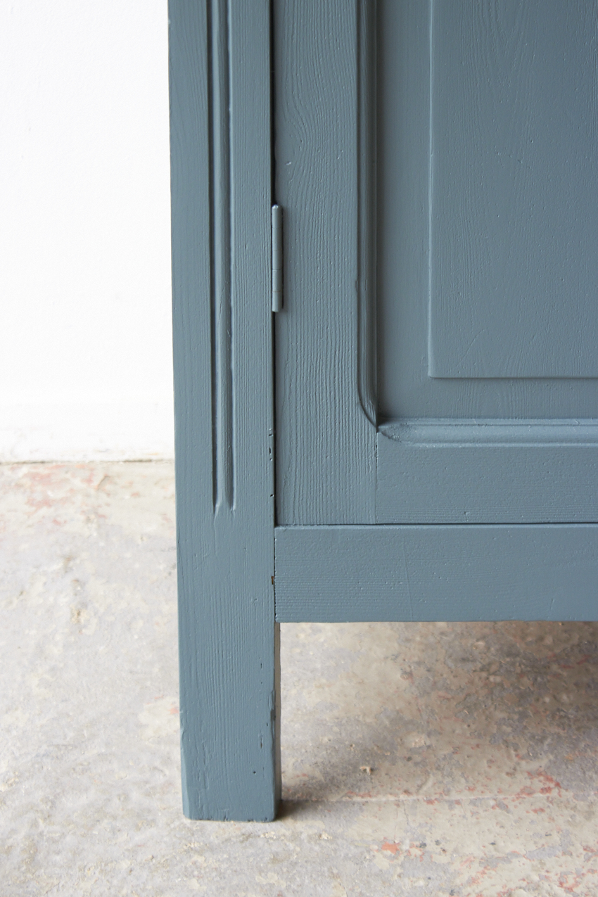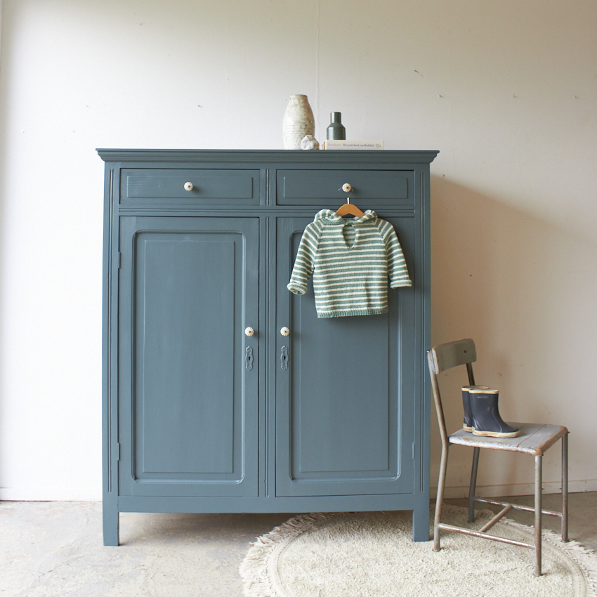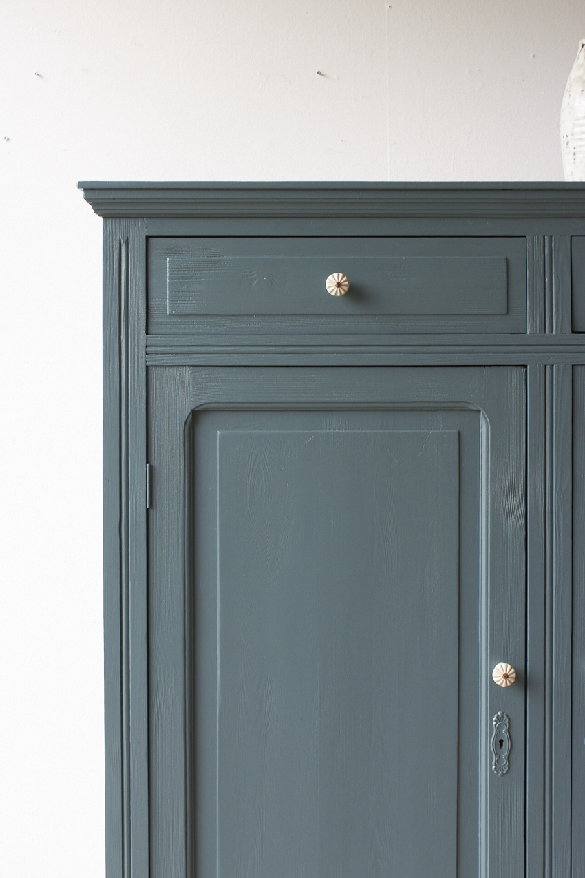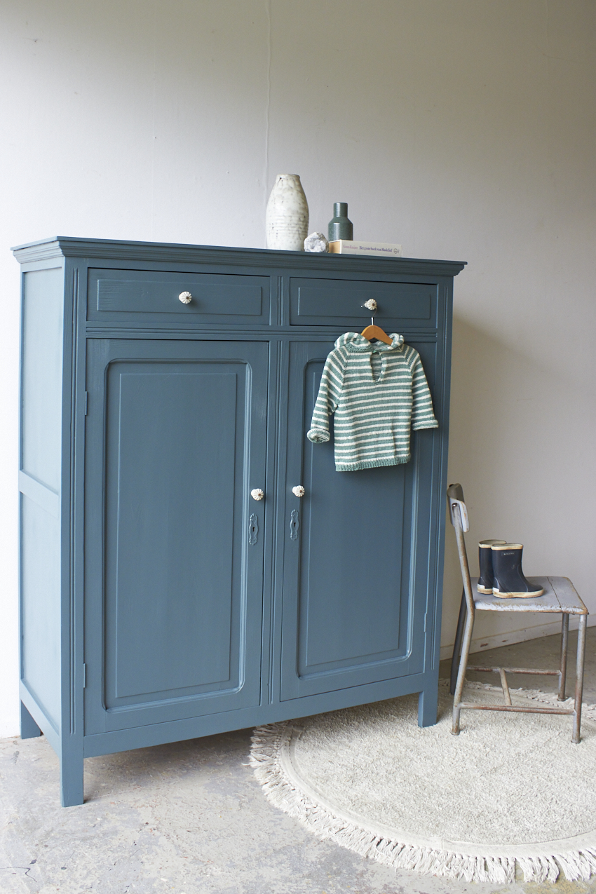 Toen de kast terugkwam van de zandstralers hebben we het meubel grondig schoongemaakt. Ook hebben we haar een anti-houtworm behandeling gegeven. De kast is daarna helemaal nagelopen en waar nodig gerepareerd. Daarna hebben we gekozen voor onze fijne kleur Klif. Dit is een kleur die al lang in ons palet zit en niet voor niets: wat een fantastische kleur. Sommige mensen vinden het blauw, anderen meer groen. Wij vinden het meer naar blauw neigen, een hele mystieke warme blauw met een vleugje groen. Deze kleur geeft ieder meubel karakter en is prachtig in combinatie met Nacht en met Saffraan. Deze kleur zal niet snel vervelen!