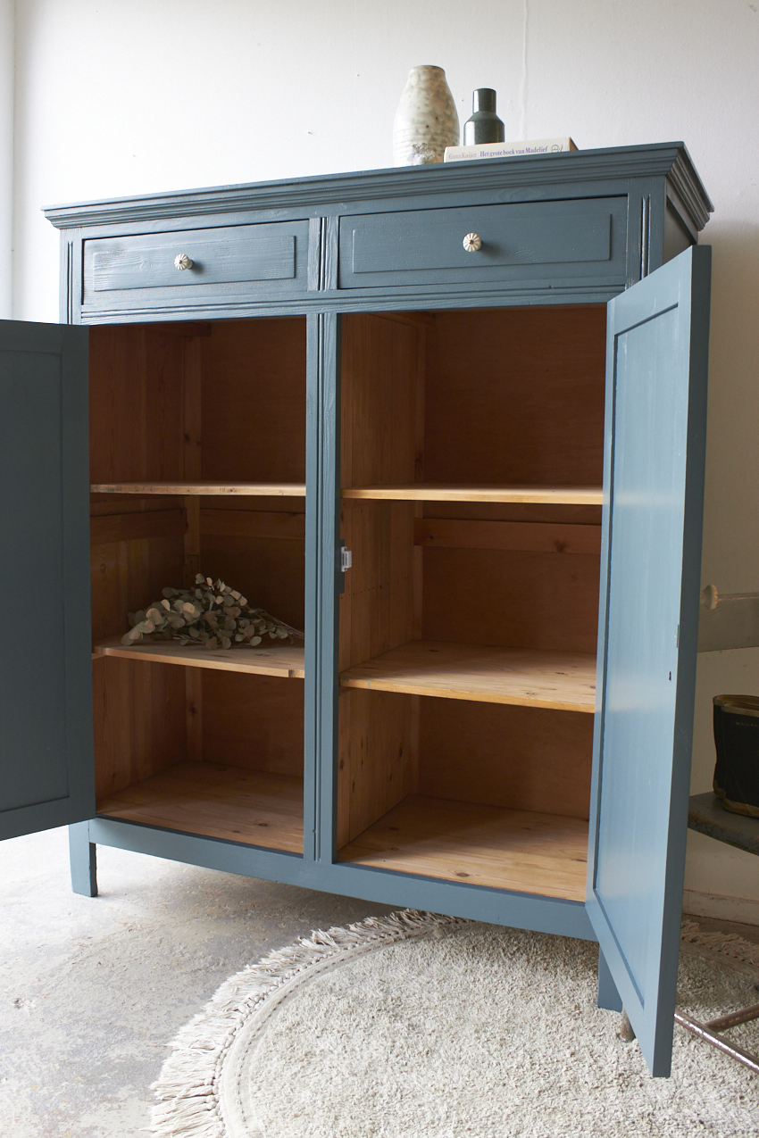 Wat een prachtige kast is dit geworden. Perfect voor in de woonkamer, als linnenkast in de slaapkamer of als fijne spelletjeskast in de kinderkamer. Beide deuren kunnen open en achter de deuren is er genoeg opbergruimte om servies, spelletjes of knutselspullen op te bergen.