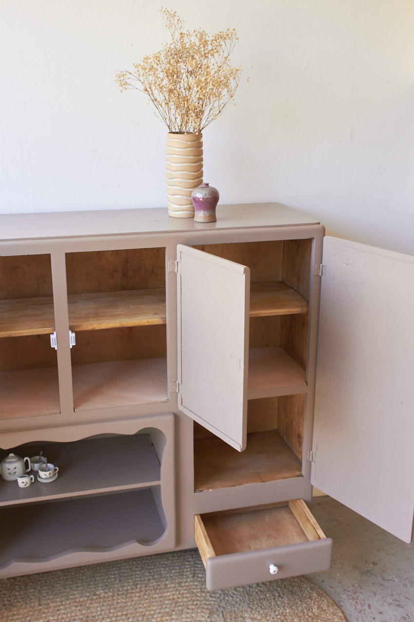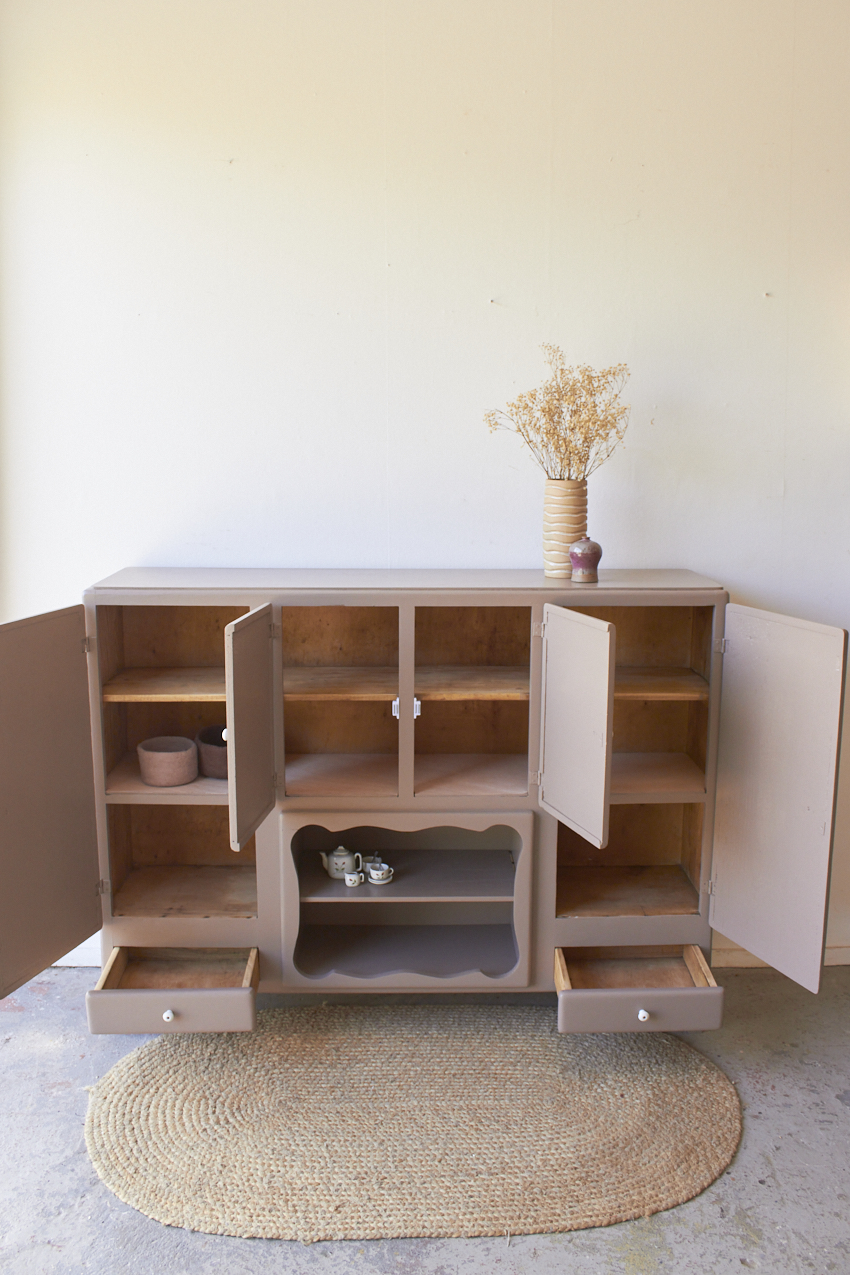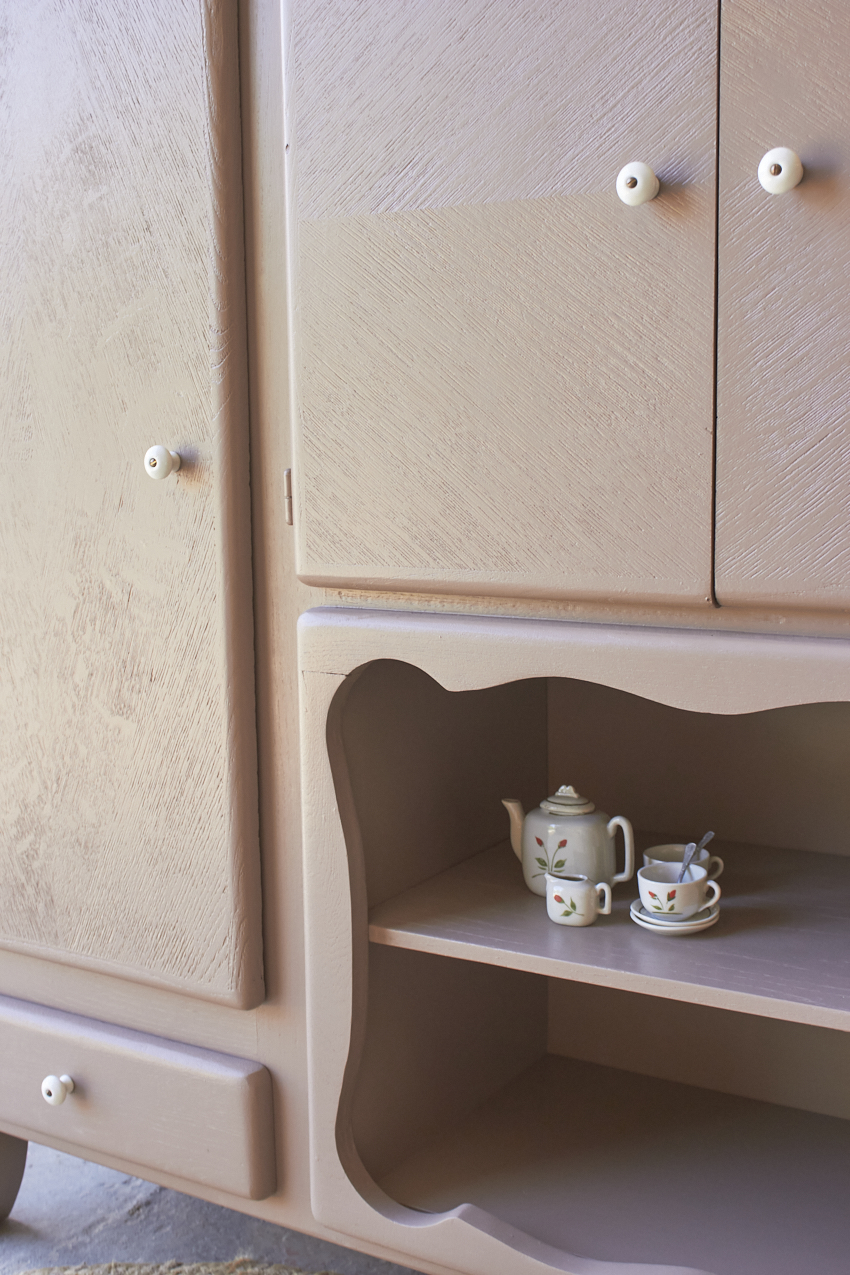 We hebben de kast grondig schoongemaakt en behandeld tegen houtworm. Op elke bodem zat plakplastic. Alles is verwijderd en de plakresten zijn weg geschuurd. Carmen heeft er nieuwe pootjes onder gemaakt en langzamerhand kwam er een hele leuke kast te voorschijn! Jullie kozen voor onze kleur Hazel via een poll op Instagram. En nu zijn we allemaal verliefd. Hazel is een mooie mix van roze, paars en beige. Deze kleur deed ons denken aan een hazelnoot, vandaar de naam Hazel. Een hele fijne zachte kleur, niet te zoet en niet te saai. De kast hebben we afgewerkt met witte porseleinen knopjes. We zijn heel benieuwd waar deze unieke kast terecht komt.