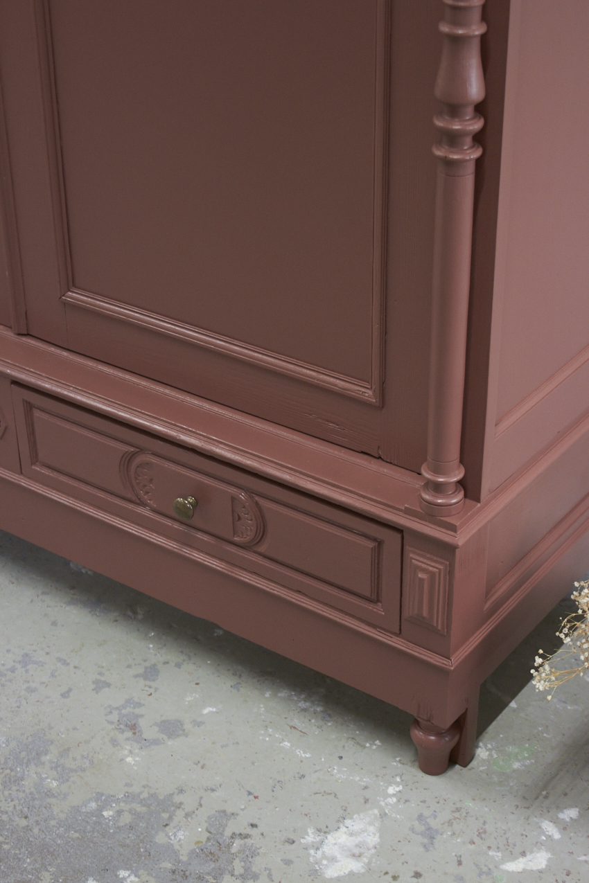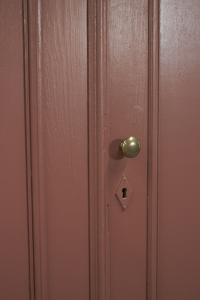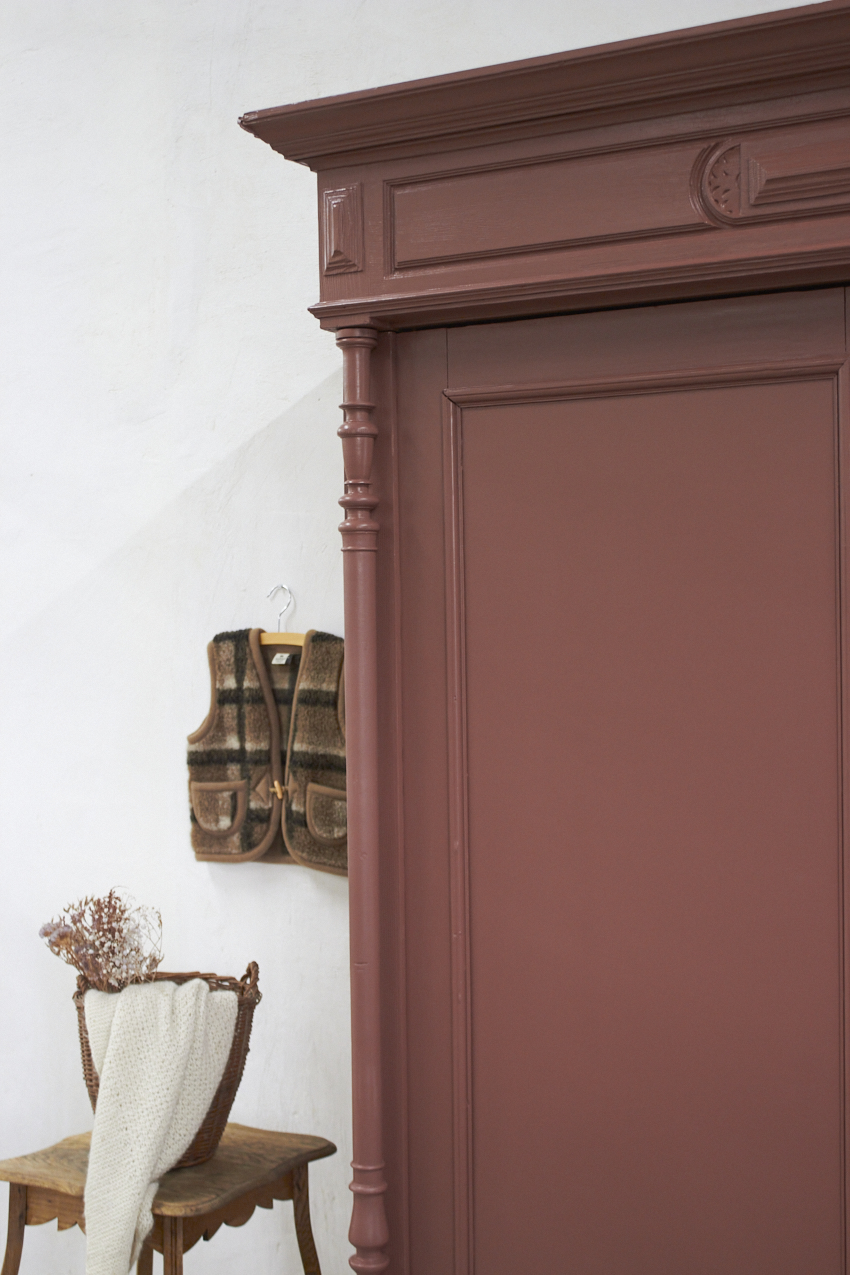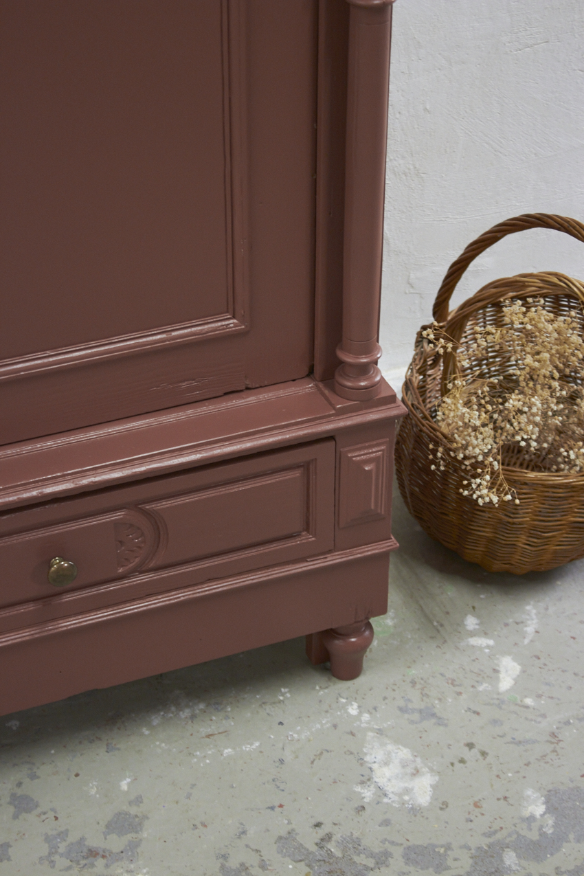 Deze vintage demontabele kledingkast is geschilderd in onze eigen kleur Karmozijn, een tint waar we elke keer weer blij van worden. Dit type kast hebben we vaker in huis; stuk voor stuk uniek, met hun eigen karakter. Dit exemplaar heeft het perfecte formaat voor een kinderkamer. De kast is heerlijk diep, waardoor je verrassend veel kleding kunt opbergen. Praktisch én mooi.
