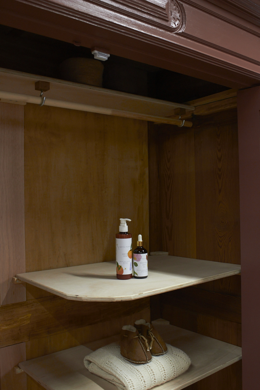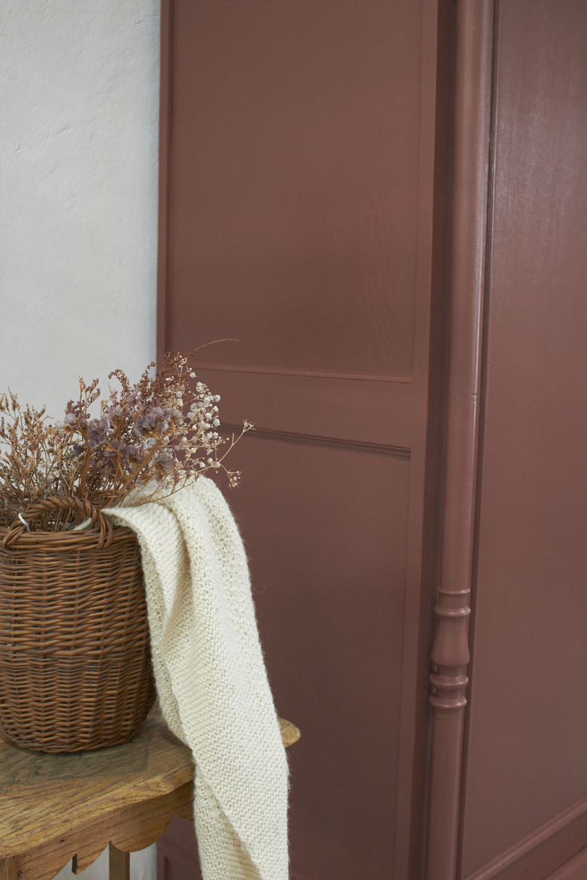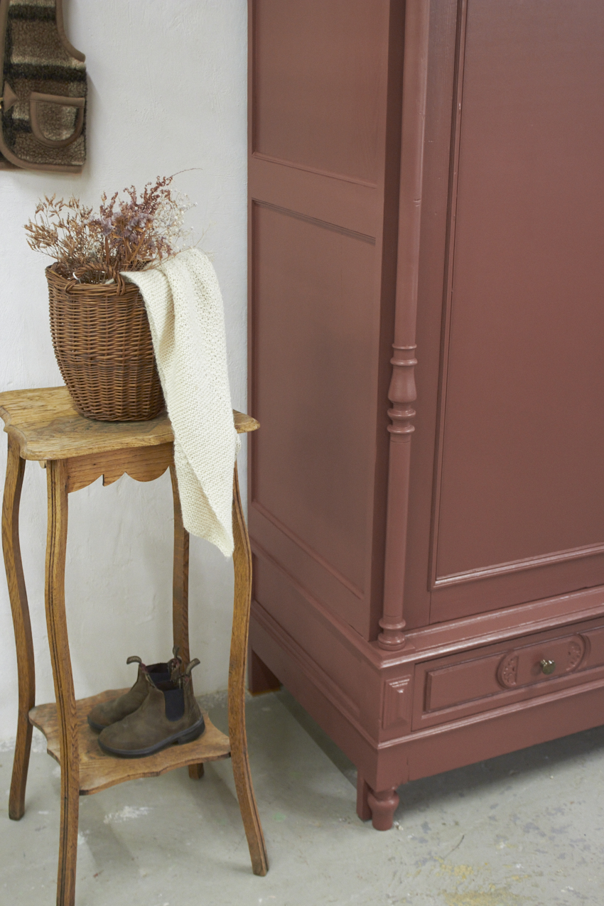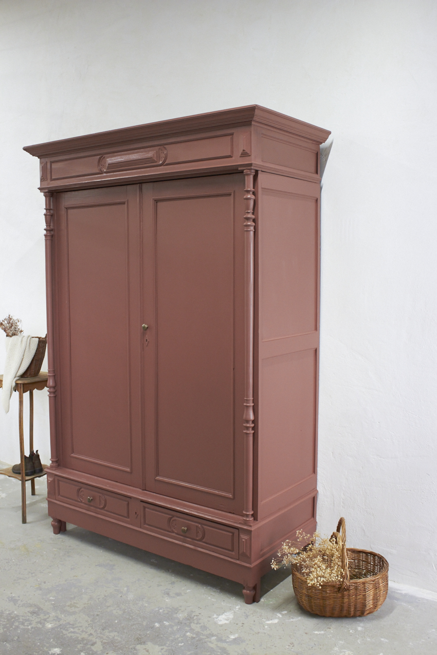 Deze vintage demontabele kledingkast is geschilderd in onze eigen kleur Karmozijn, een tint waar we elke keer weer blij van worden. Dit type kast hebben we vaker in huis; stuk voor stuk uniek, met hun eigen karakter. Dit exemplaar heeft het perfecte formaat voor een kinderkamer. De kast is heerlijk diep, waardoor je verrassend veel kleding kunt opbergen. Praktisch én mooi.