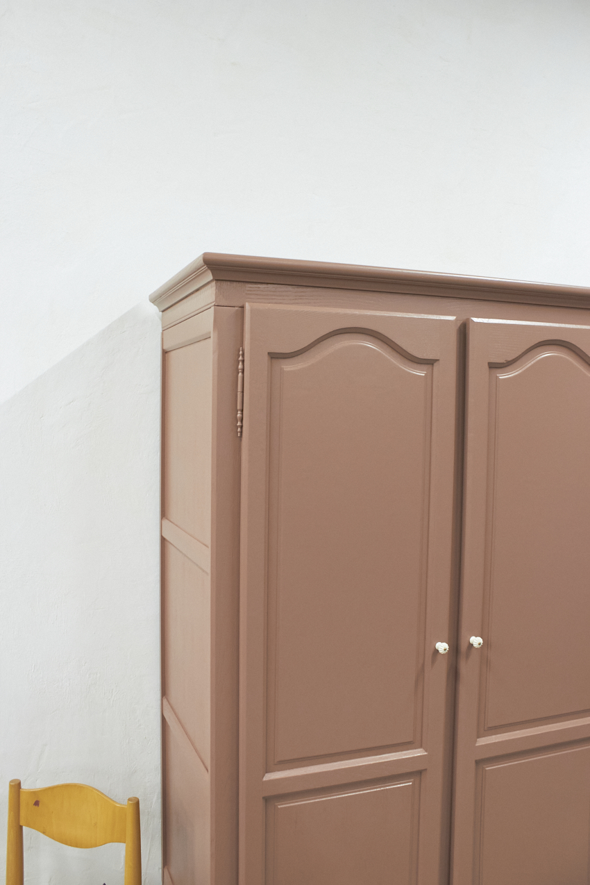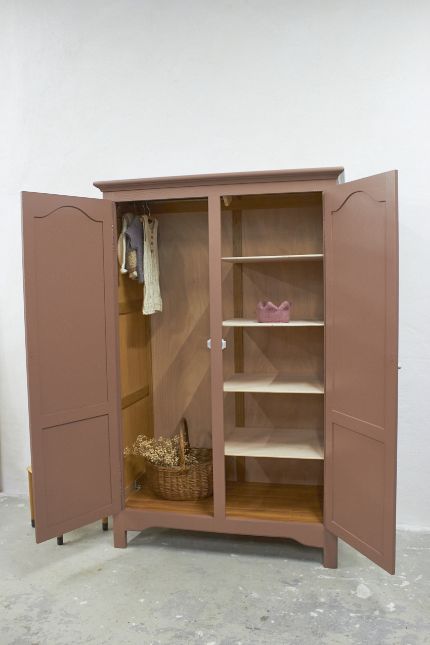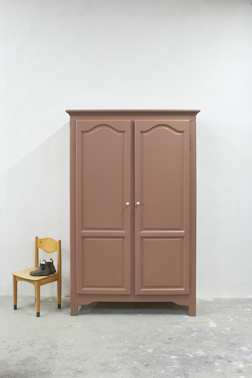 Deze vintage demontabele kledingkast is uitgevoerd in onze eigen kleur Vijg, een tint waar we elke keer weer blij van worden. Dit type kast hebben we vaker in huis; stuk voor stuk uniek, met hun eigen karakter. Dit exemplaar heeft het perfecte formaat voor een kinderkamer. De kast is heerlijk diep, waardoor je verrassend veel kleding kunt opbergen. Praktisch én mooi. En je kan bovenop een mooie lamp of riete manden plaatsen.