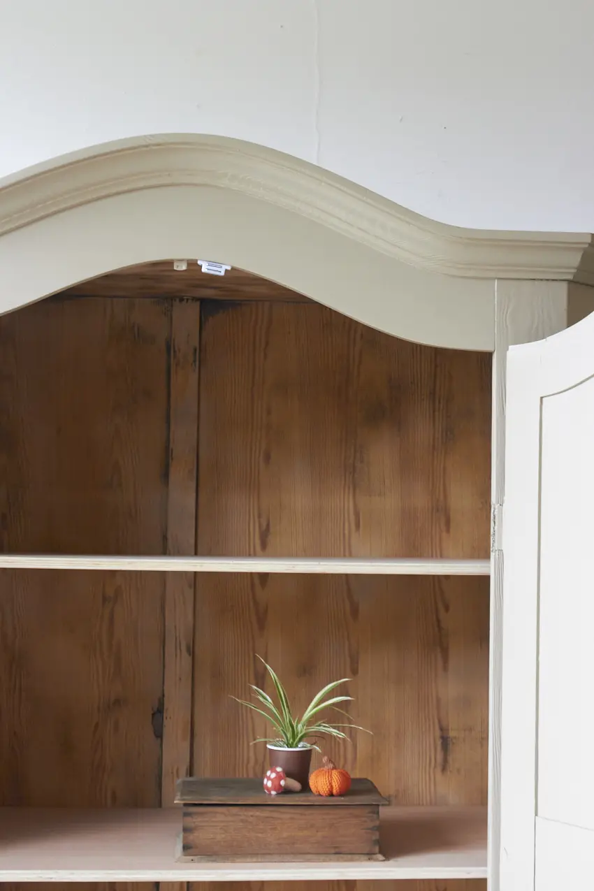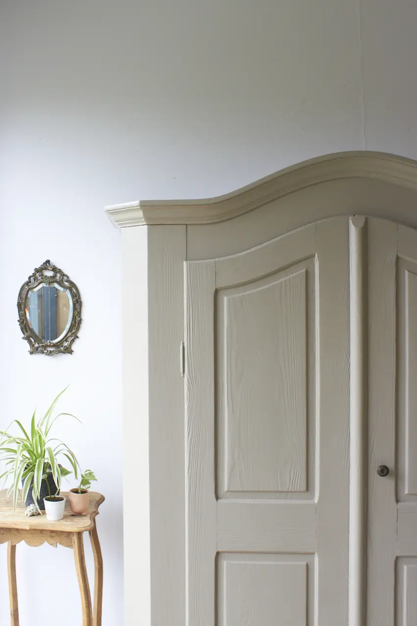 Als zwart geverfde kast kwam deze bij ons binnen. Zowel de binnen als de buitenkant en de pershouten planken waren met dikke lagen krijtverf geschilderd. De Meubelstralers hebben deze van binnen en buiten voor ons gestraald. Na het stralen hebben we de kast grondig schoongemaakt en een anti-houtworm behandeling gegeven. De kast is daarna helemaal nagelopen en waar nodig gerepareerd en voorzien van drie nieuwe passende planken. De deuren waren verzakt en de scharnieren kapt. Inmiddels sluiten de deuren weer perfect. Na alle reparaties hebben we haar de kleur Amandel gegeven, wat de kast een rustige en stijlvolle look geeft. Amandel is daarbij heel fijn te combineren met andere kleuren waardoor deze perfect tot zijn recht komt bij jouw thuis!
