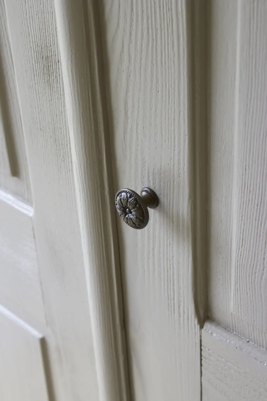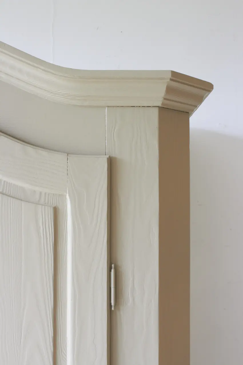 Deze klassieke houten tweedeurs kast hebben we onze kleur Amandel gegeven. De sierlijke vormen van de kast geven haar echt karakter. De ronding van de kroon met daarachter een plat dak, zodat je makkelijk ook wat bovenop de kast kunt zetten. Ook de hoeken zijn typerend voor dit meubel. De hoeken aan de voorkant van de kast zijn schuin, waardoor we ook de planken binnenin schuine randen hebben gegeven om deze precies passend te maken. Het is een prachtige kast voor op de kinderkamer. Maar ook als servieskast of kast in de woonkamer is deze perfect. Beide deuren kunnen open en achter de deuren is er genoeg opbergruimte om servies, speelgoed of kleding in op te bergen.