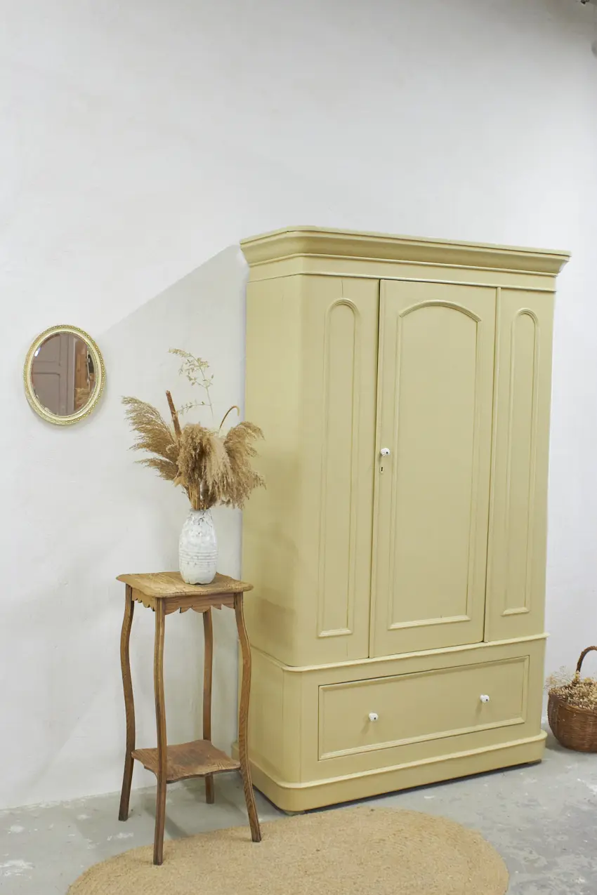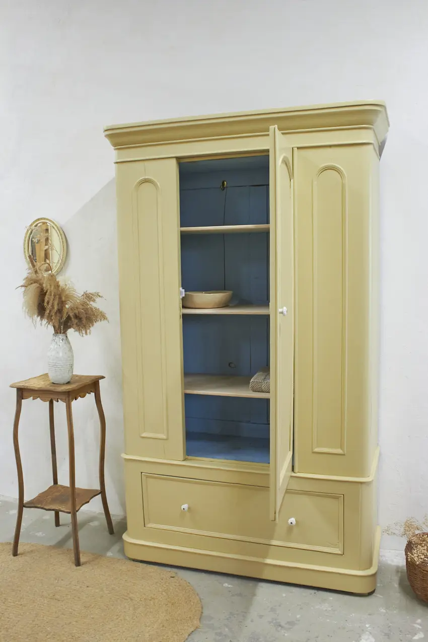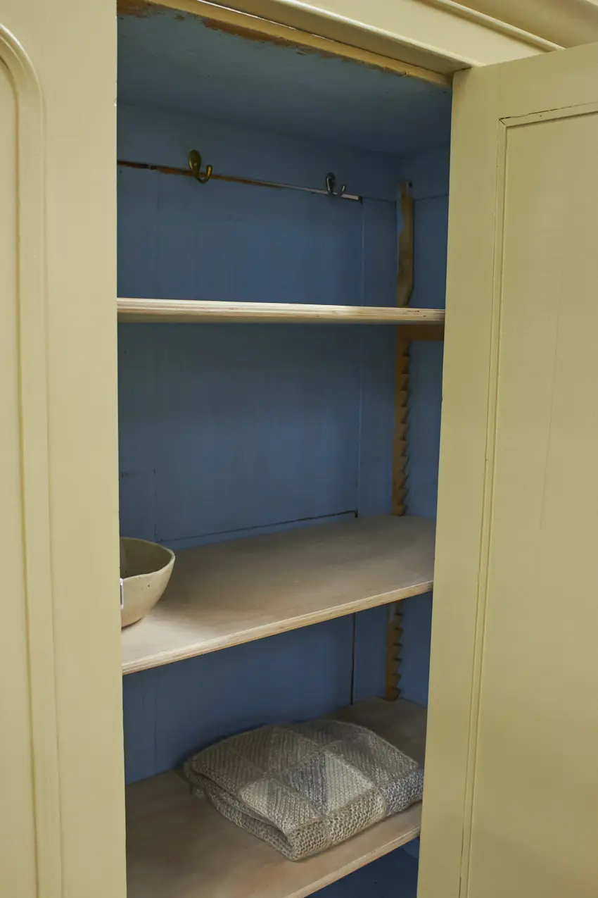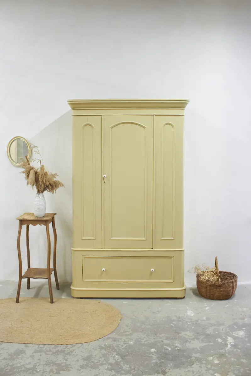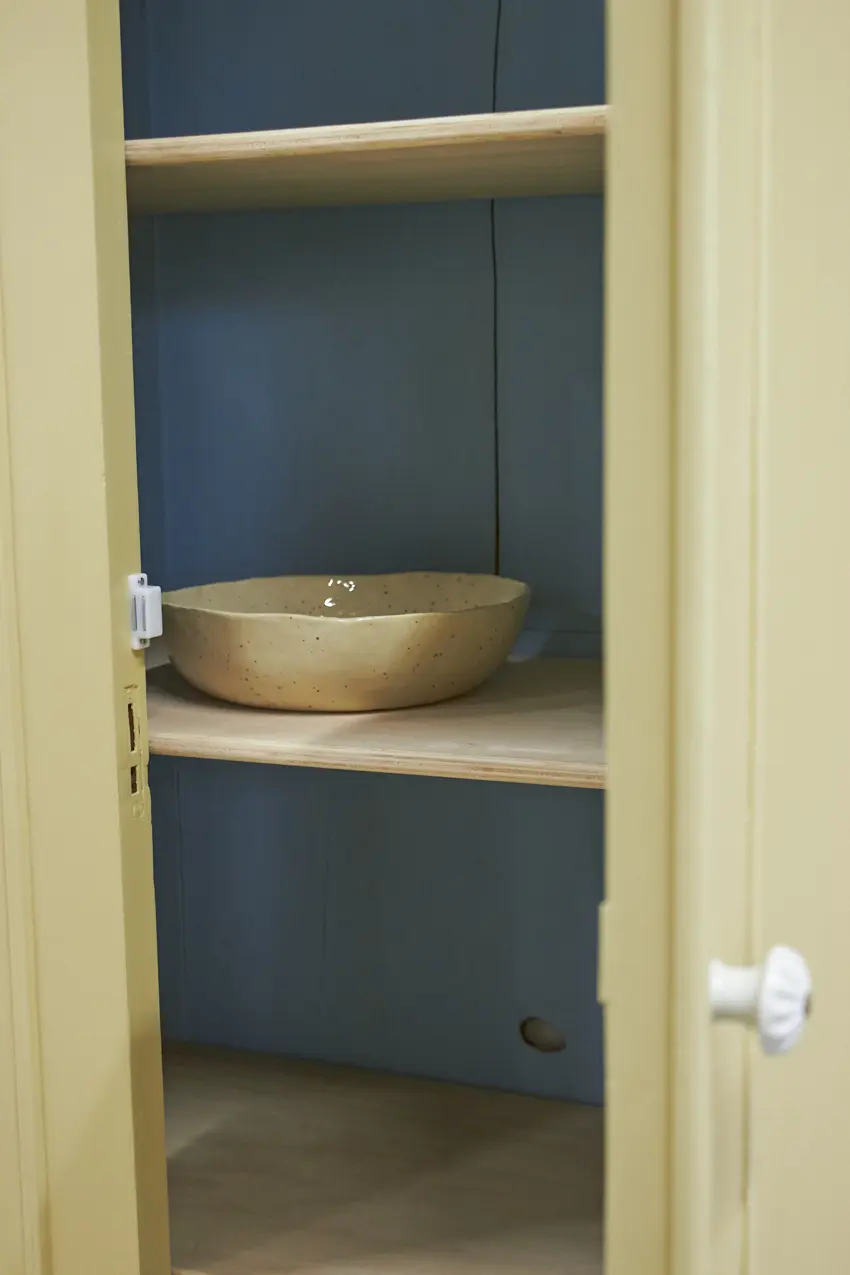 Wat een prachtige vintage kast in de kleur Kamille. De kast heeft er al een heel leven opzitten maar bij ons kreeg ze alle aandacht en liefde die ze verdient, en dat zie je terug. De kast is professioneel gezandstraald, grondig gereinigd en behandeld tegen houtworm. Vervolgens hebben we haar volledig nagelopen en waar nodig gerepareerd. Het resultaat: fris en prachtig meubel dat weer jarenlang mee kan. De kast heeft 1 deur en 3 legplanken, die in hoogte verstelbaar zijn. De planken zijn nieuw op maat gemaakt en de deur sluit met een magneetje. Ook is er nog een grote lade die open kan dus er is veel opbergruimte.