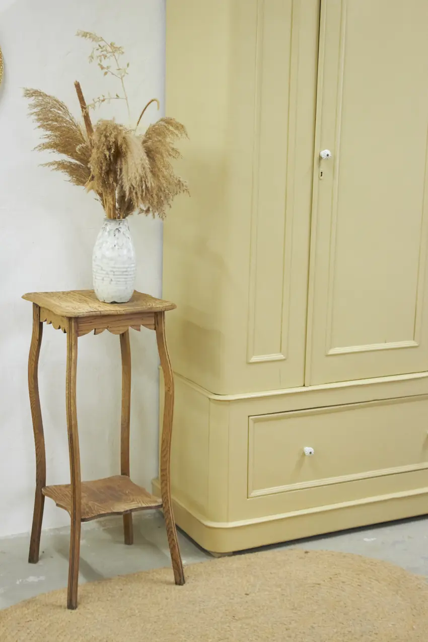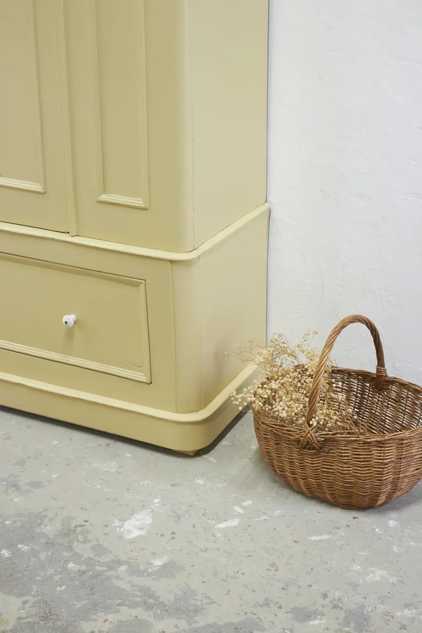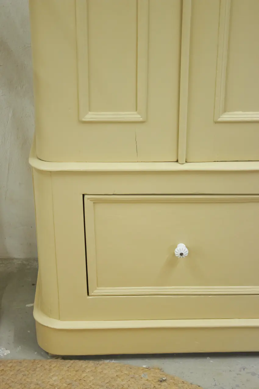 En dan geschilderd in onze kleur Kamille. Kamille is een van onze nieuwste kleuren. Het is een zachte, lichtgele tint met een vleugje grijs en een vleugje groen. Deze kleur geeft ieder meubel karakter. Wat zijn we blij met het resultaat!