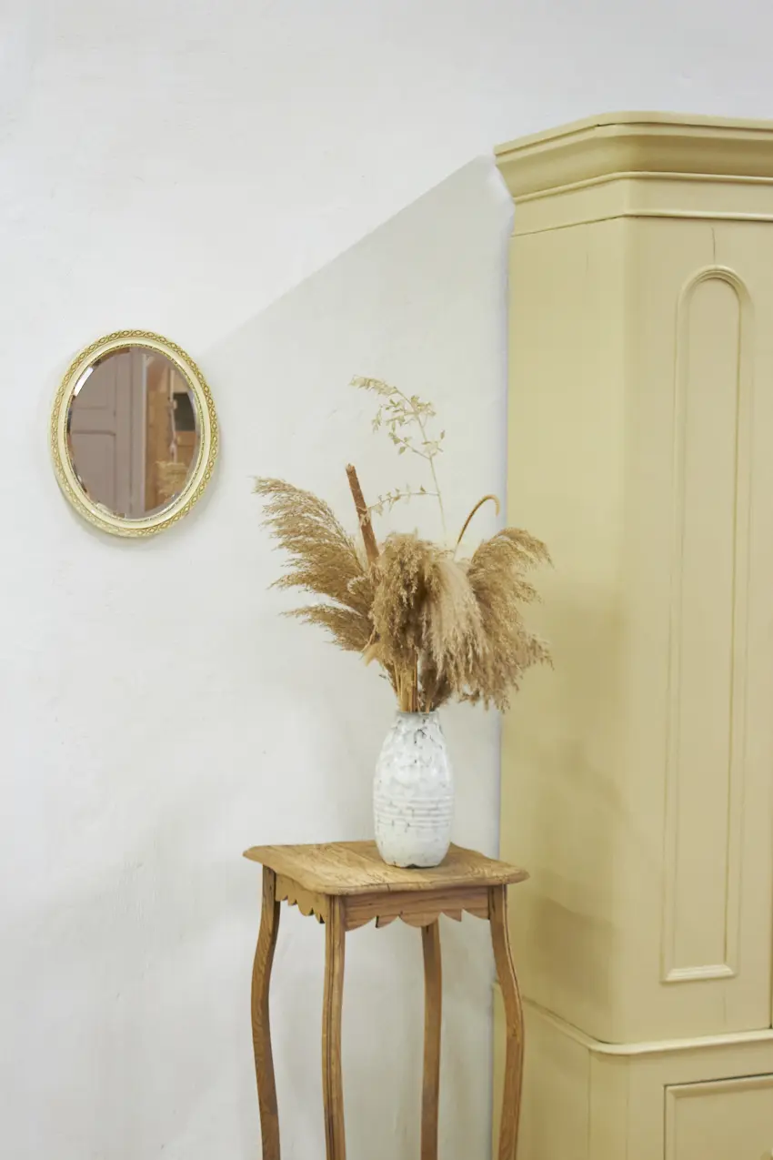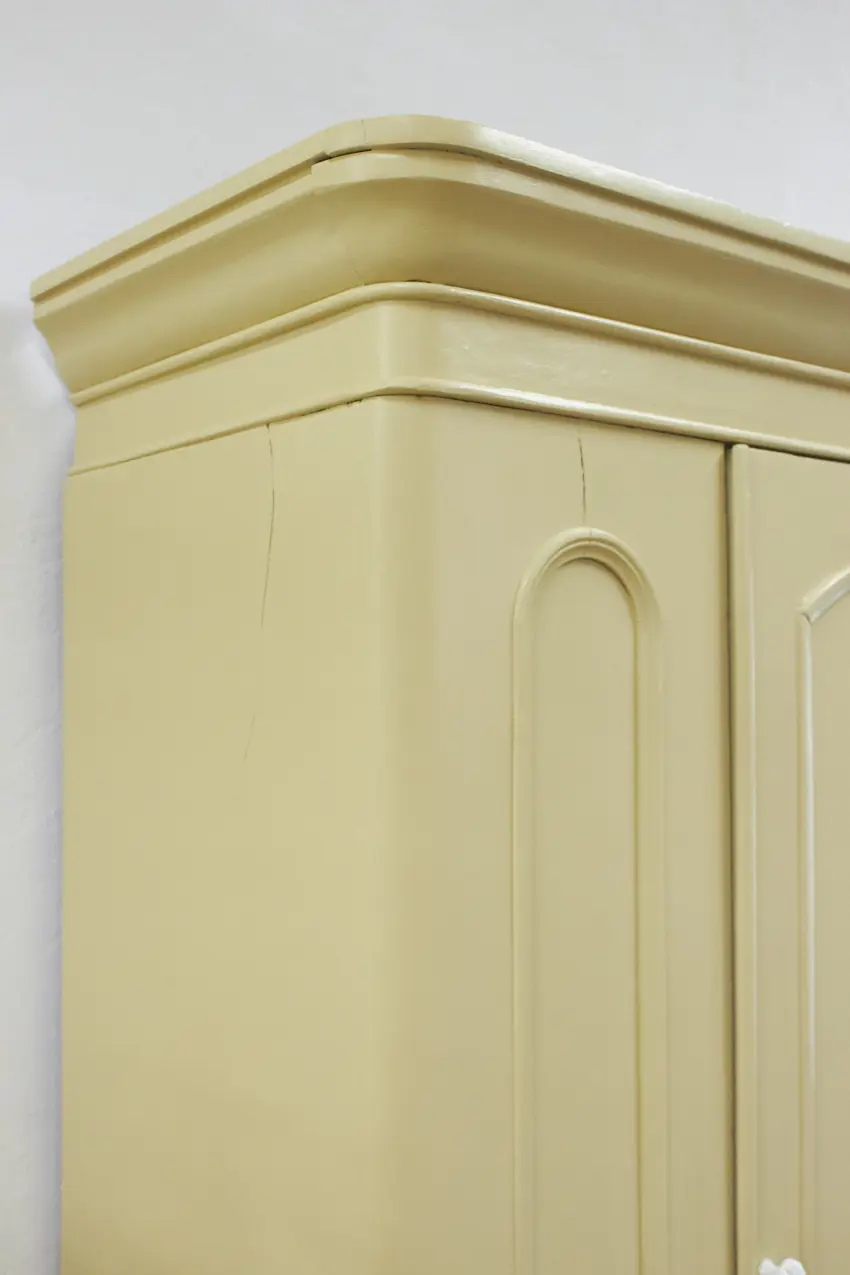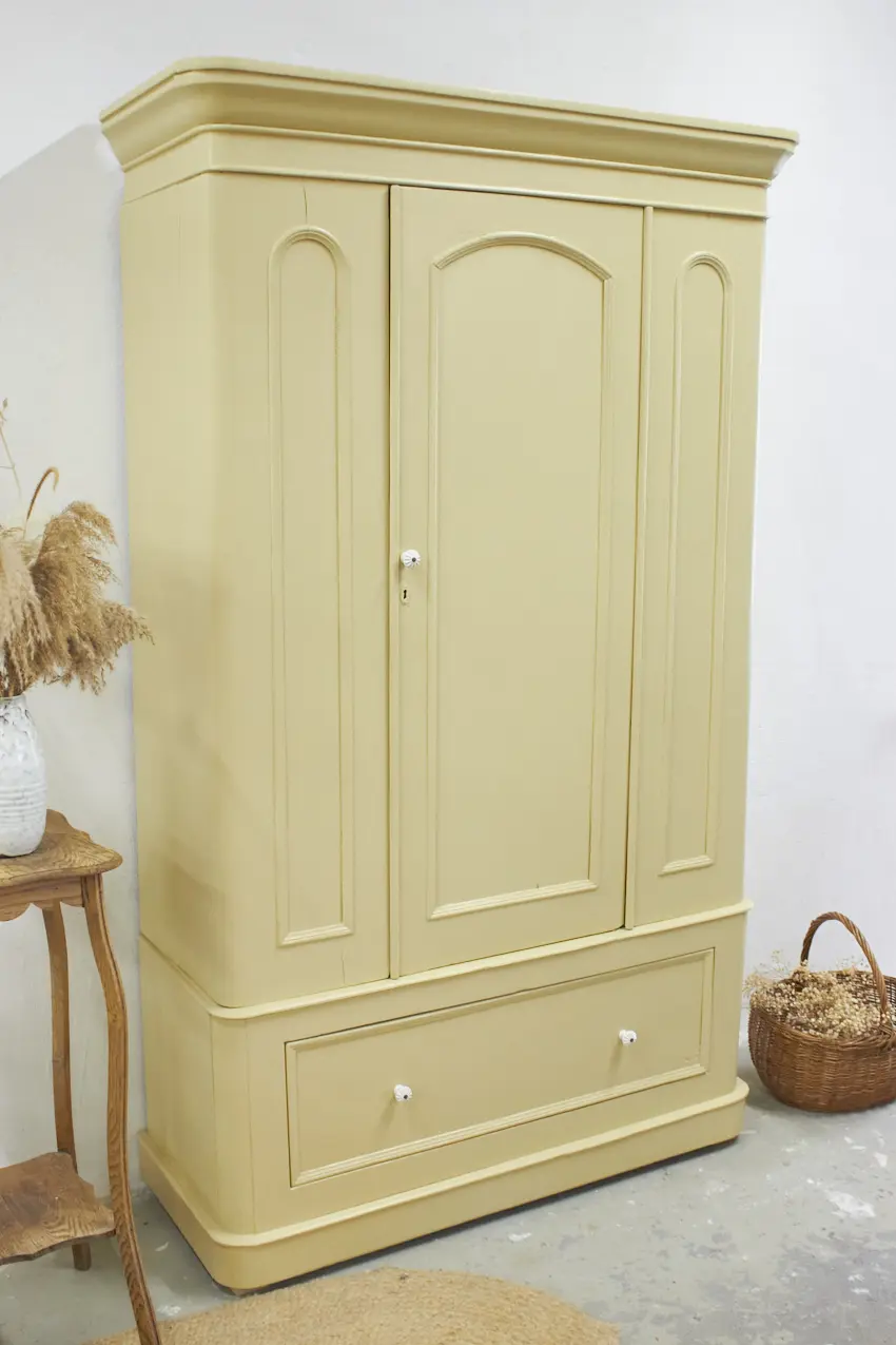 En dan geschilderd in onze kleur Kamille. Kamille is een van onze nieuwste kleuren. Het is een zachte, lichtgele tint met een vleugje grijs en een vleugje groen. Deze kleur geeft ieder meubel karakter. Wat zijn we blij met het resultaat!