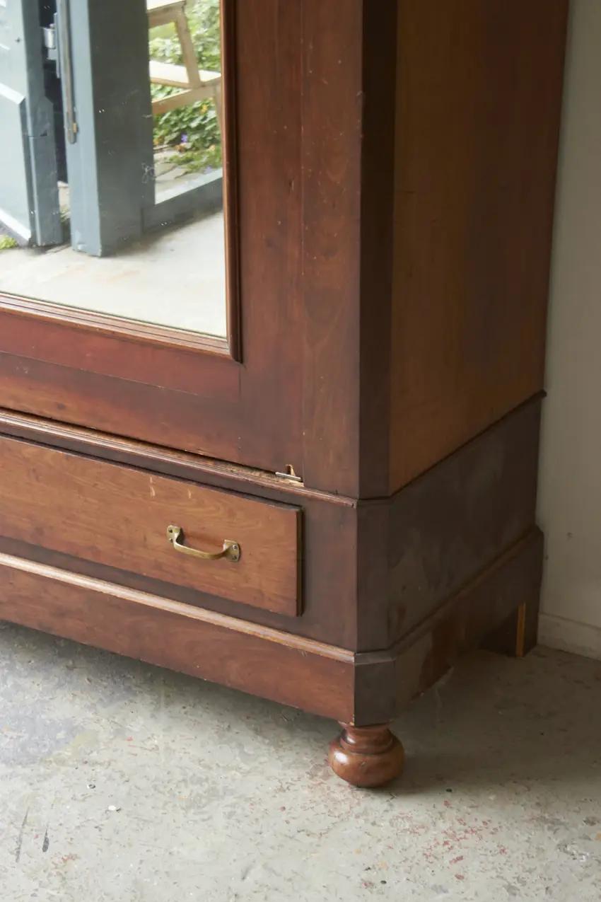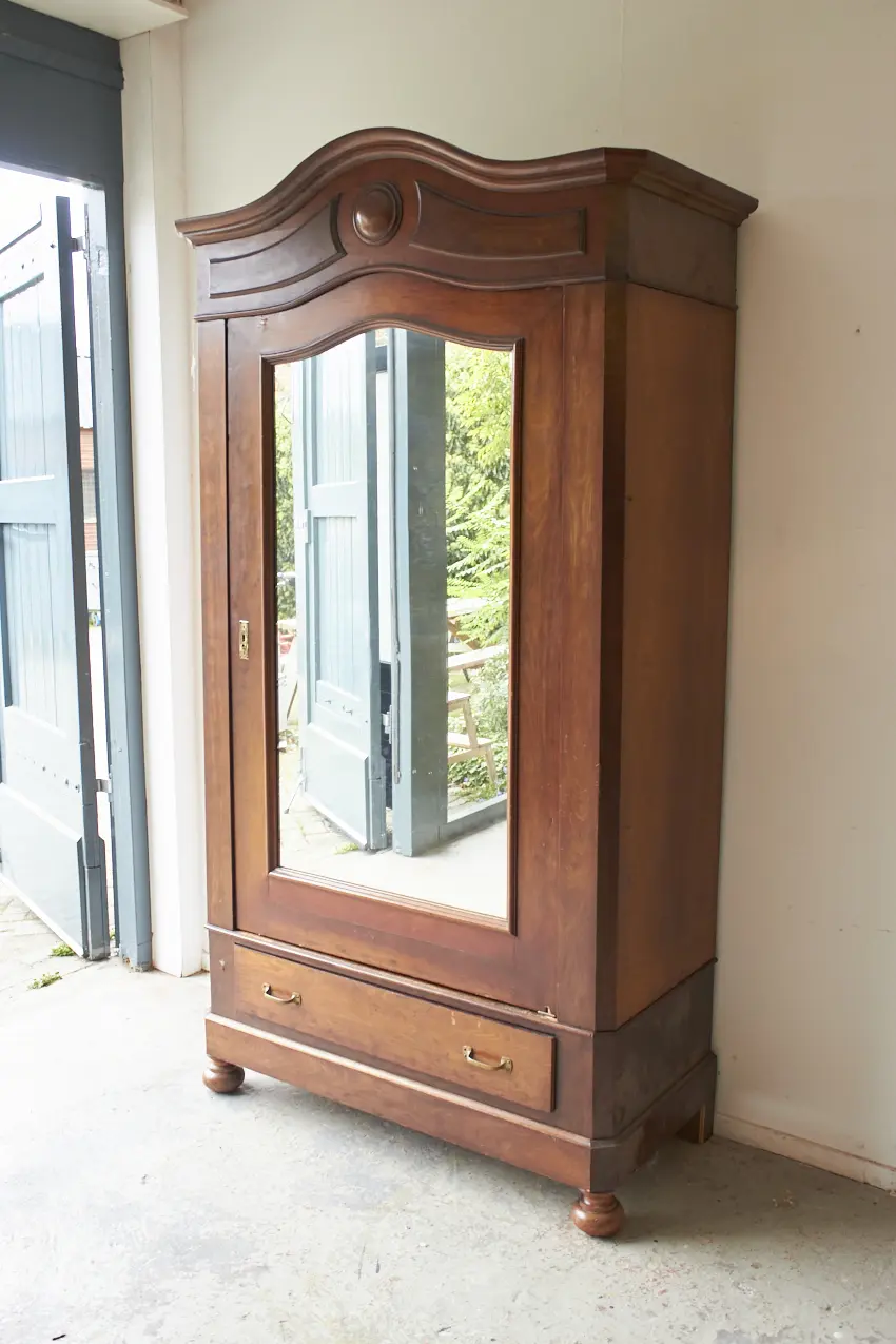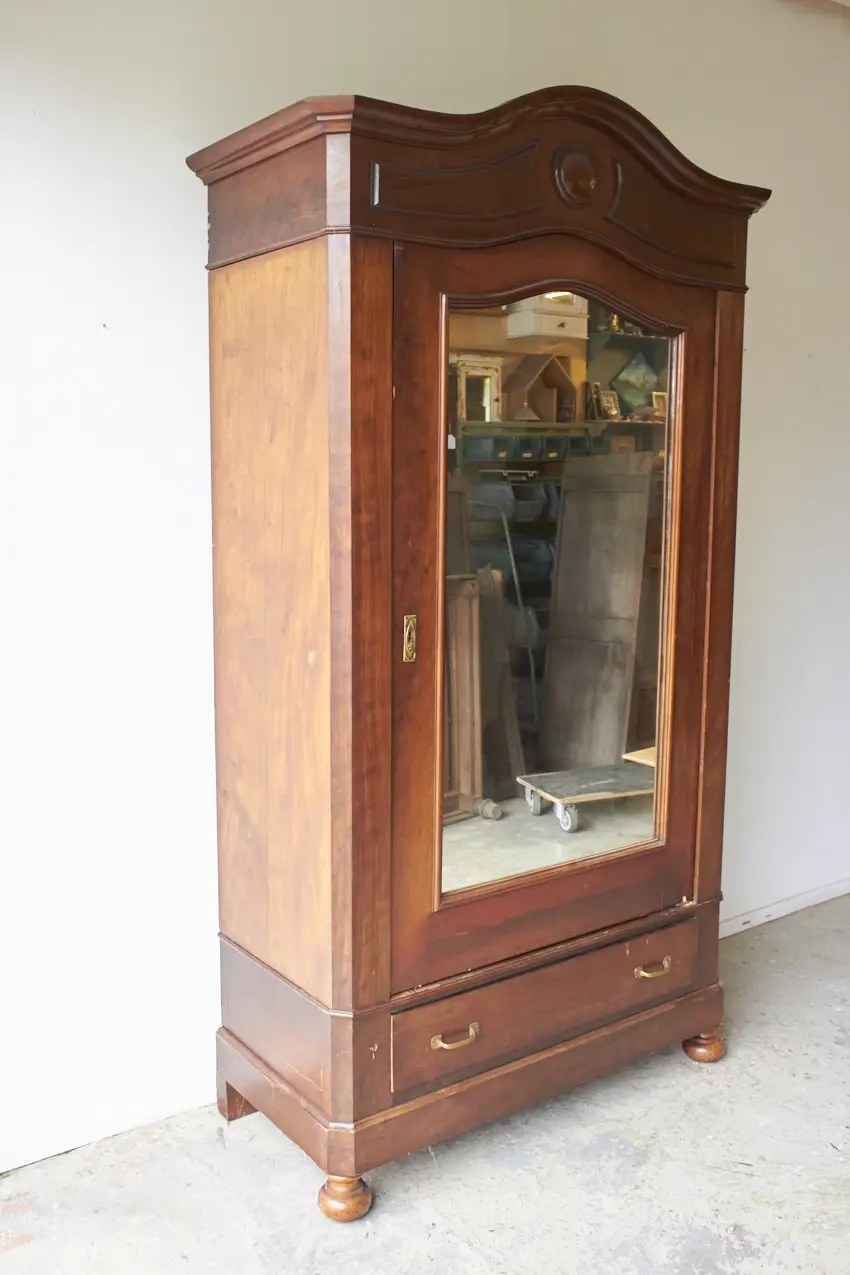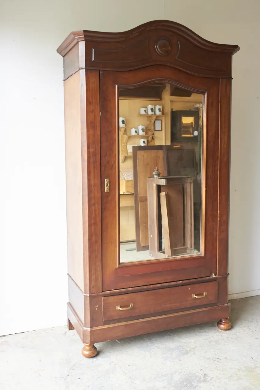 Wat een prachtig meubel! Met een vintage spiegel is dit een perfecte kledingkast voor op de slaapkamer of voor in de hal. We kunnen niet wachten om dit meubel op te knappen. De spiegel kan eventueel vervangen worden voor hout, zodat het een stijlvolle paneeldeur wordt.