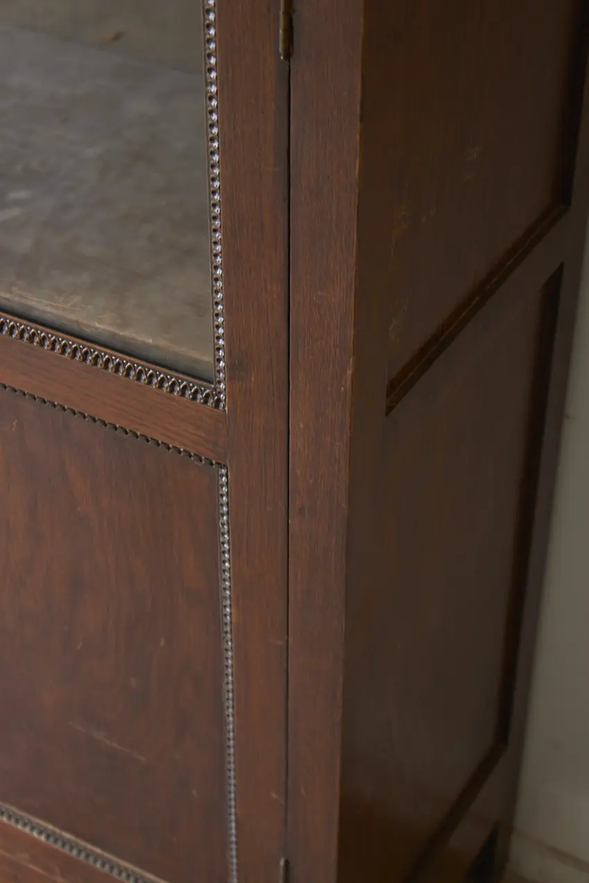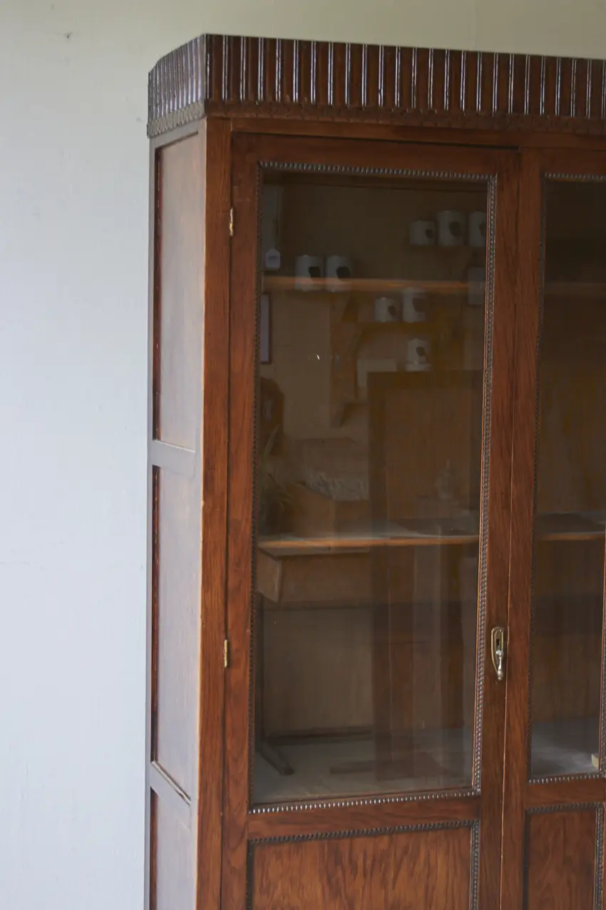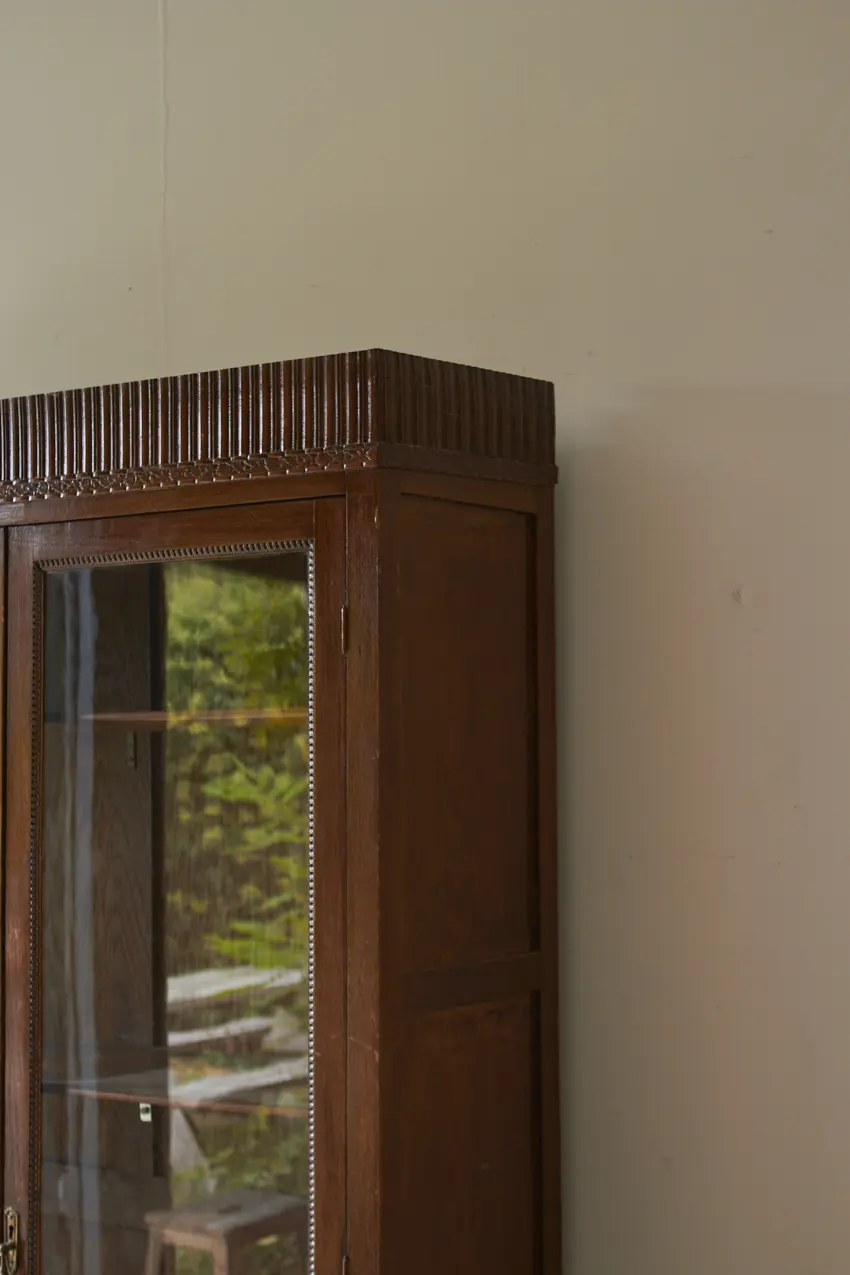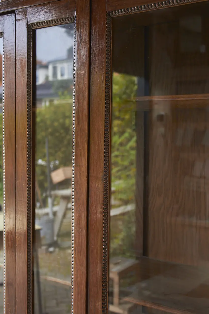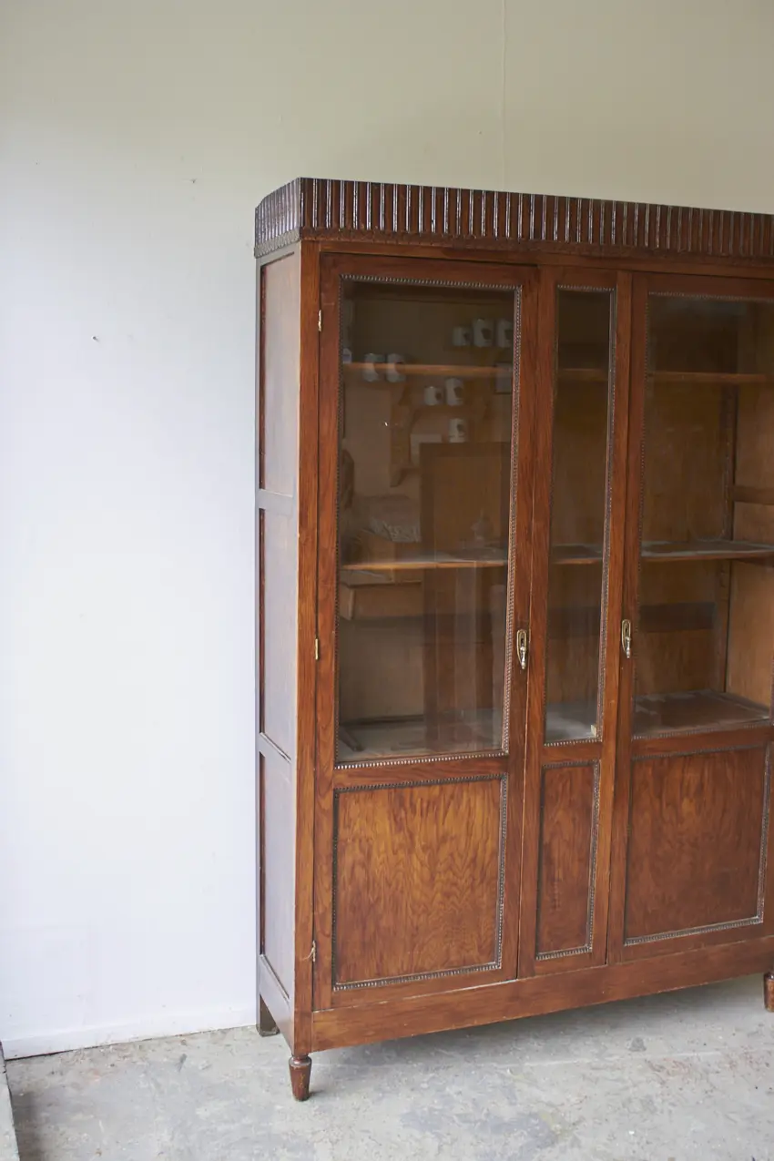 10937 prachtige ondiepe vitrinekast met houten sierwerk