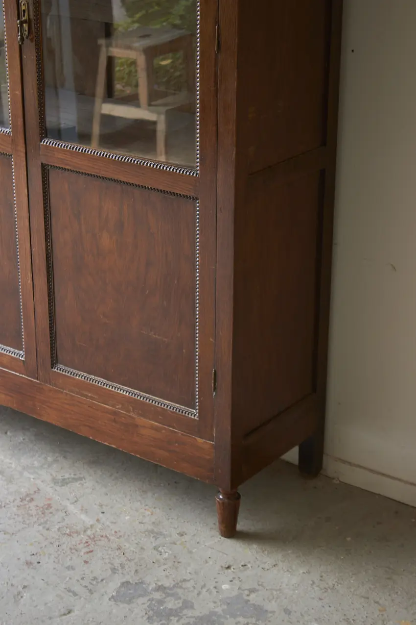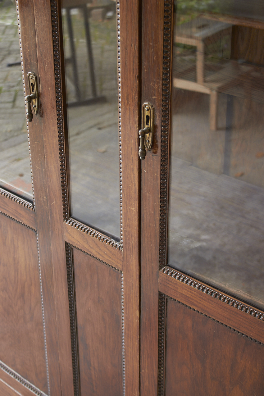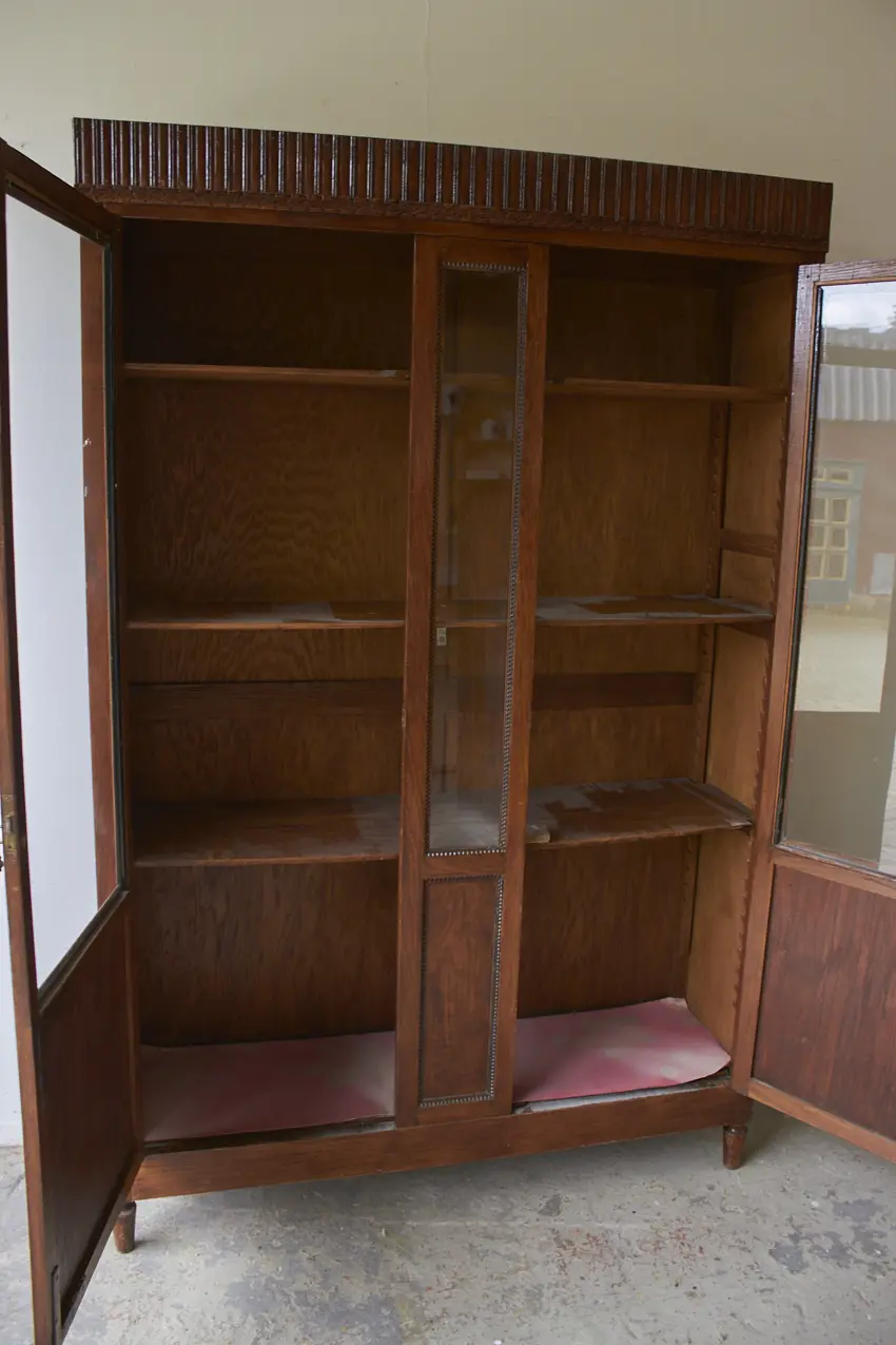 Wat een prachtige vitrinekast! En die houten sierlijsten! Deze kast is perfect om mooi servies, boeken of andere schatten in uit te stallen. Met zijn 37 cm diep is het een kast die tegen elk stuk kale muur past. Twee deuren en een tussenstuk met ook een glazen paneeltje, wauw. Deze kast is helemaal naar jouw wens op te knappen en samen te stellen. We kunnen eventueel het glas vervangen voor houten panelen.