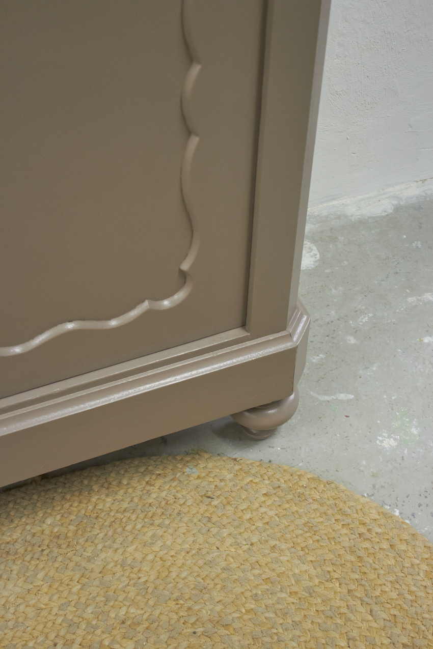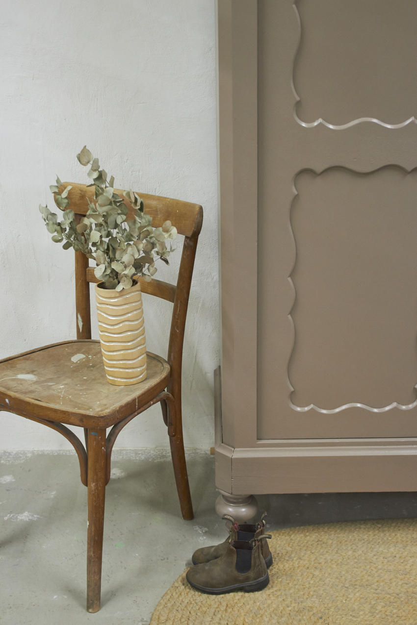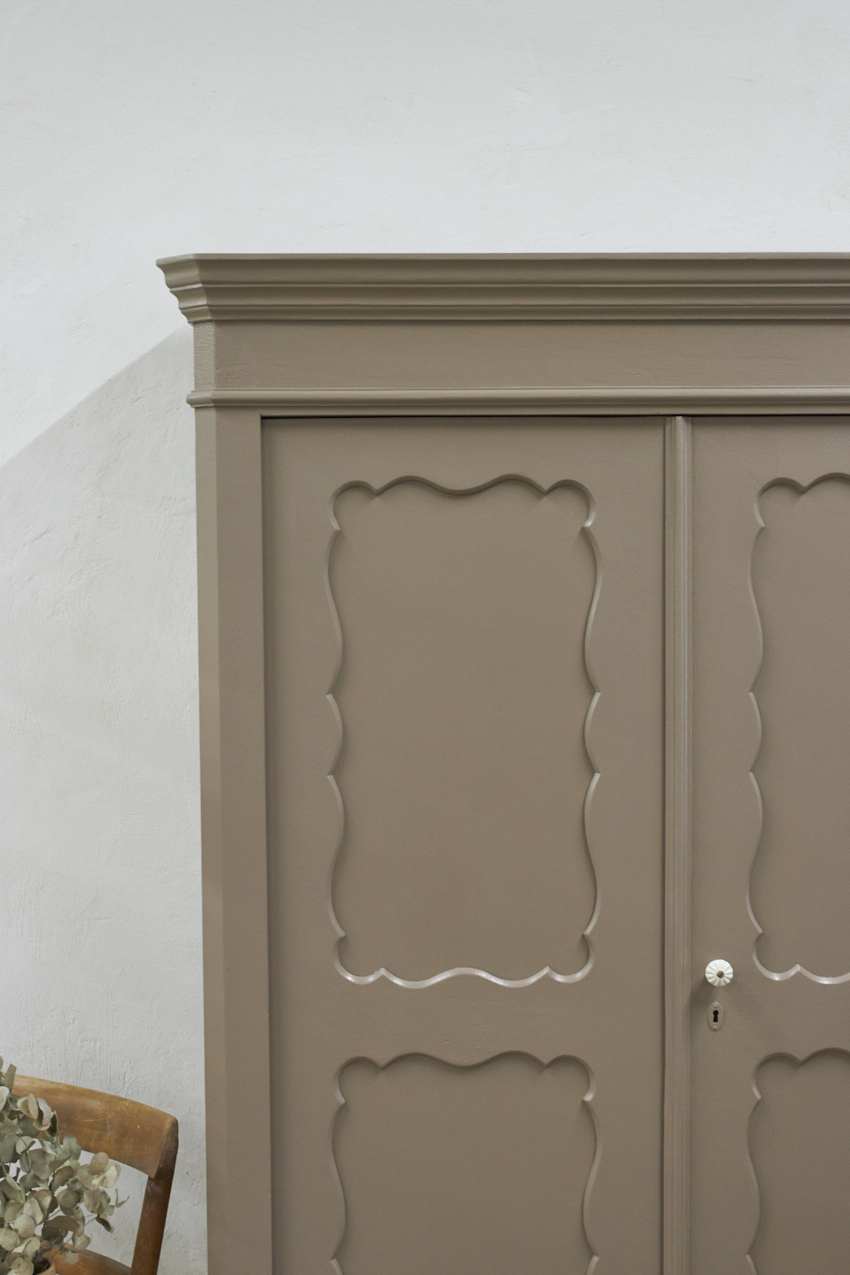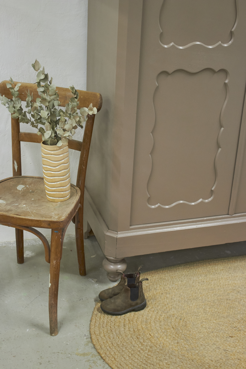 Toen de kast terugkwam van de zandstralers hebben we het meubel grondig schoongemaakt. Ook hebben we haar een anti-houtworm behandeling gegeven. De kast is daarna helemaal nagelopen en waar nodig gerepareerd. Daarna hebben we gekozen voor onze fijne kleur Hazel. Hazel is een mooie mix van roze en beige, bij ochtendlicht ook zeker een tintje paars. De kleur werkt echt perfect op een meubel, zeker in combinatie met de porseleinen knop. Deze kleur deed ons denken aan een hazelnoot, vandaar de naam Hazel. Een hele fijne zachte kleur, niet te zoet en ook niet te saai.