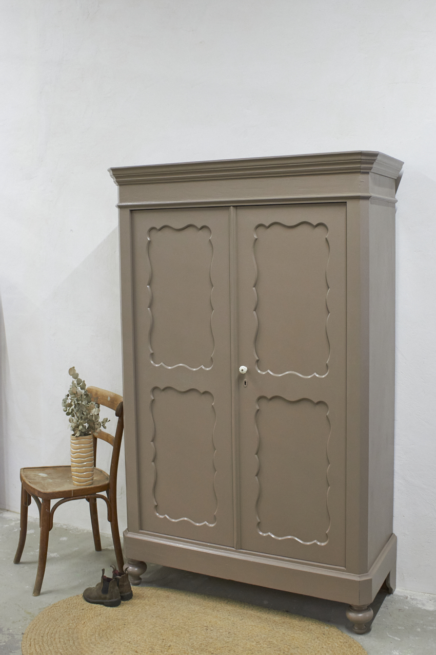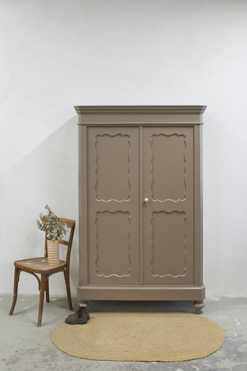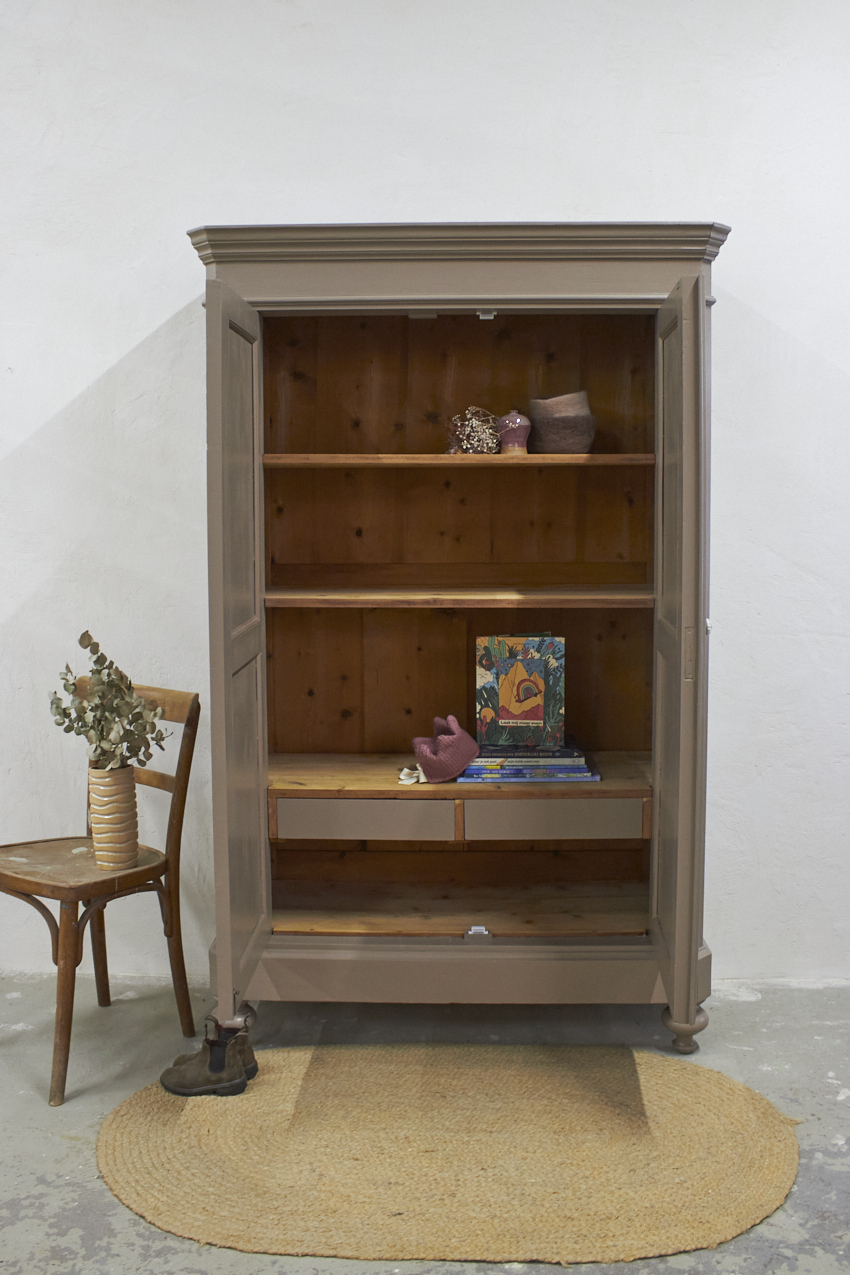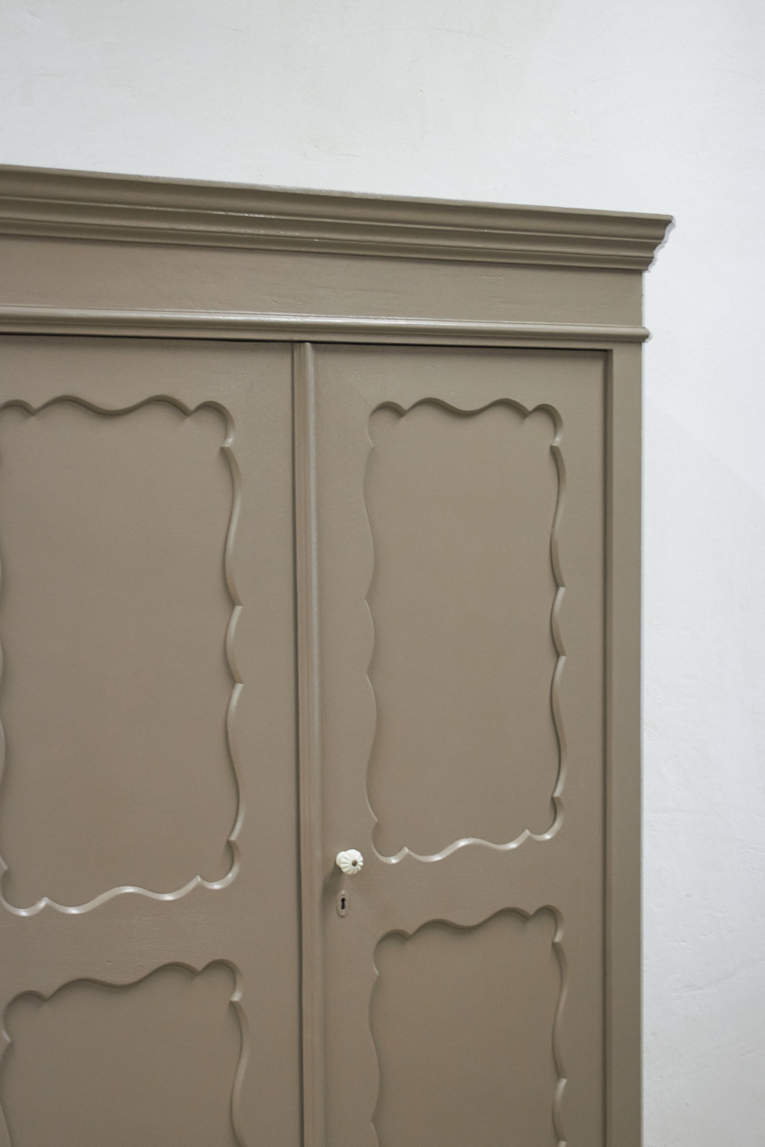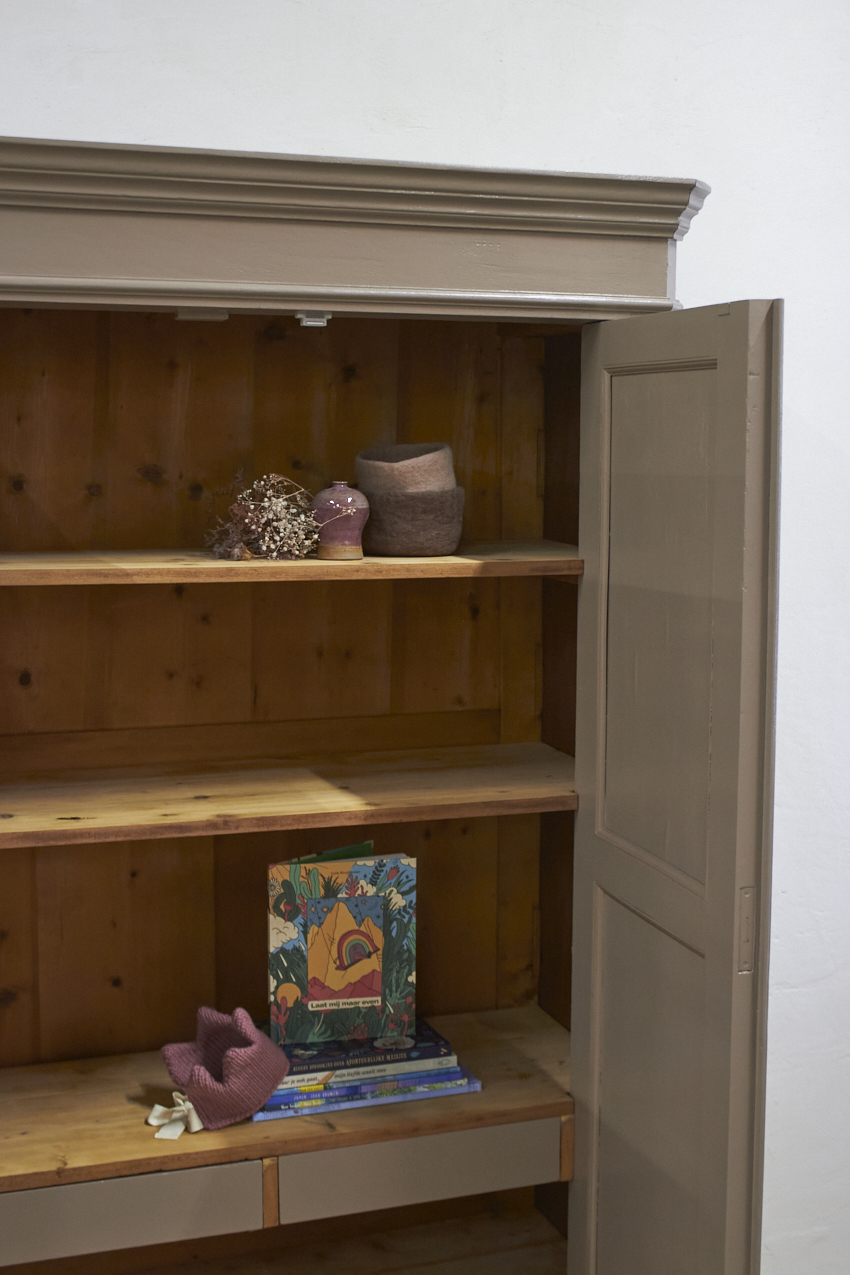 Toen de kast terugkwam van de zandstralers hebben we het meubel grondig schoongemaakt. Ook hebben we haar een anti-houtworm behandeling gegeven. De kast is daarna helemaal nagelopen en waar nodig gerepareerd. Daarna hebben we gekozen voor onze fijne kleur Hazel. Hazel is een mooie mix van roze en beige, bij ochtendlicht ook zeker een tintje paars. De kleur werkt echt perfect op een meubel, zeker in combinatie met de porseleinen knop. Deze kleur deed ons denken aan een hazelnoot, vandaar de naam Hazel. Een hele fijne zachte kleur, niet te zoet en ook niet te saai.