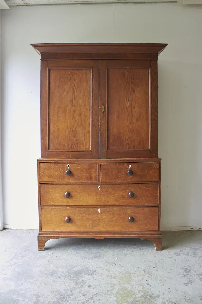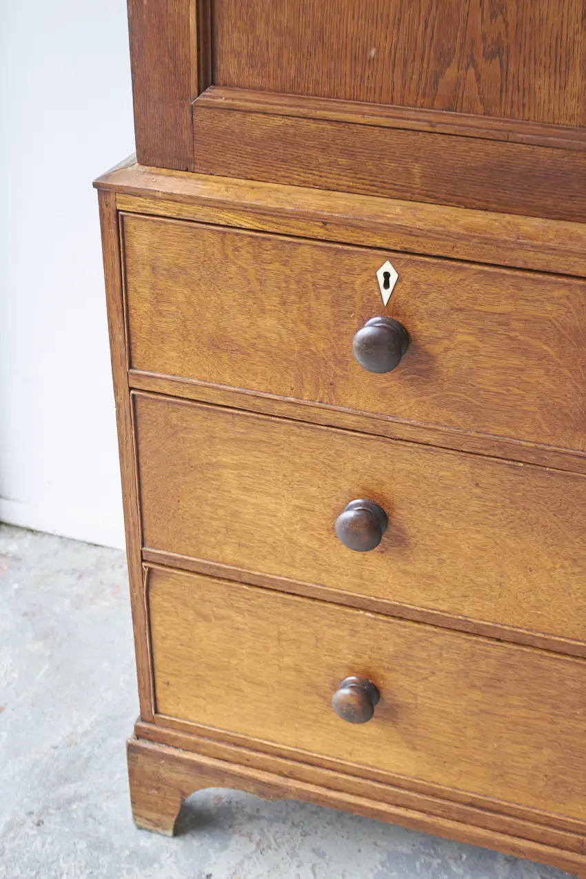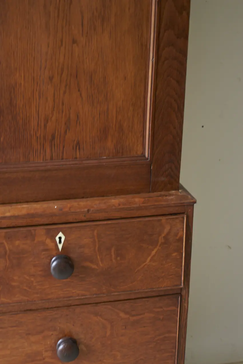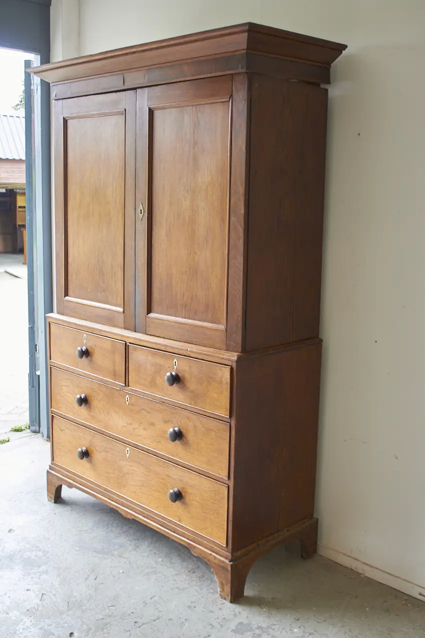 Deze unieke kast is tweedelig met zowel lades als paneeldeuren. Wat een mooie, massief houten kast! Dit soort kasten zien we niet vaak. Deze tweedelige kast bestaat uit een stevige ladekast met brede diepe lades. Daar bovenop staat het tweedeurs gedeelte met twee strakke paneeldeuren. Met een subtiele sierlijke afwerking van de poten en een prachtige strakke kroon. Statig en speels. De perfecte kast voor op de kinderkamer, woonkamer of speelkamer. Doordat de kast in twee delen is opgedeeld, is het een ideale kast met zoveel opbergmogelijkheden! Want ook qua indeling kunnen we deze kast op maat voor jou vorm geven. We denken hierin graag met je mee!