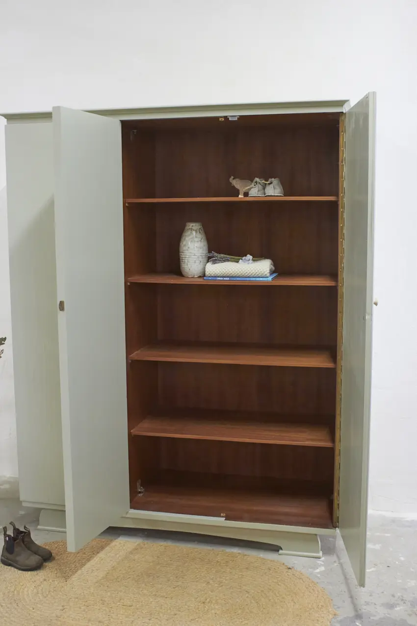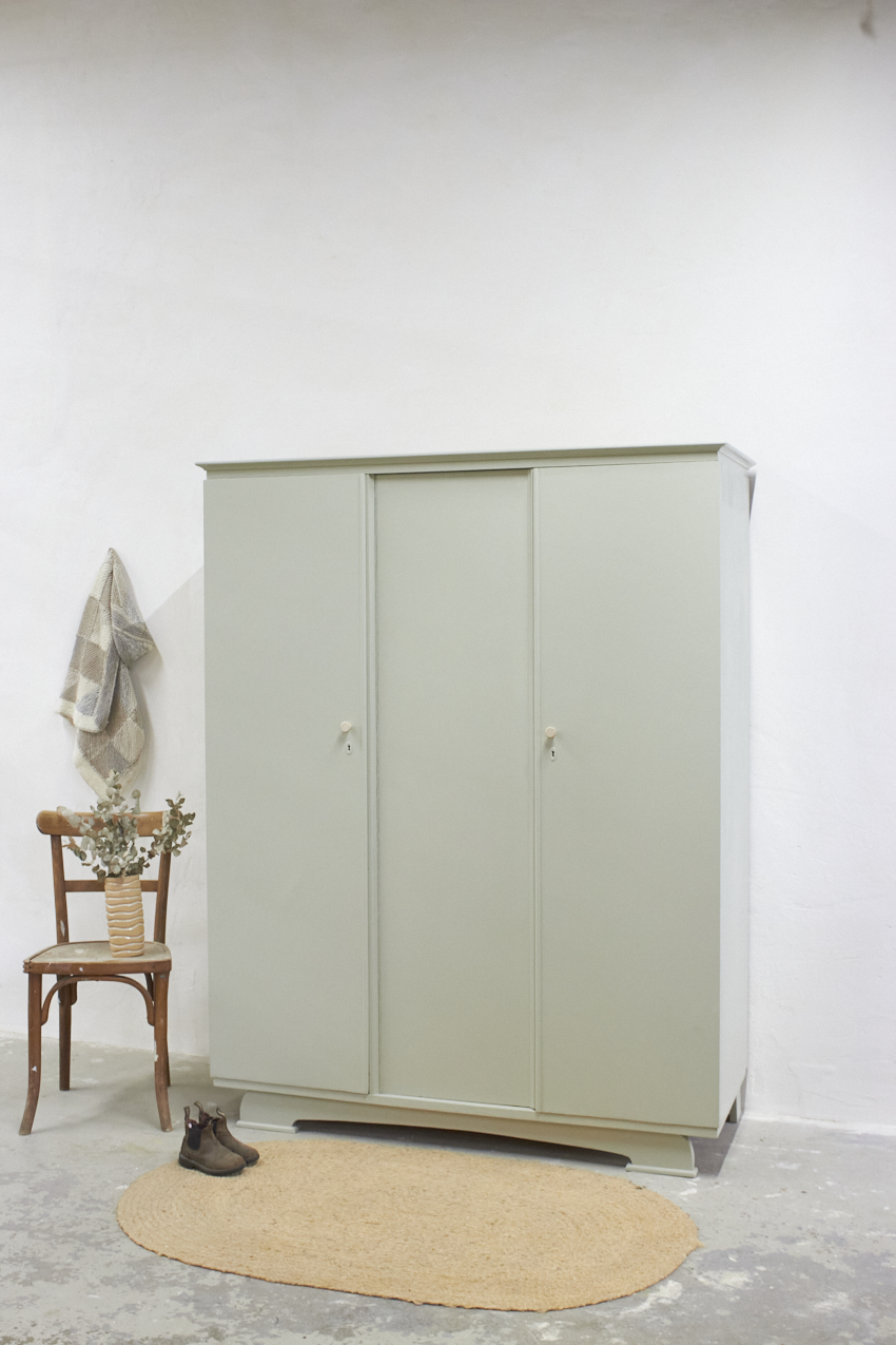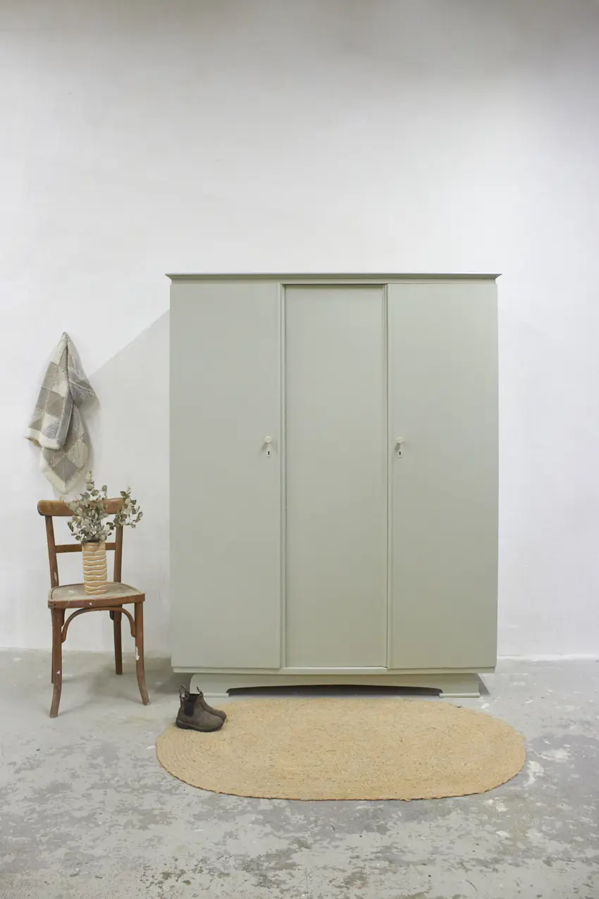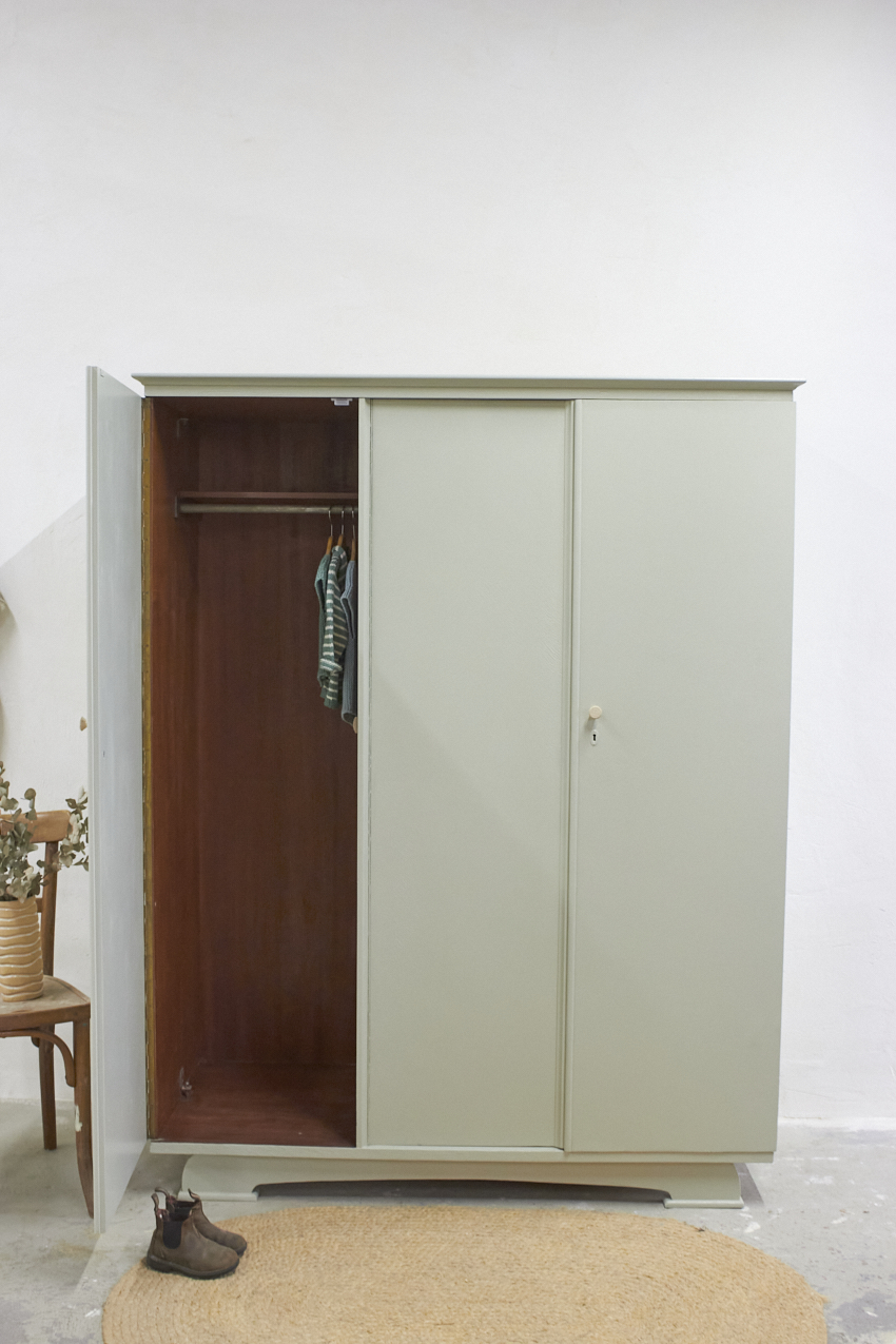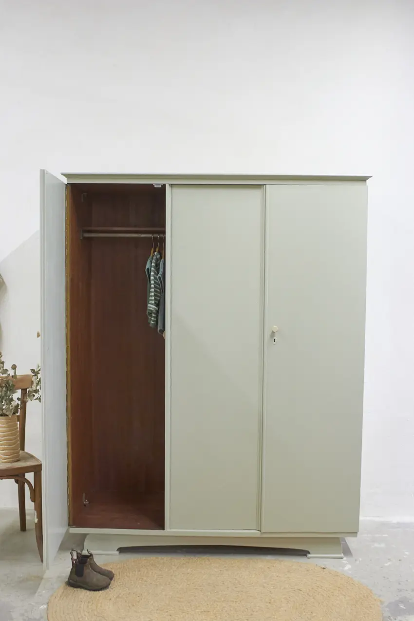 Wat een prachtige strakke vintage kledingkast. De kast heeft drie deuren en is ruim en stevig. Achter de drie deuren is er veel opbergruimte met 4 legplanken en een roede, hij is demontabel en kan daardoor makkelijk vervoerd worden. De pootjes, die in een boog aan de kast vast zit als één geheel en de strakke subtiele kroon. Allemaal details die deze kast zijn karakter geeft.