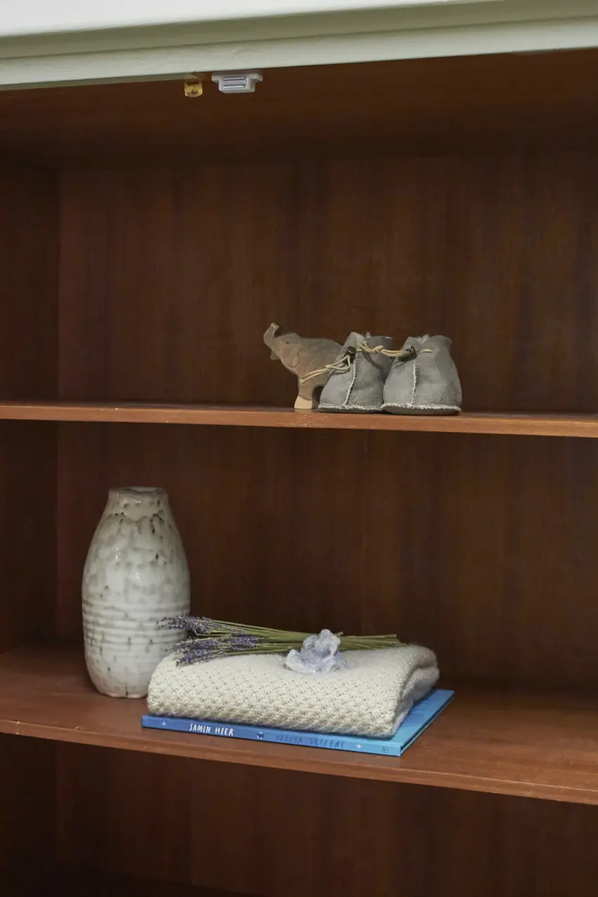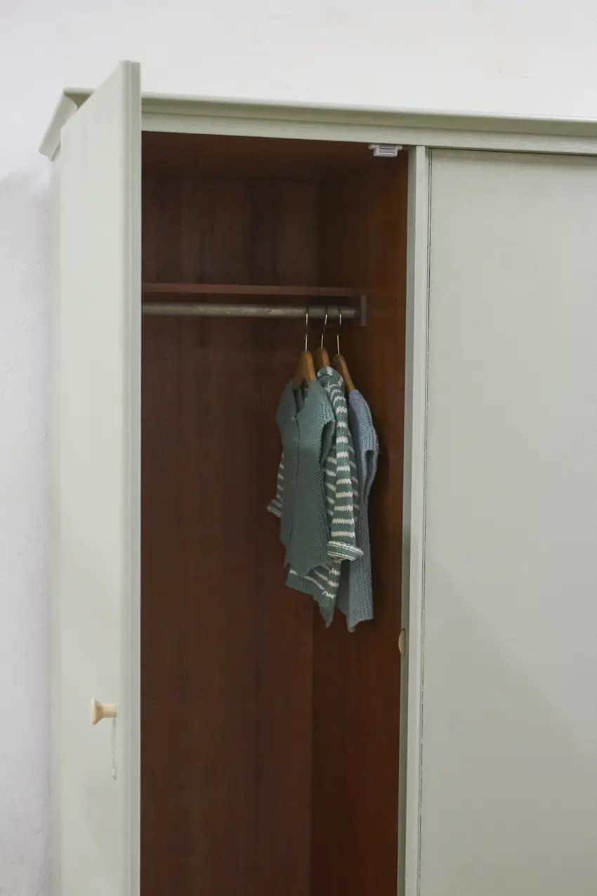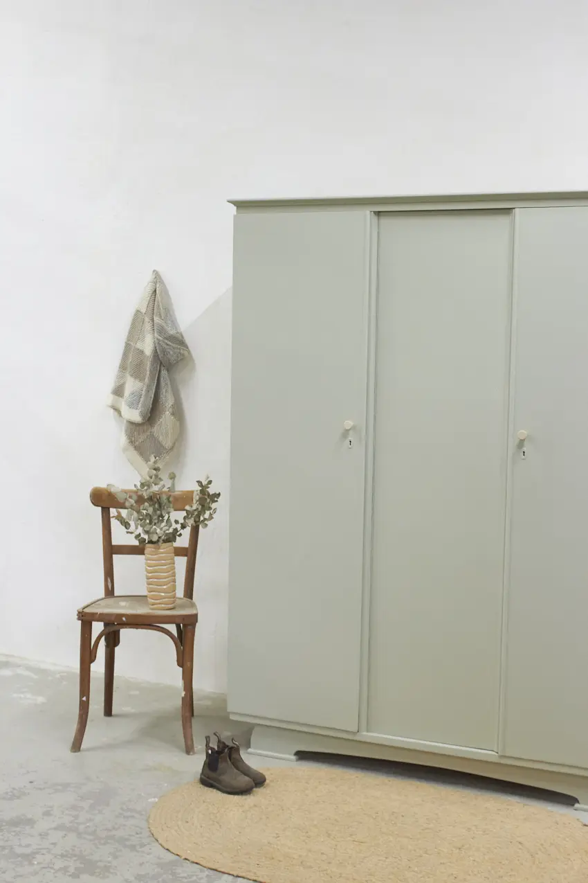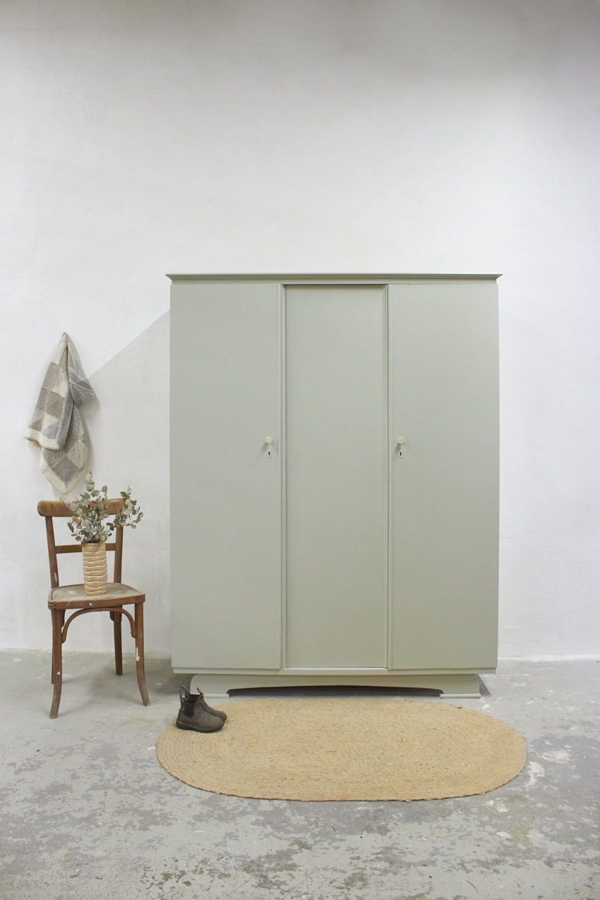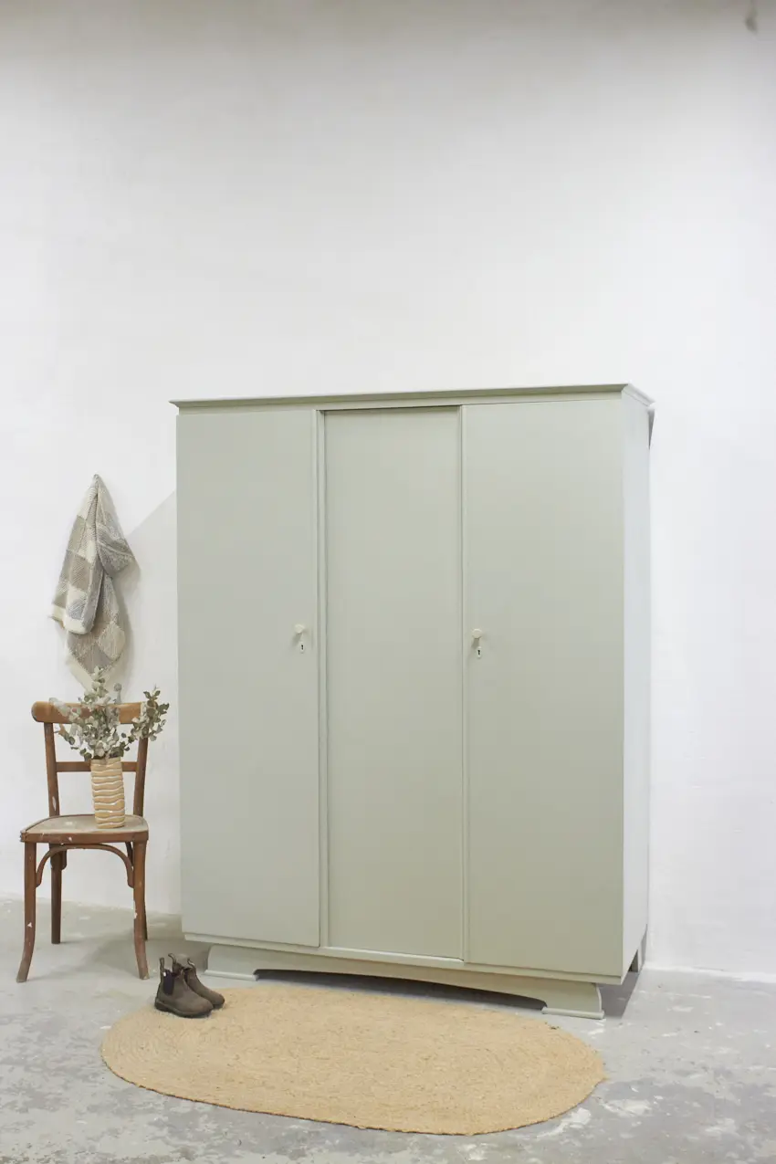 Wat een prachtige strakke vintage kledingkast. De kast heeft drie deuren en is ruim en stevig. Achter de drie deuren is er veel opbergruimte met 4 legplanken en een roede, hij is demontabel en kan daardoor makkelijk vervoerd worden. De pootjes, die in een boog aan de kast vast zit als één geheel en de strakke subtiele kroon. Allemaal details die deze kast zijn karakter geeft.