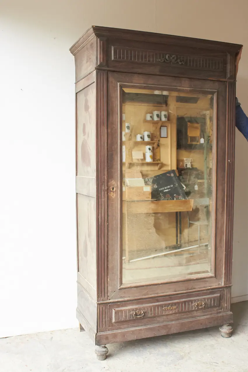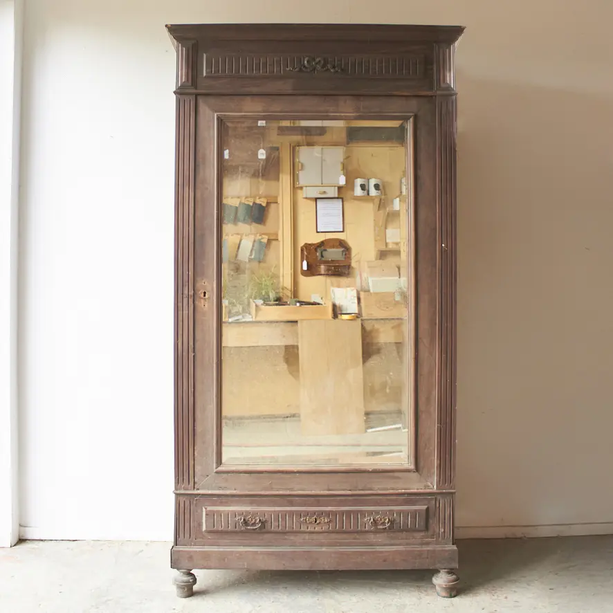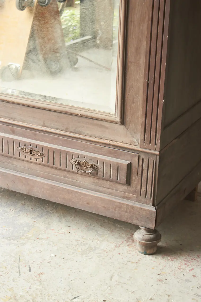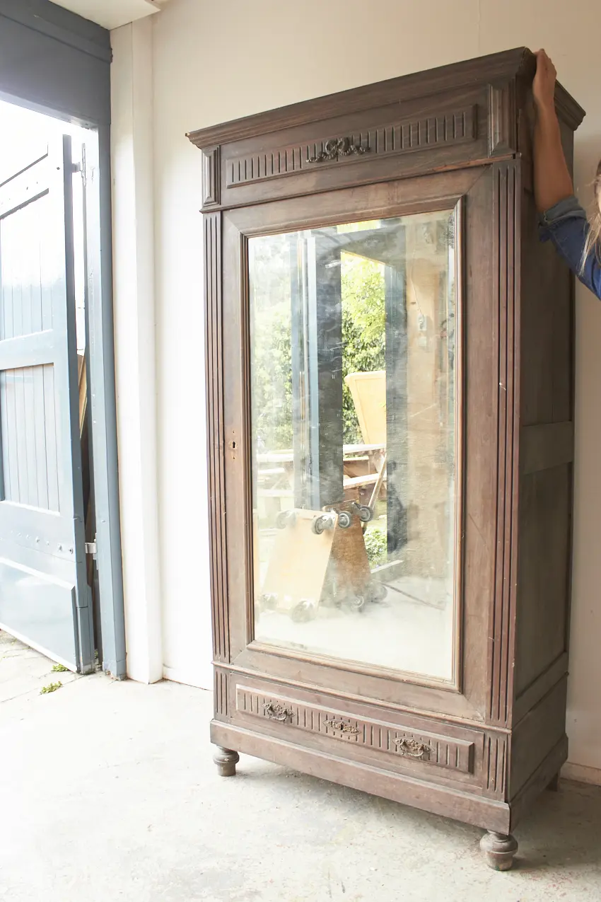 Wat een prachtig meubel! Met een geslepen vintage spiegel vol vlekjes is dit een perfecte kledingkast voor op de slaapkamer of voor in de hal. We kunnen niet wachten om dit meubel te schilderen. We kunnen ook de spiegel vervangen voor hout.