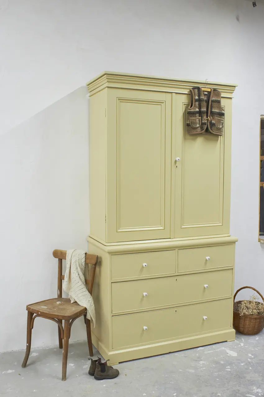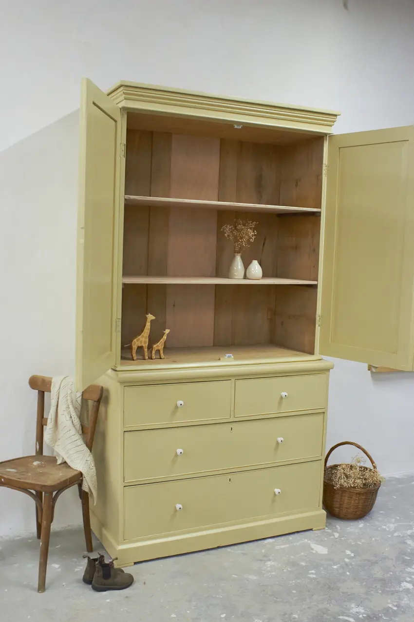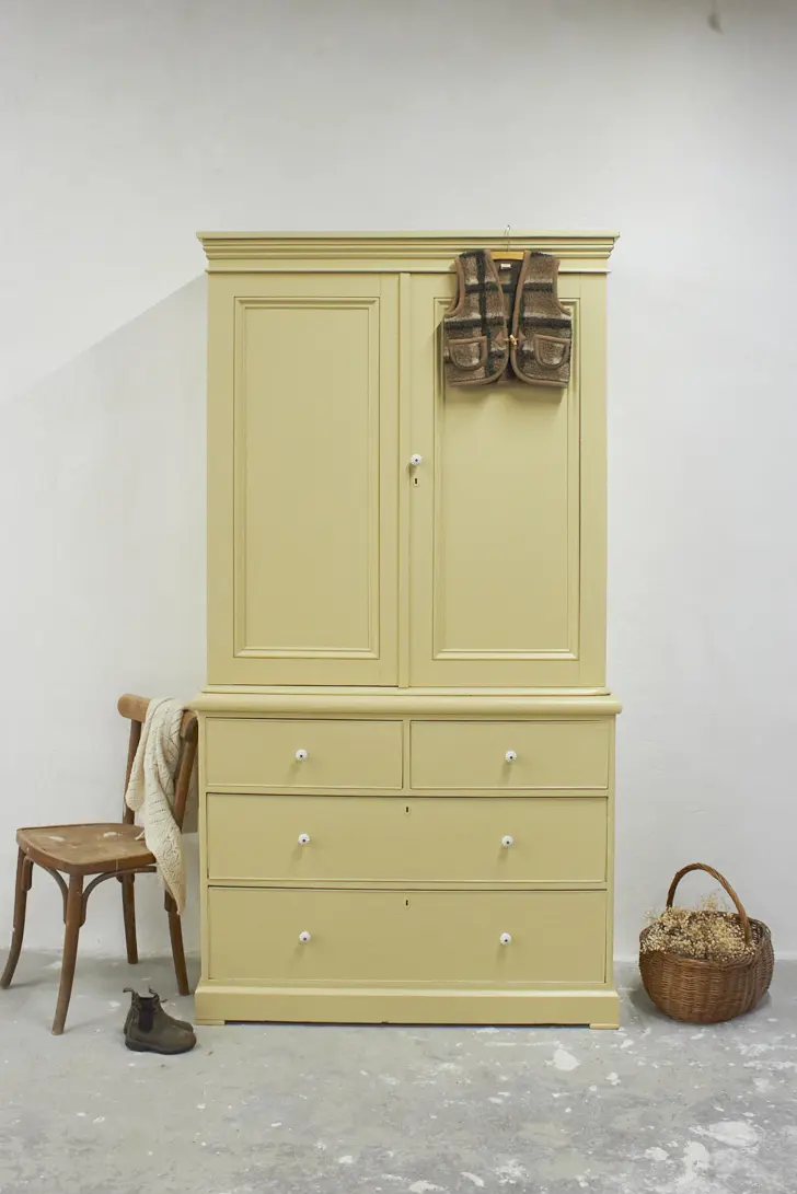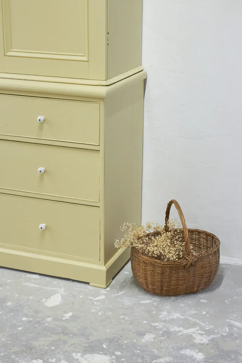 Na alle reparaties en de grondverf laag hebben we gekozen voor onze kleur Kamille. Wat zijn we toch blij met deze kleur! Mocht je twijfelen? Je kan ook eerst een kleurstaal bestellen van deze kleur. Of dit meubel op maat bestellen en een eigen kleur uitkiezen.