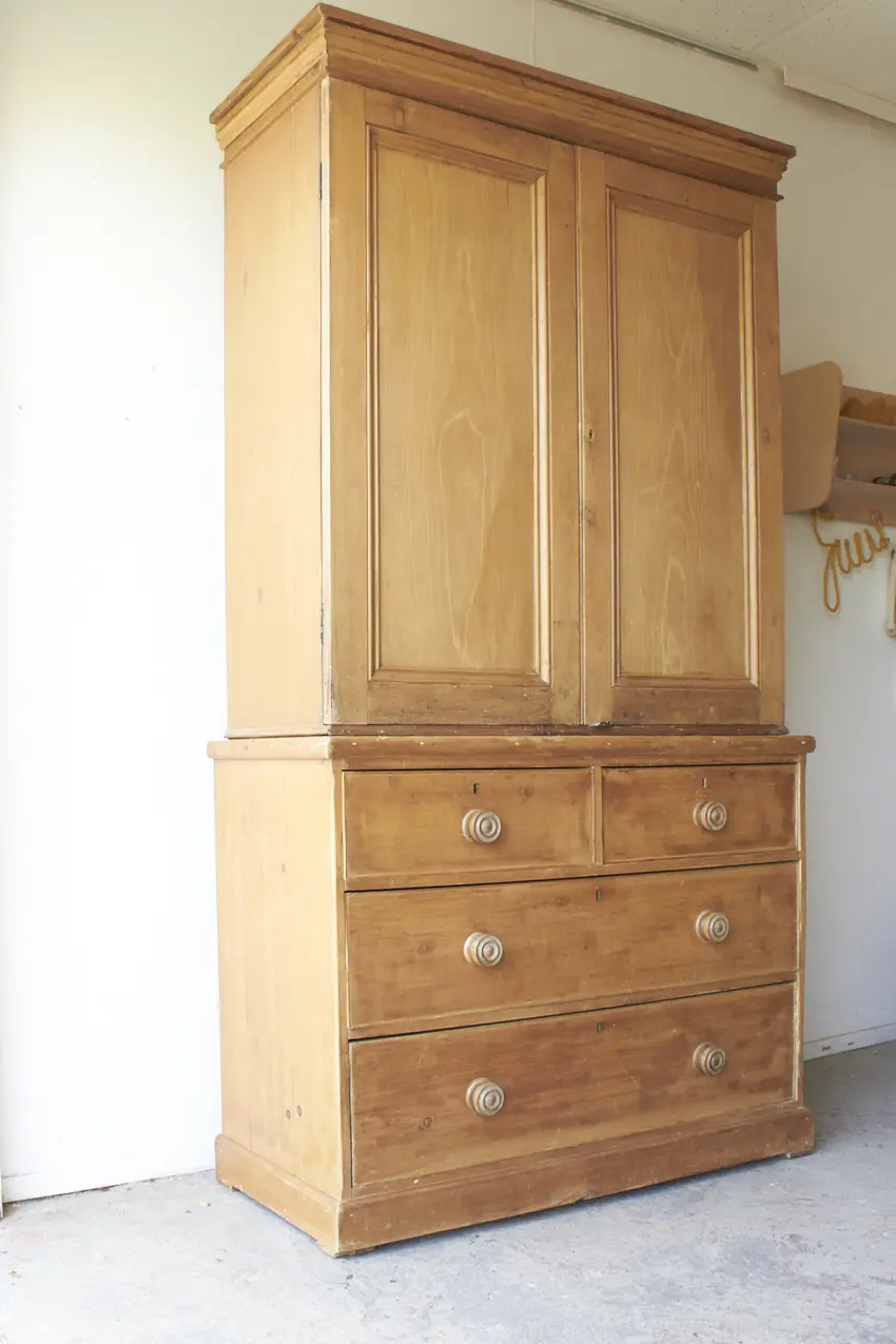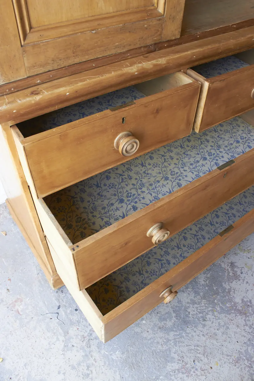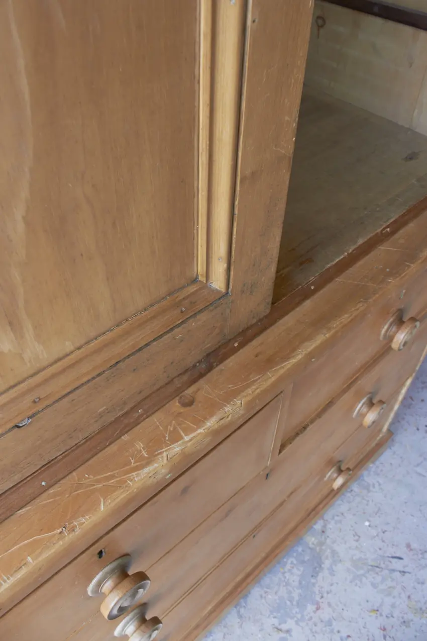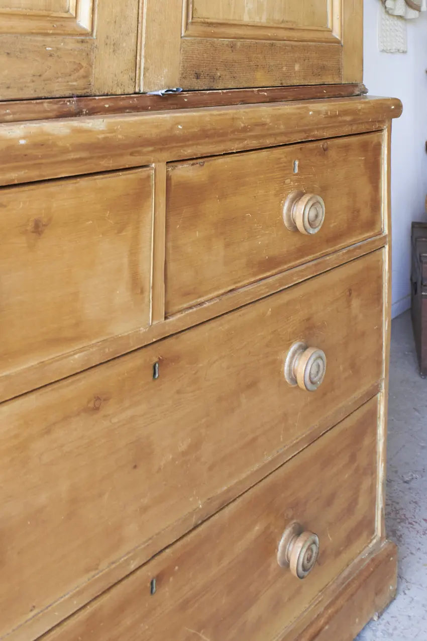 Deze tweedelige kast bestaat uit een stevige ladekast met brede diepe lades en hebben we nu opgeknapt voor onze winkel.