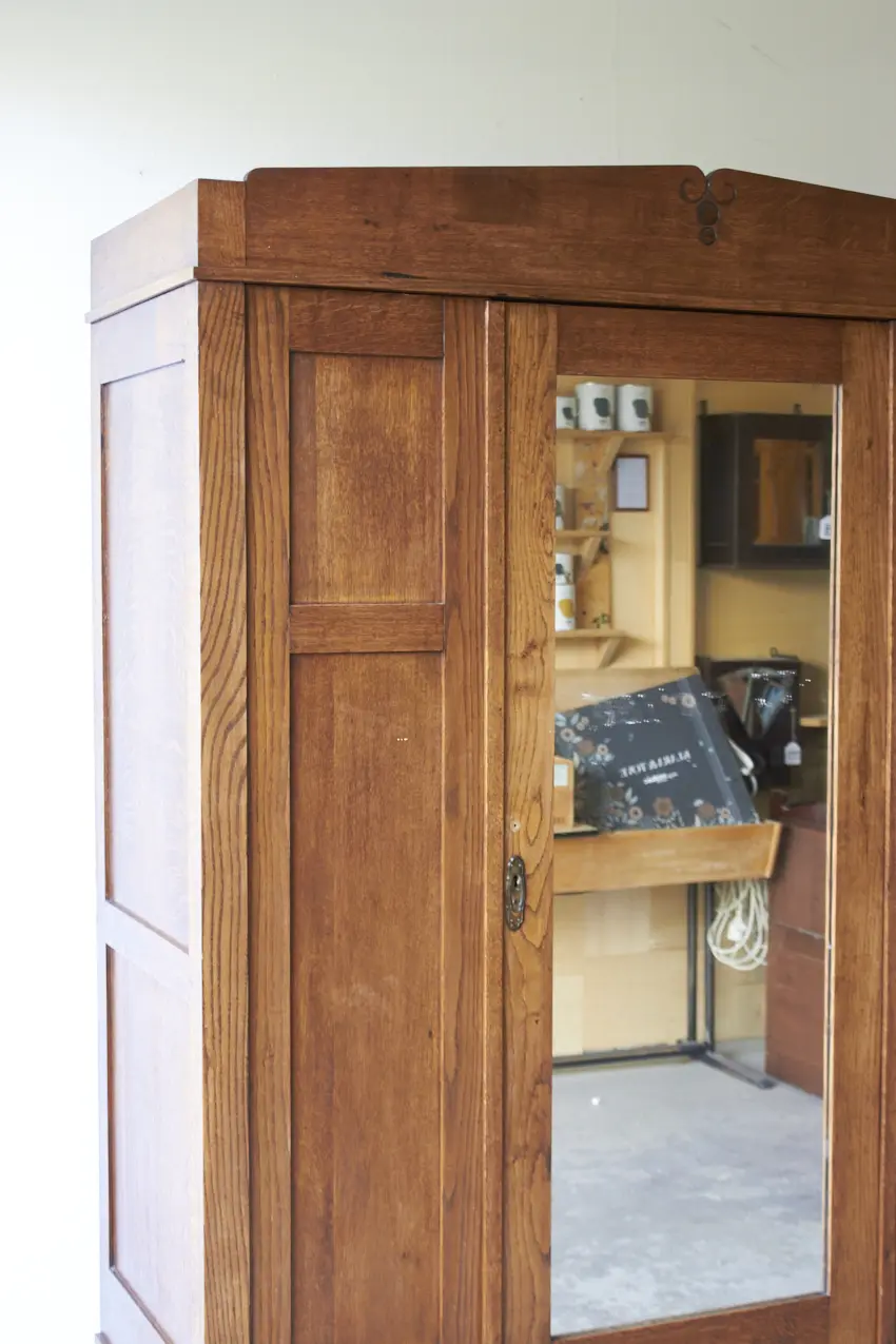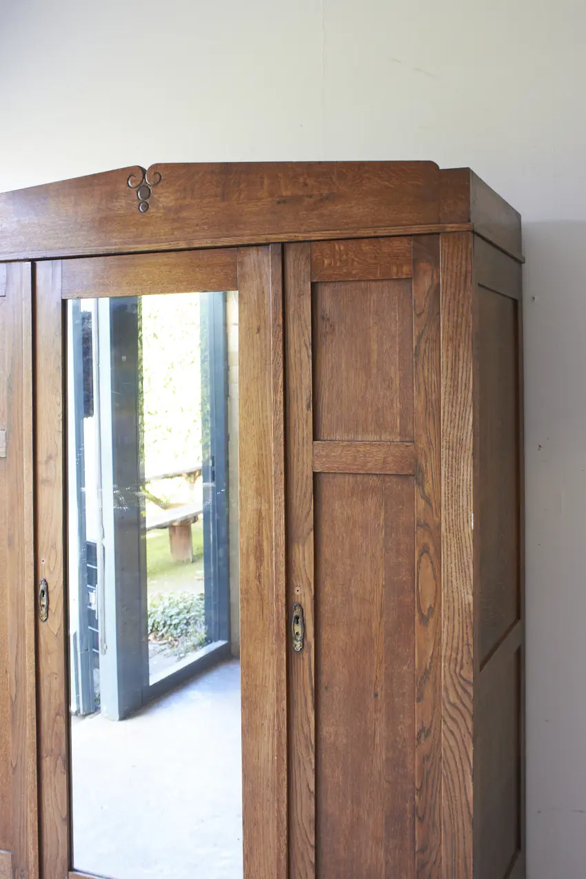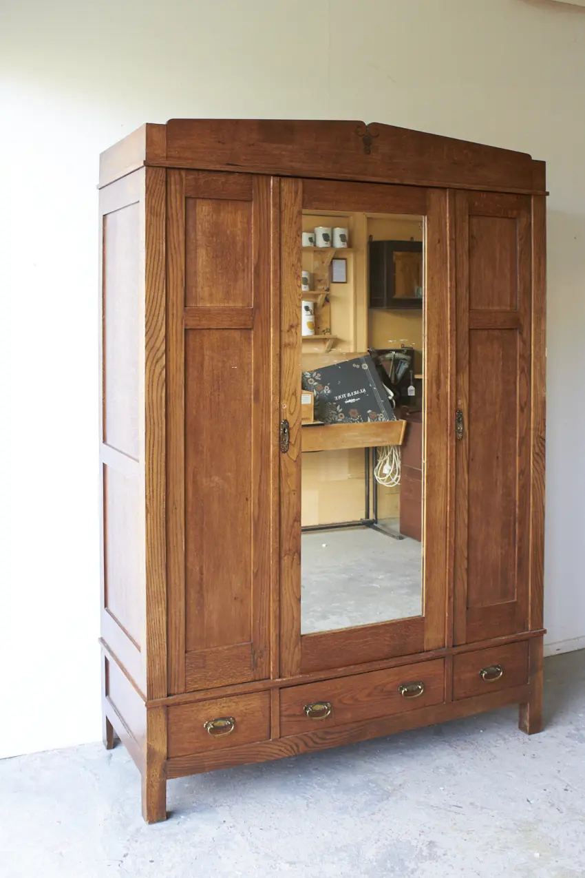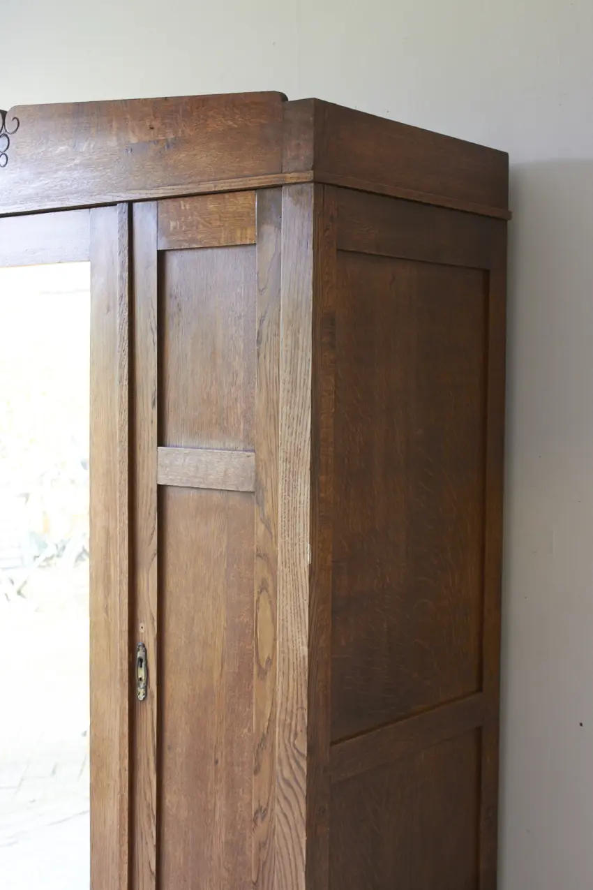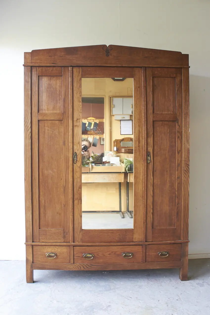 Less is more, bewijst ook dit meubel weer. Want zo prachtig door zijn eenvoudige paneeldeuren en rechte lijnen. Maar dan toch net even die sierlijke bewerking aan de bovenkant. Wat een prachtig meubel! Met een fijne spiegeldeur in het midden is dit een perfecte kledingkast voor op de slaapkamer of voor in de hal. We kunnen niet wachten om dit meubel te schilderen. We kunnen ook de spiegel vervangen voor hout en meeschilderen.