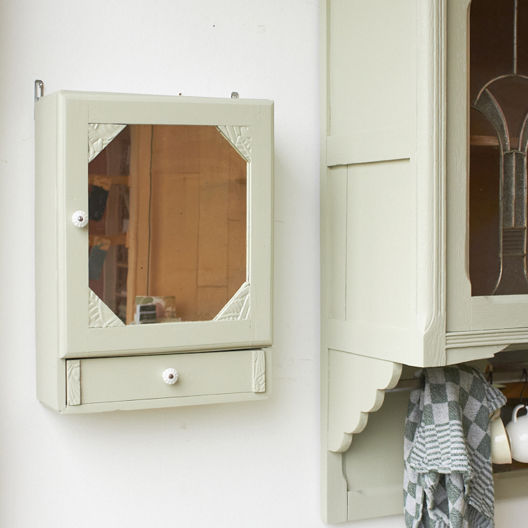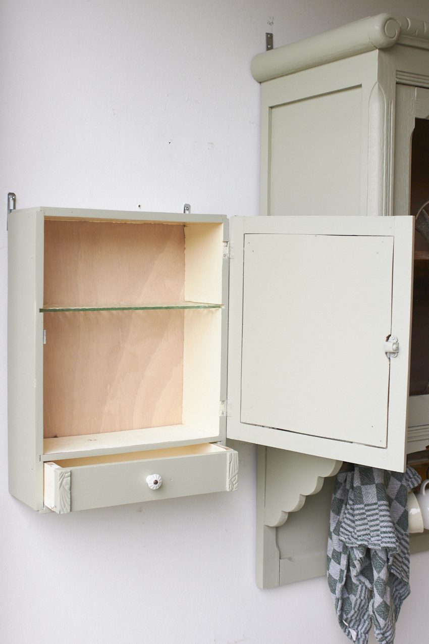 En onder het spiegeldeurtje zit nog een handig laatje voor al je kleine schatten. Elk hangkastje is goed schoongemaakt, behandeld tegen houtworm en gerepareerd waar nodig. En nu is hij weer helemaal klaar voor een nieuwe plek! Elk stuk is uniek, met een eigen karakter en een flinke dosis gezelligheid.