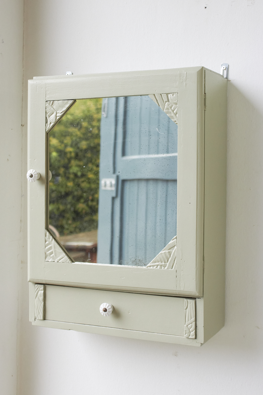 Dit specifieke hangkastje heeft prachtig houtsnijwerk en een vintage spiegel, met van die fijne vlekjes erop.