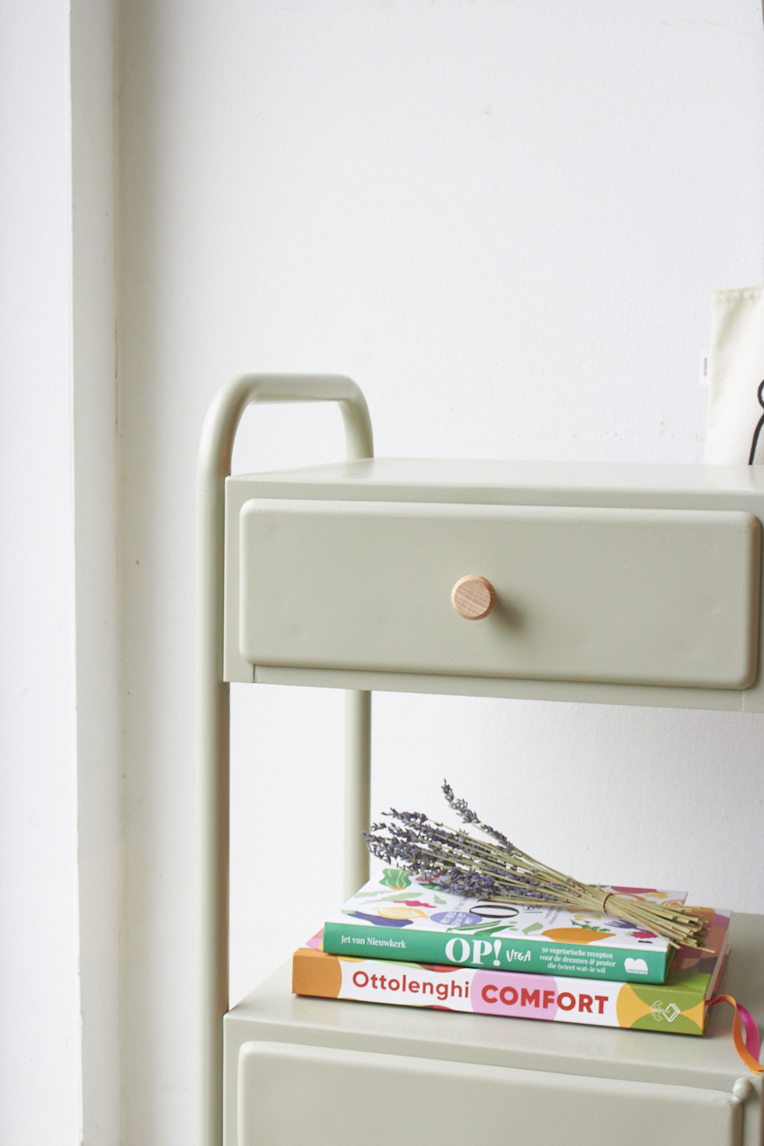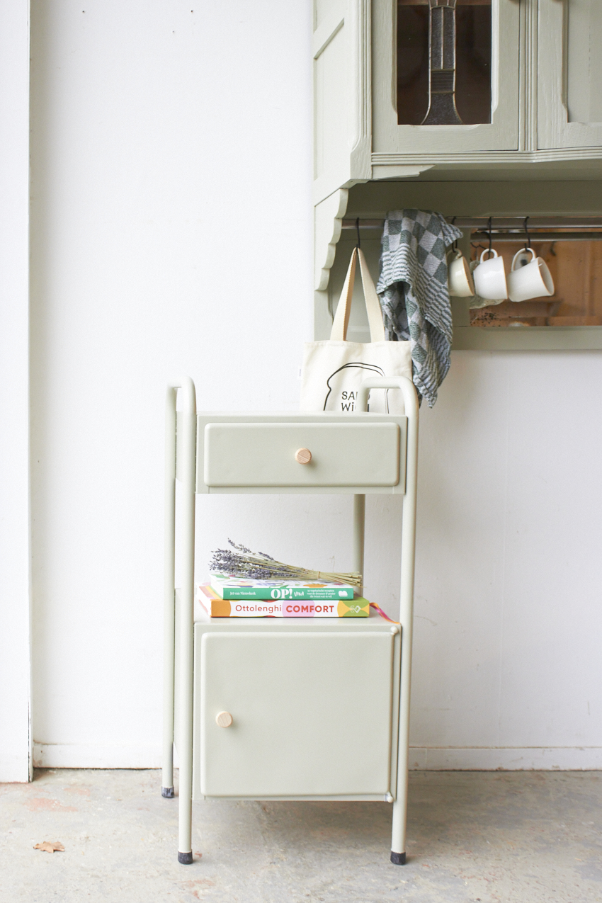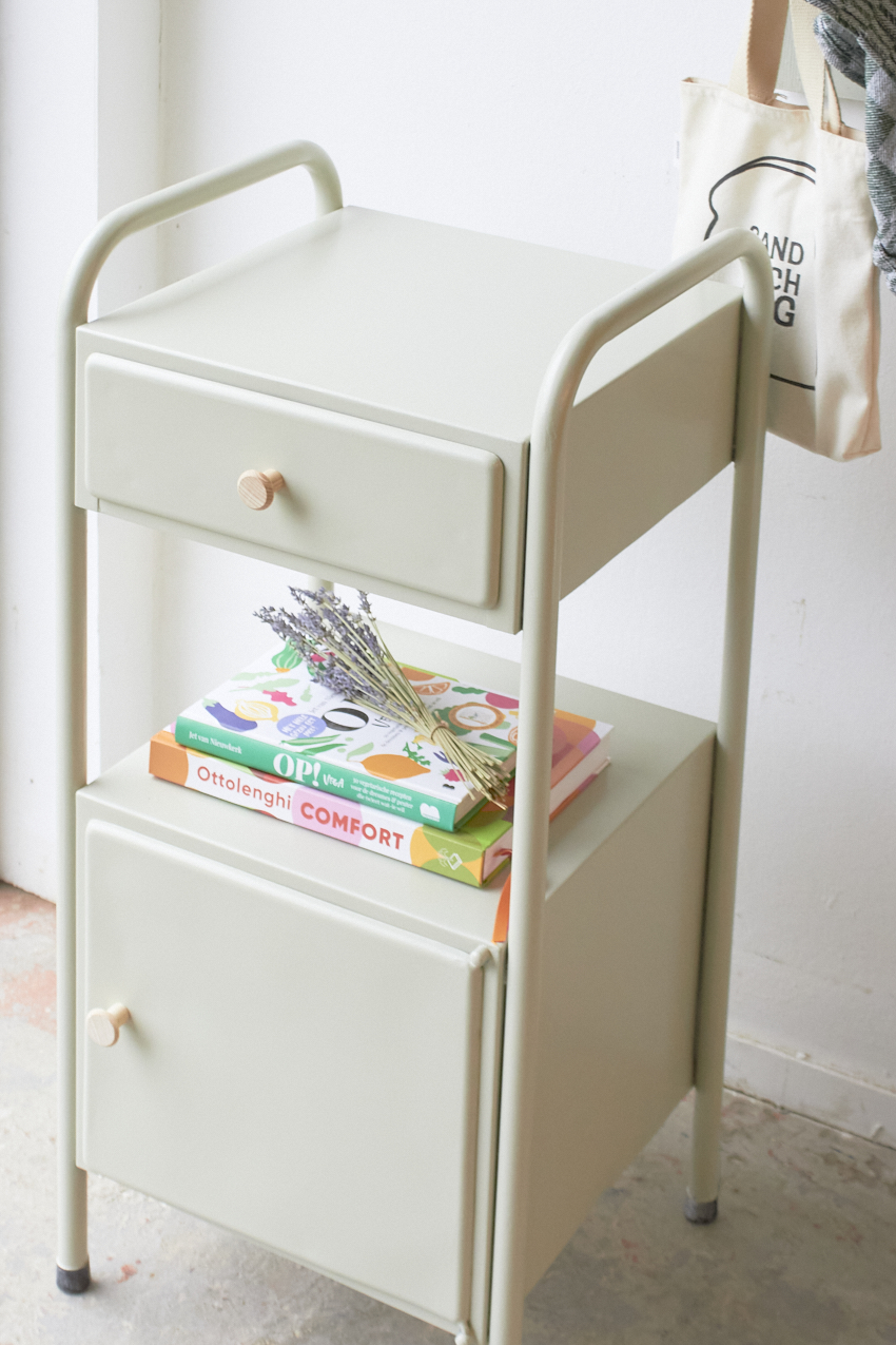 Wat een leuk retro kastje is dit, het is van metaal en wij hebben dit kastje geschilderd in onze kleur Voorjaar. Zal heel leuk staan naast de bank of een bed. We hebben het kastje afgewerkt met twee essen houten knoppen.