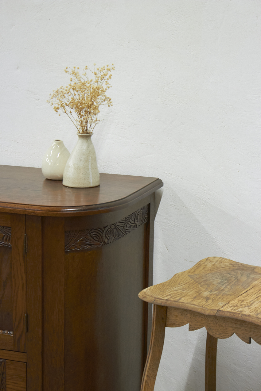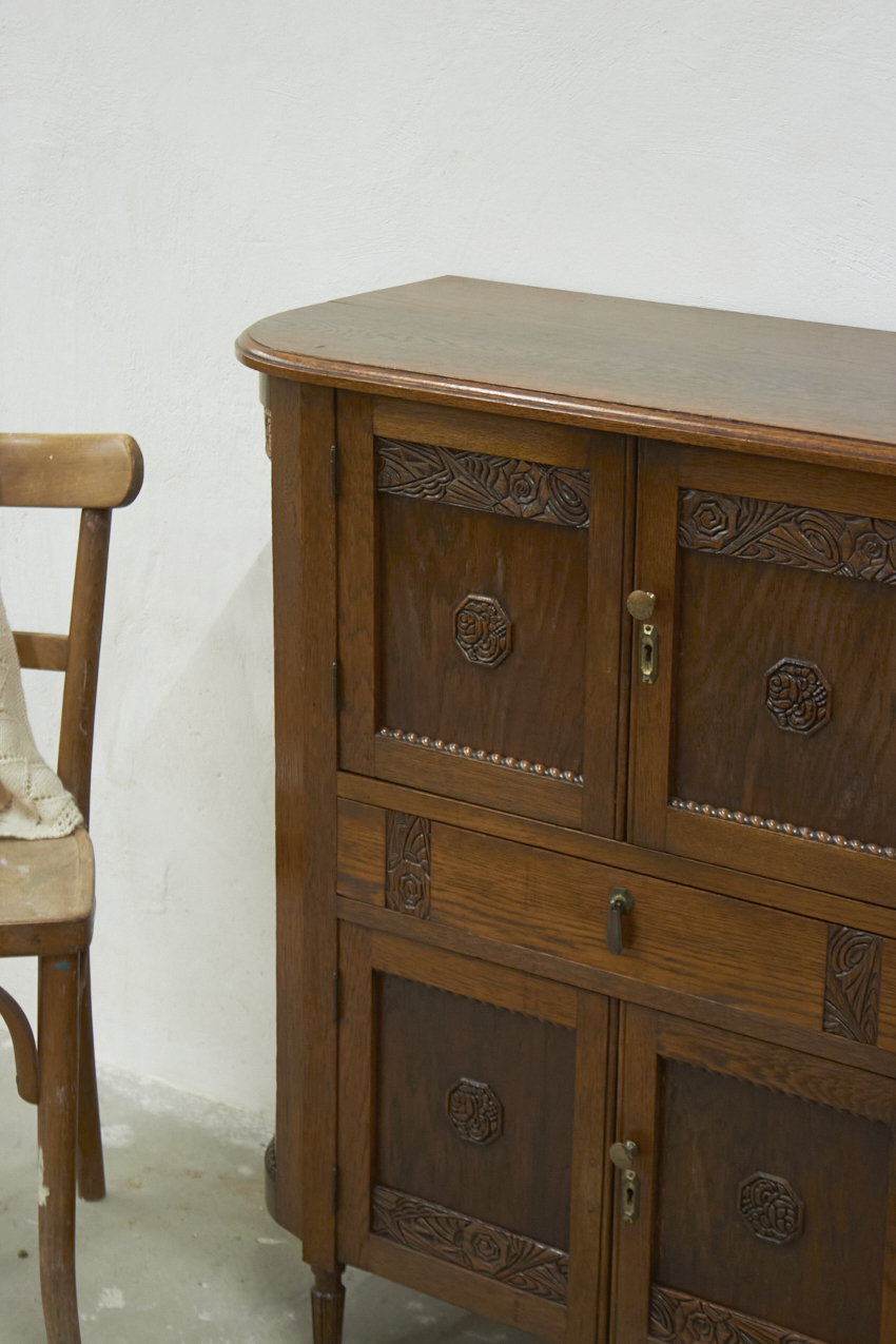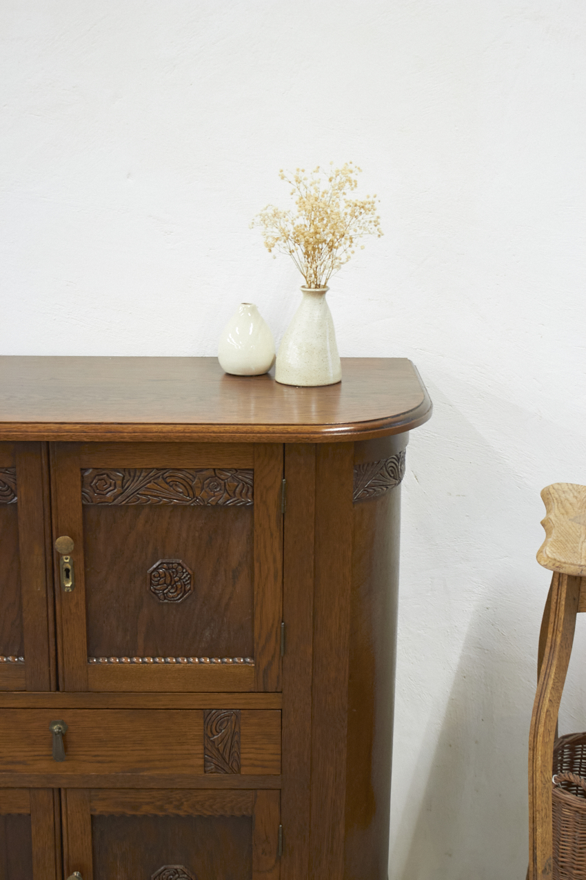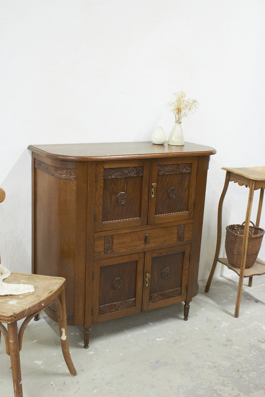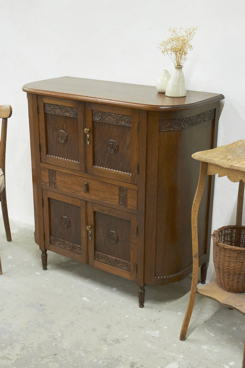 We zien het al helemaal voor ons: dit meubel in de kinderkamer, gevuld met speelgoed en boekjes. Wat zal het daar veel sfeer geven. Maar ook in de hal is hij perfect voor handschoenen en sjaals, of in de woonkamer als pronkstuk vol bijzondere schatten. Dankzij zijn fijne formaat past deze kast eigenlijk overal. En dan dat mooie houtsnijwerk…