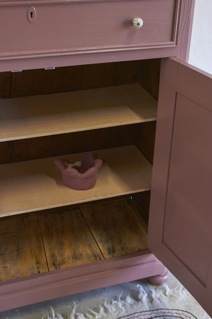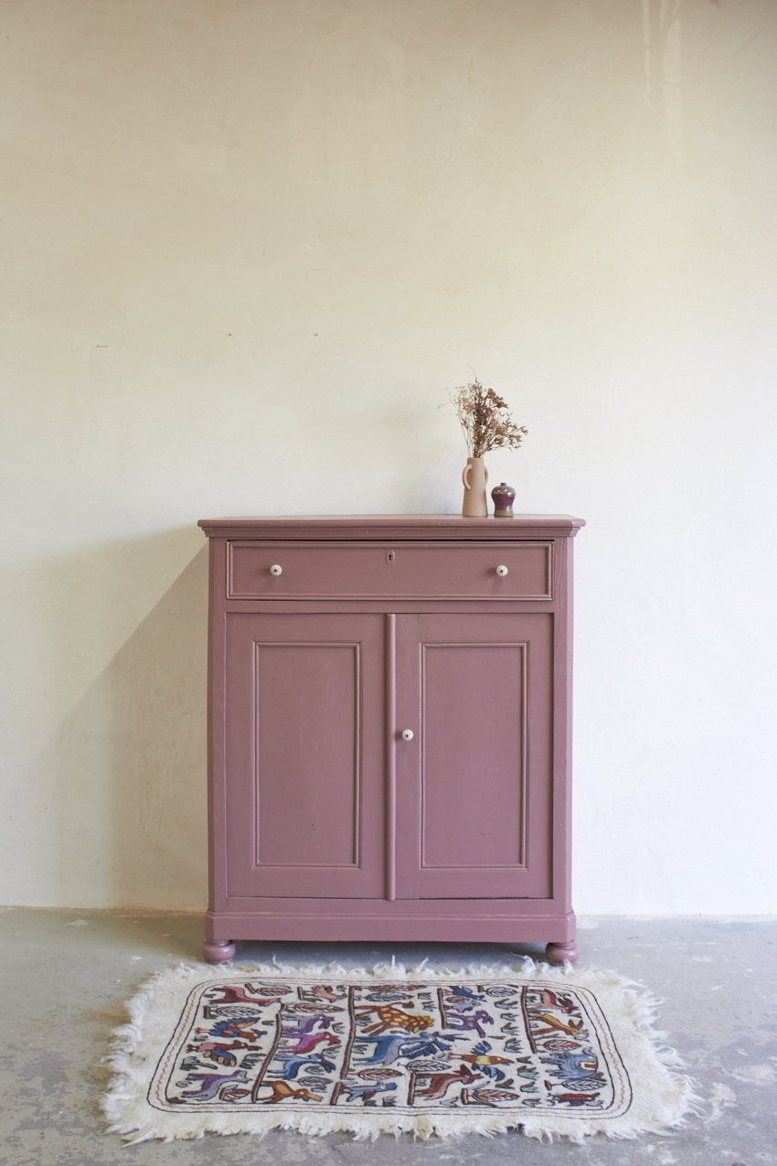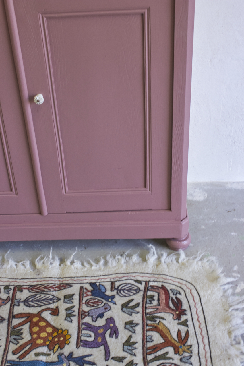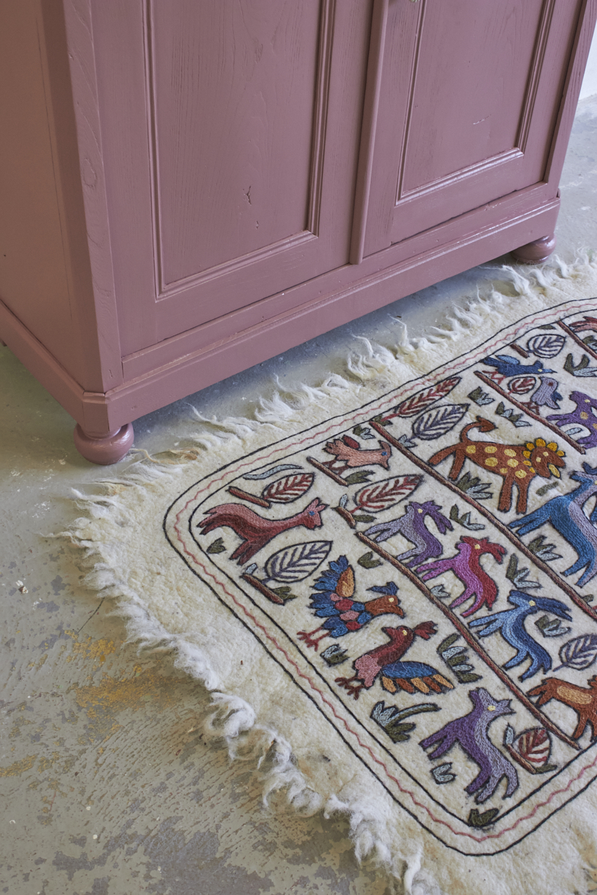 Toen de kast terugkwam van de meubelstralers hebben we het meubel grondig schoongemaakt. Ook hebben we hem een anti-houtworm behandeling gegeven. De kast is daarna helemaal nagelopen en waar nodig gerepareerd. Daarna hebben we gekozen voor onze kleur Bes. Bes is een frisse, roze tint met een warme paarse ondertoon. Een kleur die meteen sfeer toevoegt aan een ruimte, zonder overheersend te zijn. Met deze fijne kleur krijgt je meubel meteen meer karakter. Het unieke vloerkleed om de kinderkamer mee te versieren is ook bij ons te koop voor 115,- euro. Dit vrolijke dierenkleed is gemaakt met de traditionele vilttechniek. De wol wordt verzameld van schapen in de bergen van Kasjmir. Vervolgens wordt het met de hand geborduurd door ervaren ambachtslieden met wollen draden. Dit traditionele ambacht komt uit de regio Kasjmir in Noord-India en is een prachtig kunstwerk om naar te kijken, je kan dit kleed ook aan de muur op hangen natuurlijk.