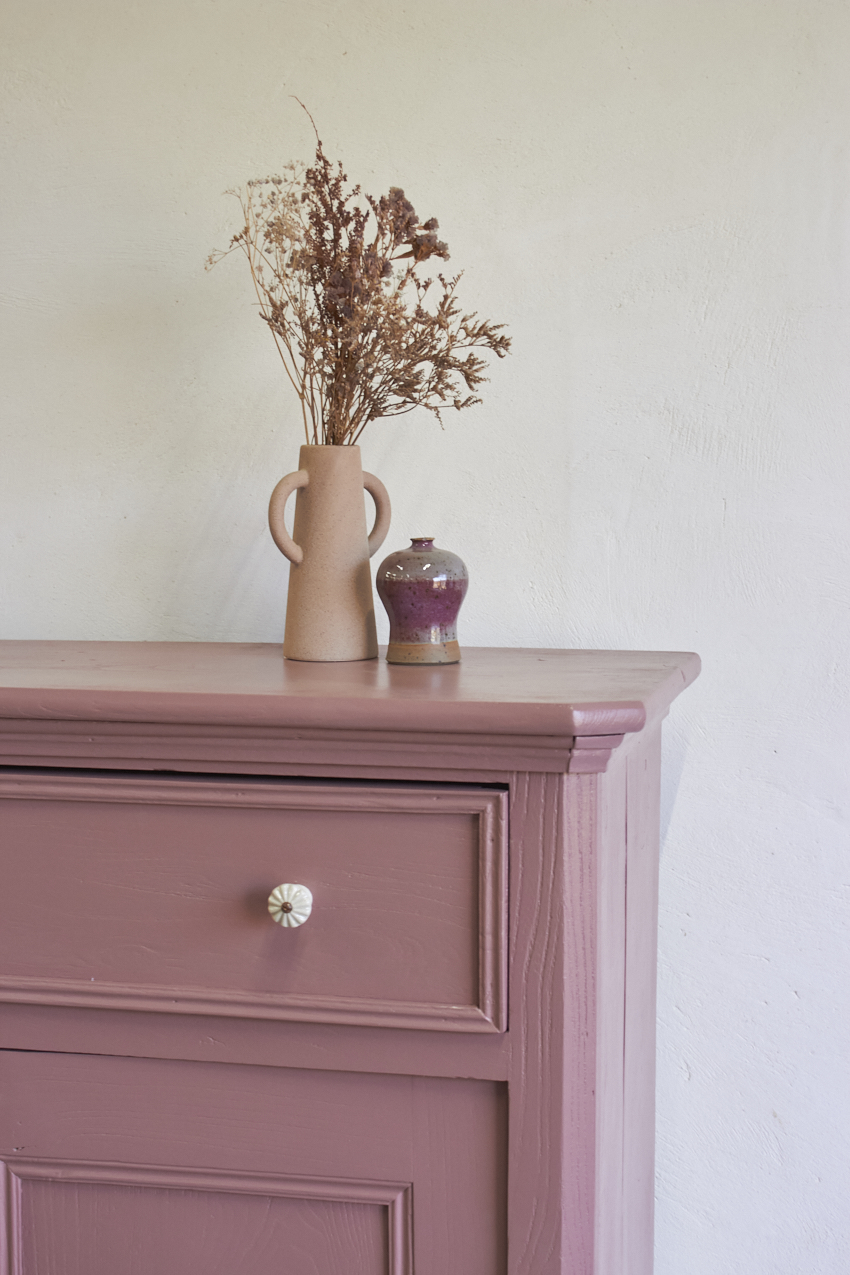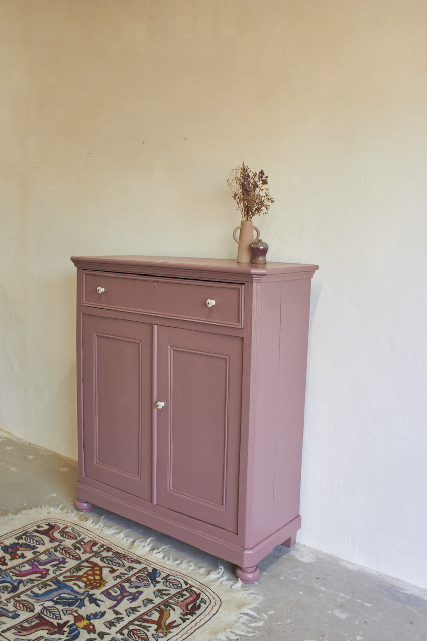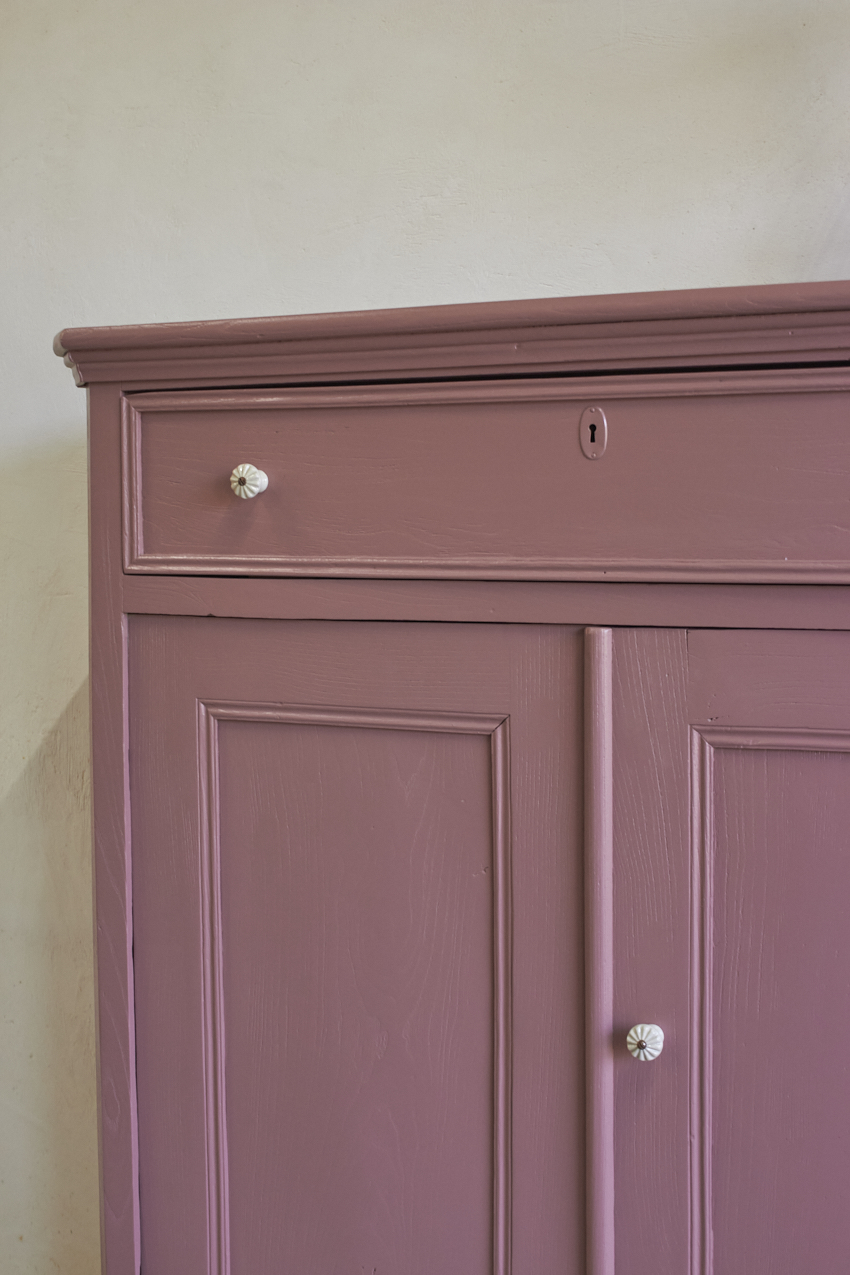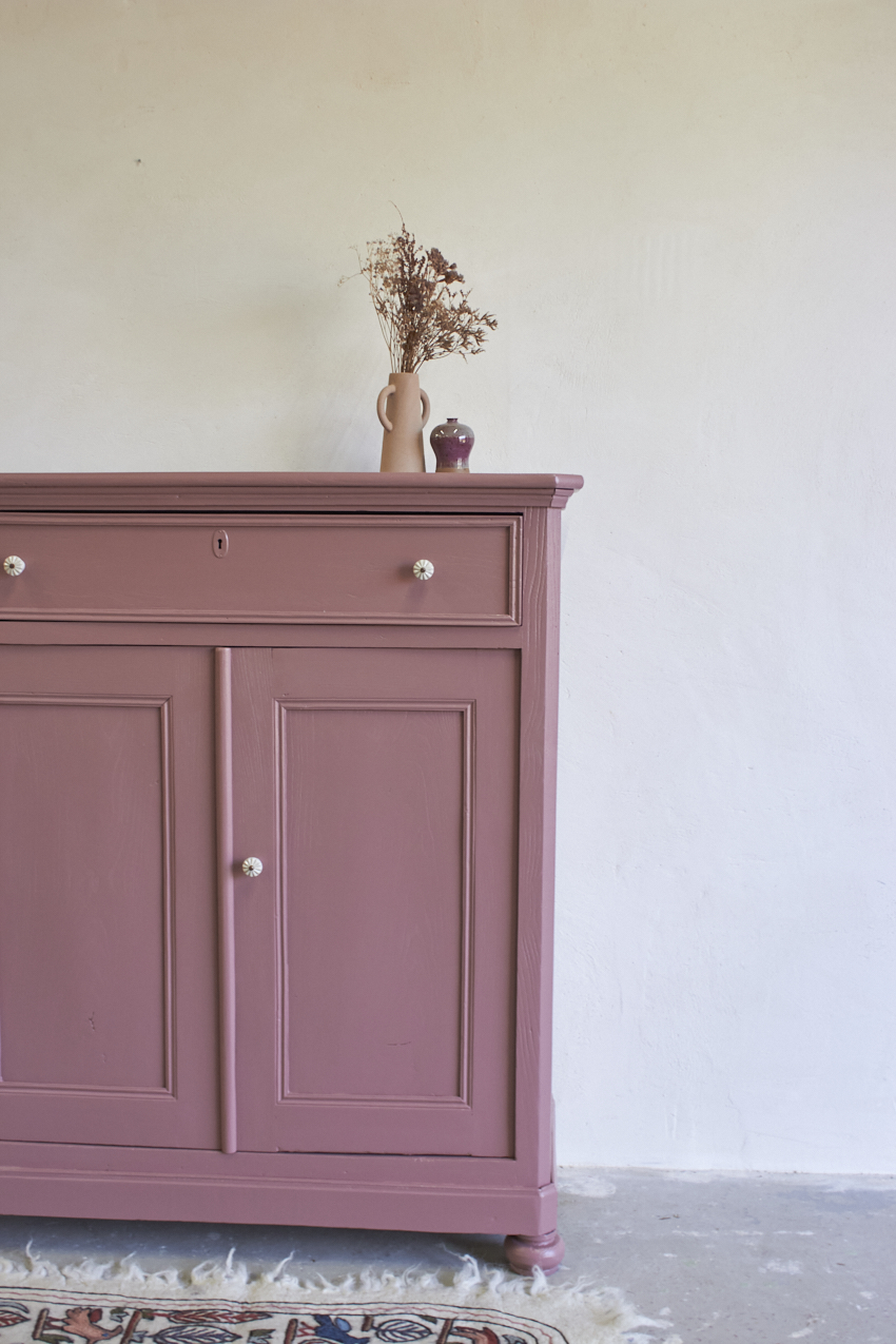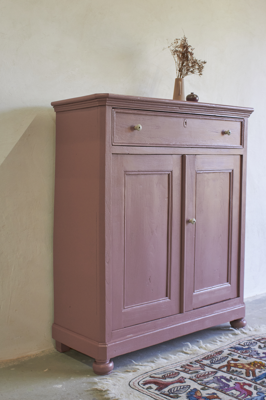 Toen de kast terugkwam van de meubelstralers hebben we het meubel grondig schoongemaakt. Ook hebben we hem een anti-houtworm behandeling gegeven. De kast is daarna helemaal nagelopen en waar nodig gerepareerd. Daarna hebben we gekozen voor onze kleur Bes. Bes is een frisse, roze tint met een warme paarse ondertoon. Een kleur die meteen sfeer toevoegt aan een ruimte, zonder overheersend te zijn. Met deze fijne kleur krijgt je meubel meteen meer karakter. Het unieke vloerkleed om de kinderkamer mee te versieren is ook bij ons te koop voor 115,- euro. Dit vrolijke dierenkleed is gemaakt met de traditionele vilttechniek. De wol wordt verzameld van schapen in de bergen van Kasjmir. Vervolgens wordt het met de hand geborduurd door ervaren ambachtslieden met wollen draden. Dit traditionele ambacht komt uit de regio Kasjmir in Noord-India en is een prachtig kunstwerk om naar te kijken, je kan dit kleed ook aan de muur op hangen natuurlijk.