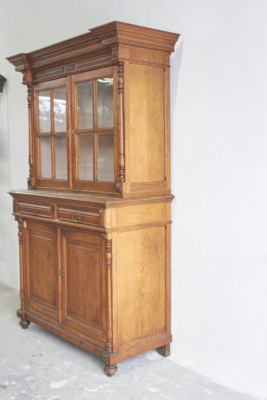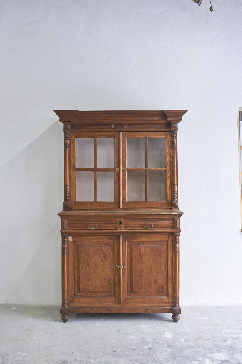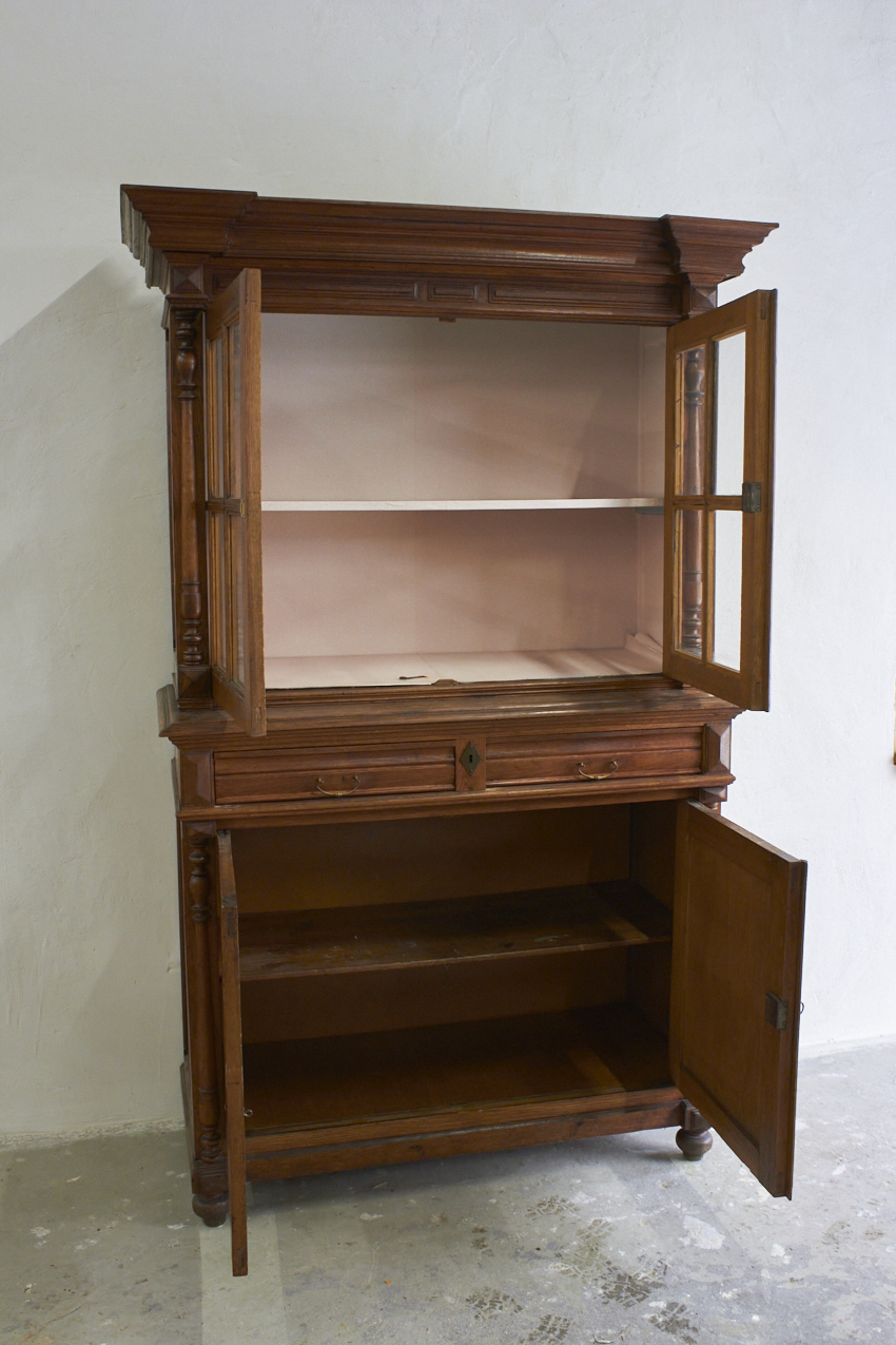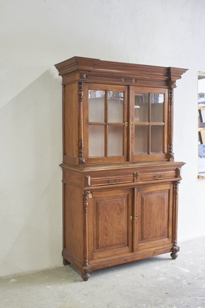 Een prachtig, vintage commode en of buffetkast, die op dit moment in onze opslag staat. Met zijn paneel deuren en lades perfect op de babykamer, waarbij er voldoende ruimte is voor de eerste kleertjes, luiers en andere babyspulletjes. Eenvoudig door zijn paneeldeuren, maar met de sierlijke pilaren aan de zijkant een prachtexemplaar! Vroeger heeft deze gediend als buffetkast, en de bovenkant is ook nog aanwezig. En deze is uitzonderlijk mooi! Het geslepen glas in de bovenkant is nog in tact en zo uniek!
