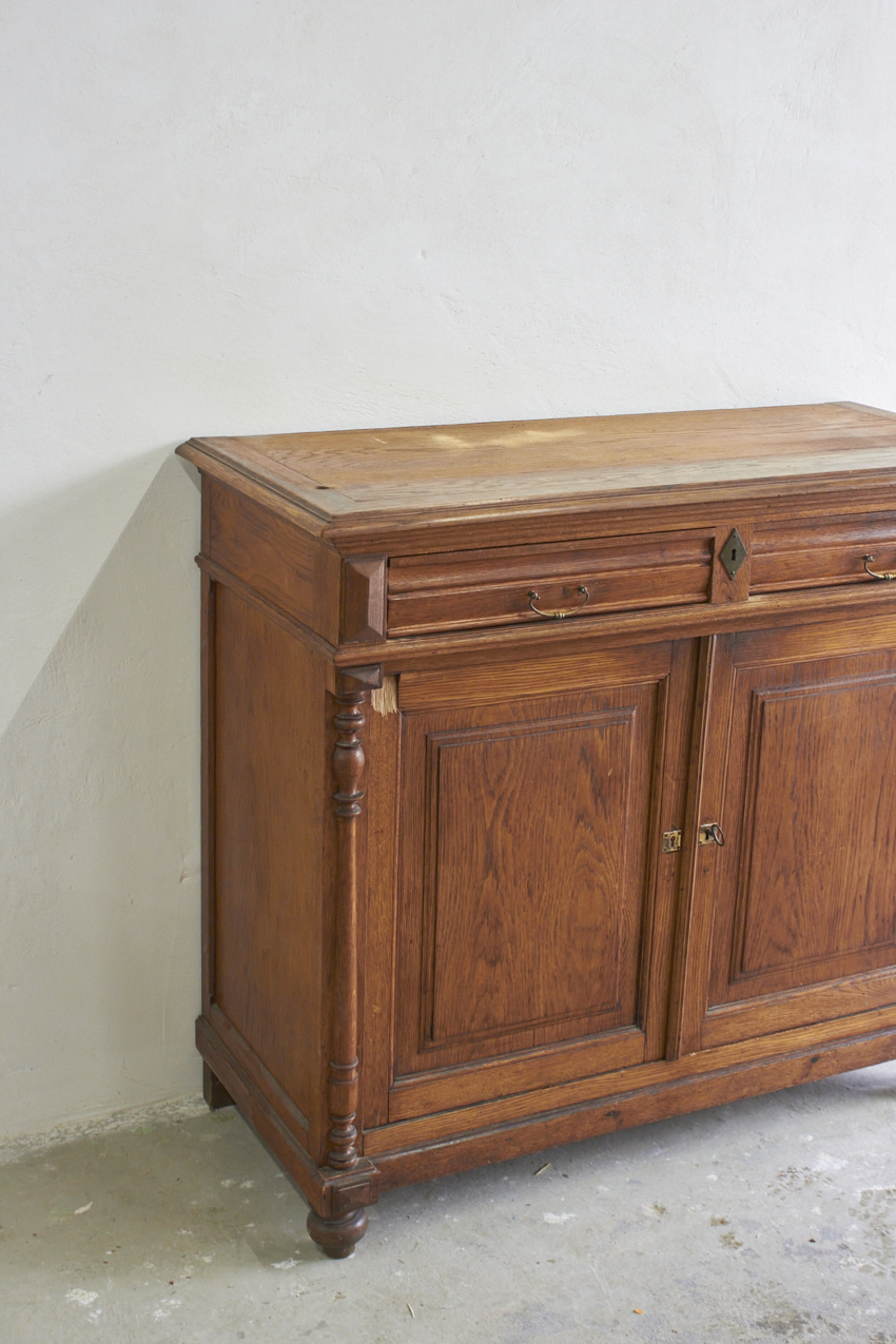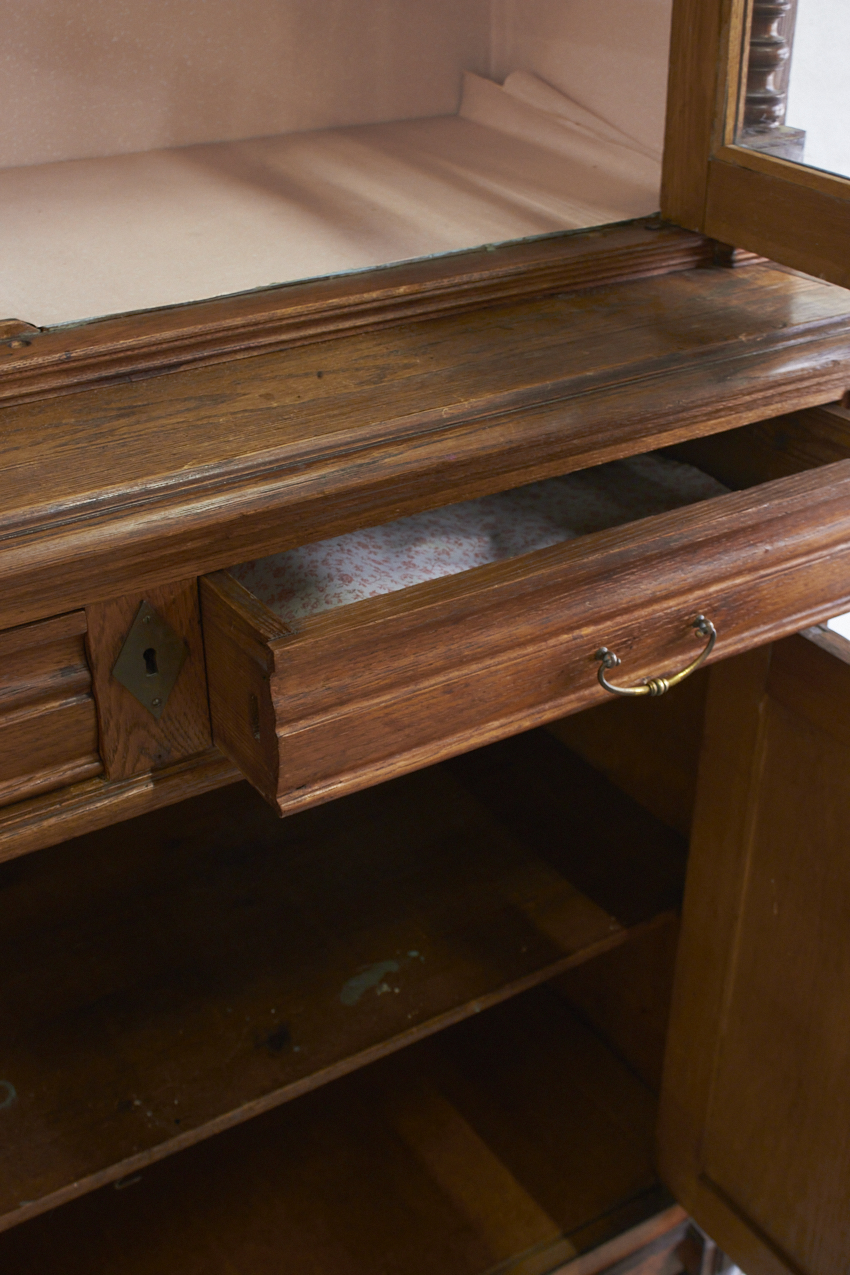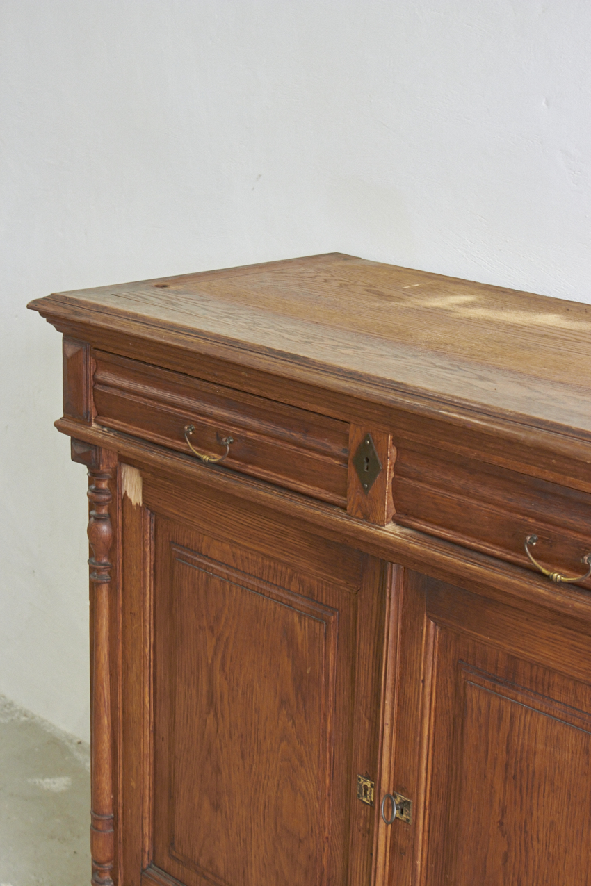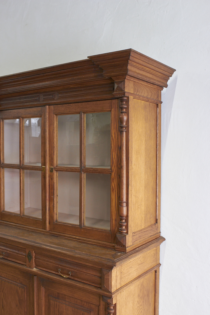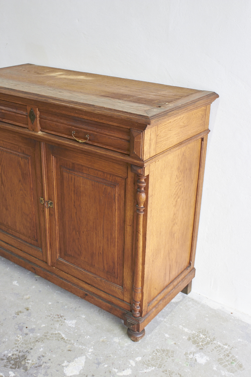 Een prachtig, vintage commode en of buffetkast, die op dit moment in onze opslag staat. Met zijn paneel deuren en lades perfect op de babykamer, waarbij er voldoende ruimte is voor de eerste kleertjes, luiers en andere babyspulletjes. Eenvoudig door zijn paneeldeuren, maar met de sierlijke pilaren aan de zijkant een prachtexemplaar! Vroeger heeft deze gediend als buffetkast, en de bovenkant is ook nog aanwezig. En deze is uitzonderlijk mooi! Het geslepen glas in de bovenkant is nog in tact en zo uniek!