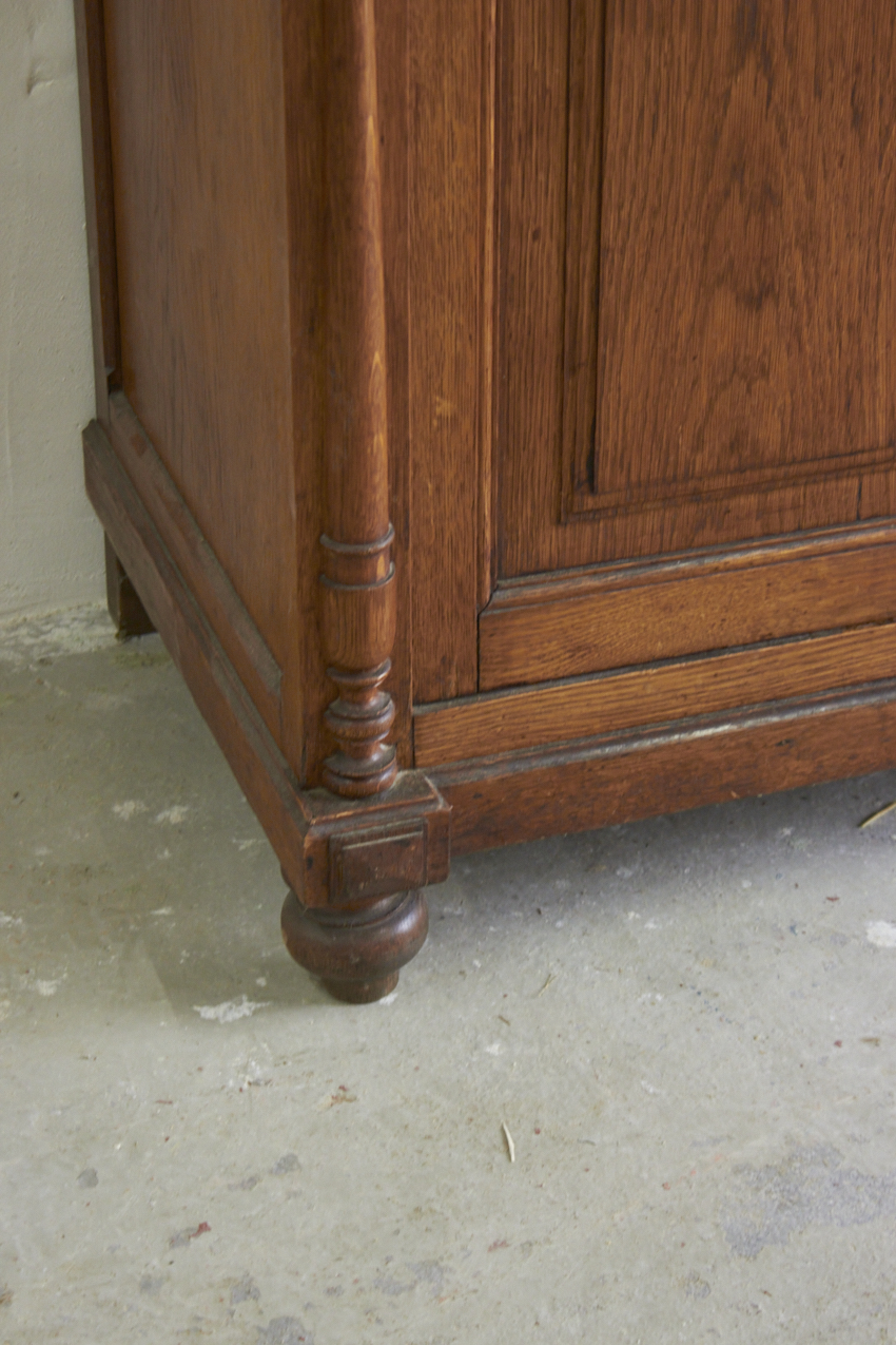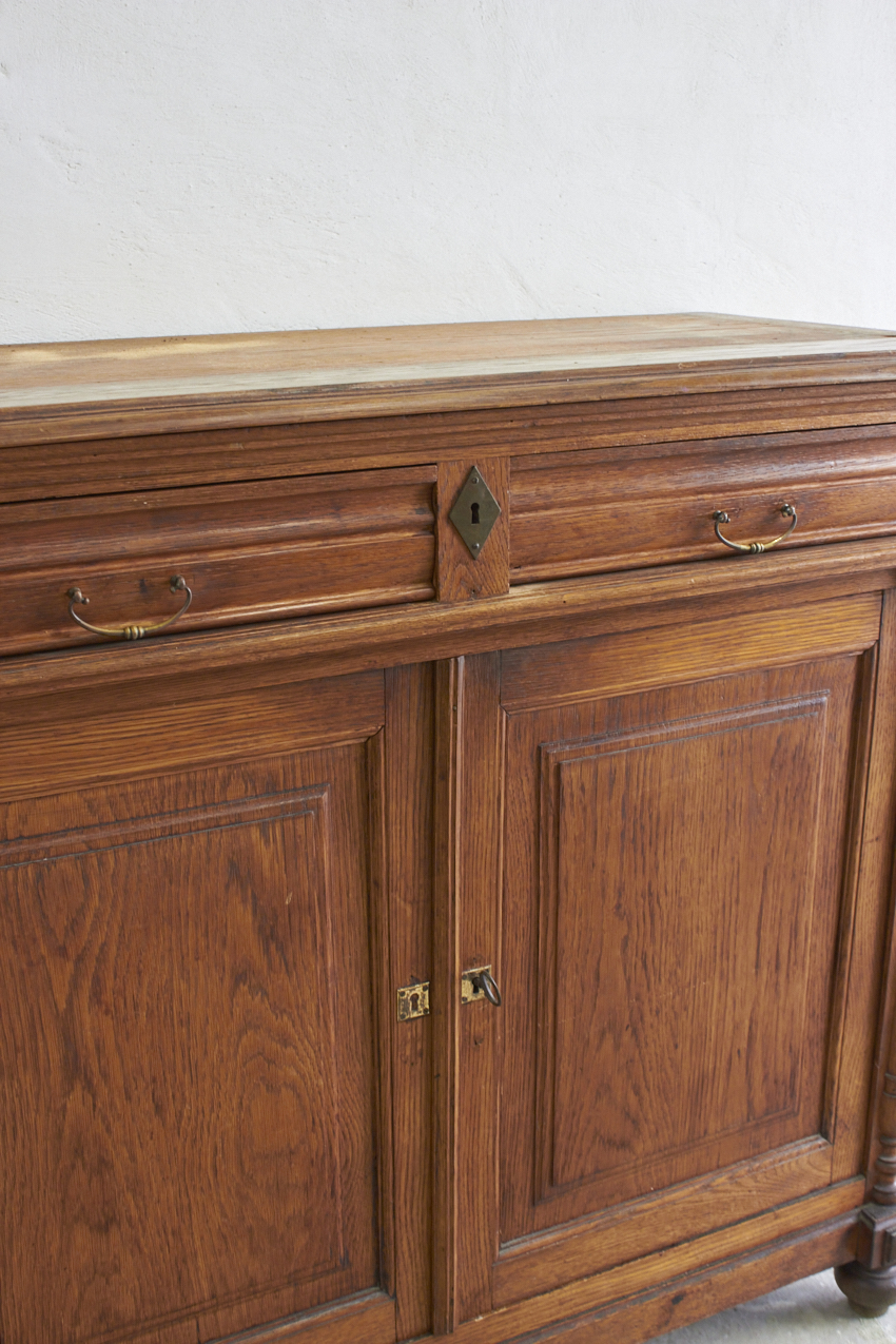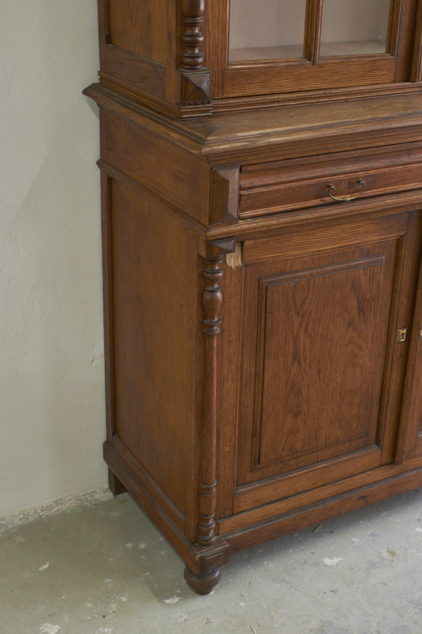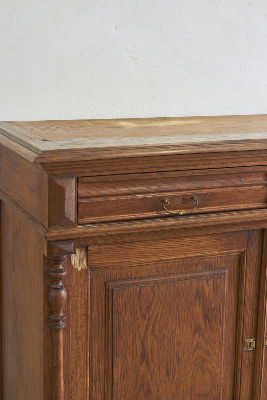 Een prachtig, vintage commode en of buffetkast, die op dit moment in onze opslag staat. Met zijn paneel deuren en lades perfect op de babykamer, waarbij er voldoende ruimte is voor de eerste kleertjes, luiers en andere babyspulletjes. Eenvoudig door zijn paneeldeuren, maar met de sierlijke pilaren aan de zijkant een prachtexemplaar! Vroeger heeft deze gediend als buffetkast, en de bovenkant is ook nog aanwezig. En deze is uitzonderlijk mooi! Het geslepen glas in de bovenkant is nog in tact en zo uniek!