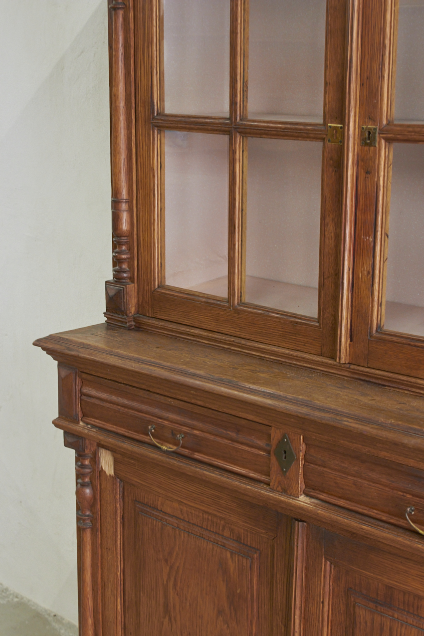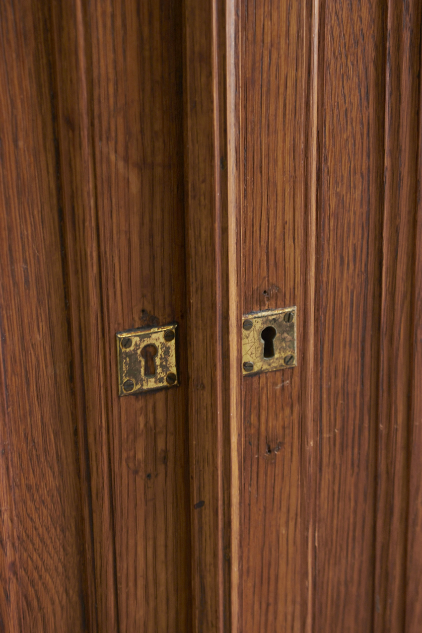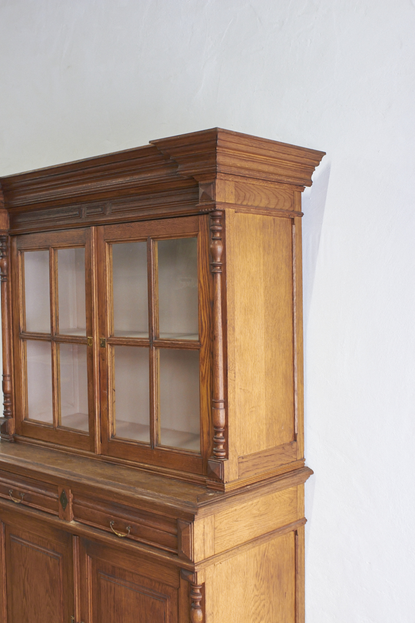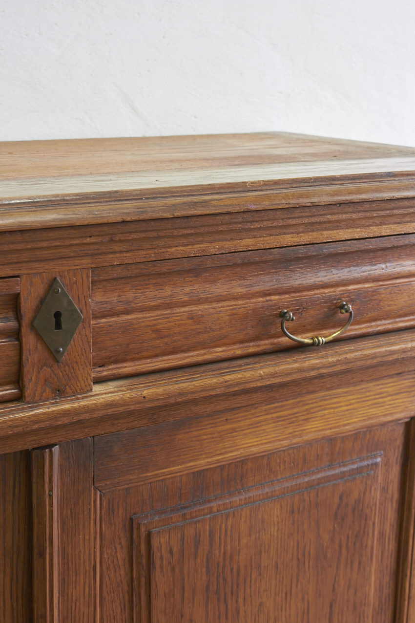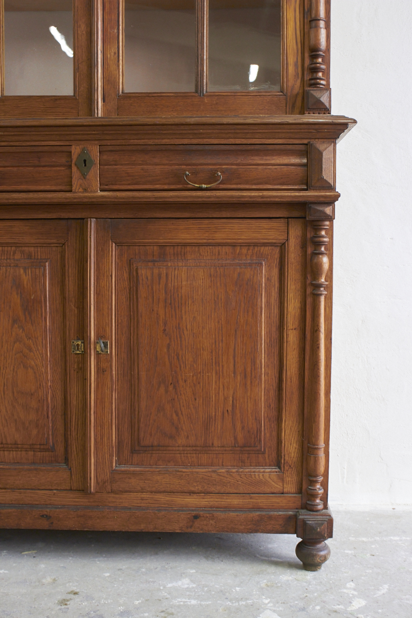 Een prachtig, vintage commode en of buffetkast, die op dit moment in onze opslag staat. Met zijn paneel deuren en lades perfect op de babykamer, waarbij er voldoende ruimte is voor de eerste kleertjes, luiers en andere babyspulletjes. Eenvoudig door zijn paneeldeuren, maar met de sierlijke pilaren aan de zijkant een prachtexemplaar! Vroeger heeft deze gediend als buffetkast, en de bovenkant is ook nog aanwezig. En deze is uitzonderlijk mooi! Het geslepen glas in de bovenkant is nog in tact en zo uniek!