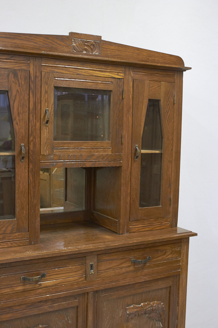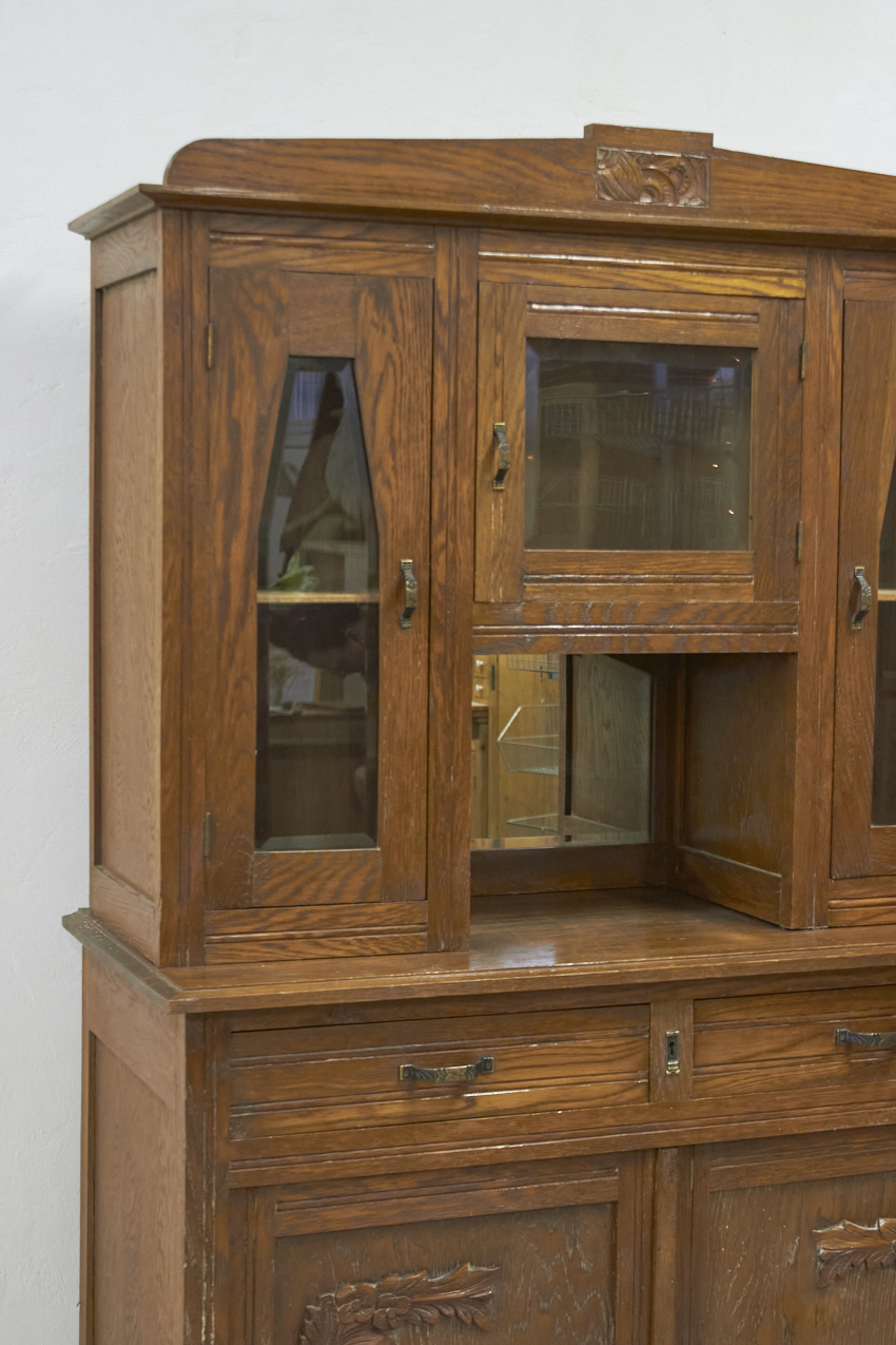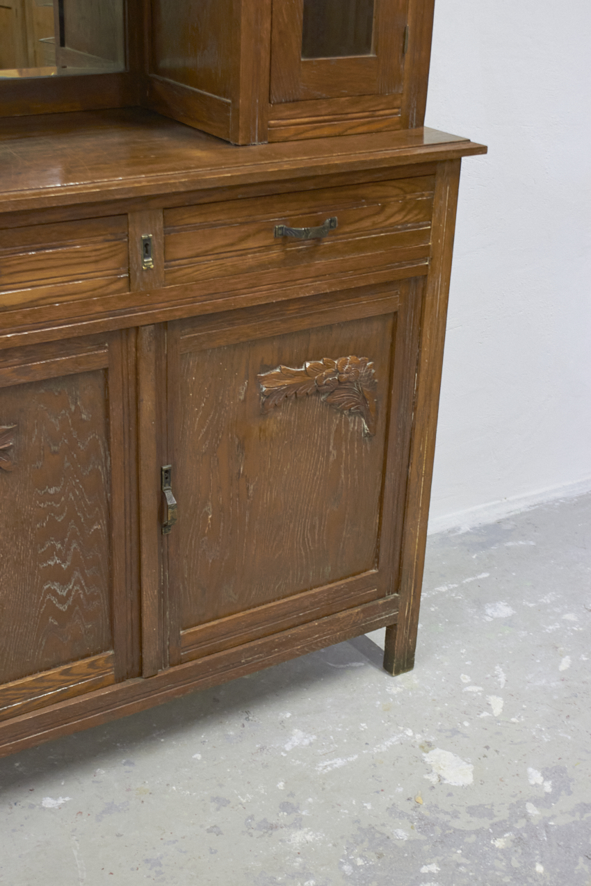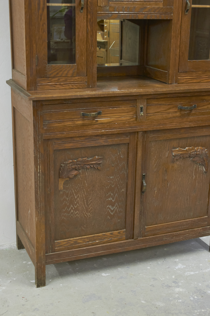 Een prachtig, vintage buffetkast, die op dit moment in onze opslag staat. Het glas in de bovenkant is nog in tact en zo mooi! Helaas is het houtsnijwerk gesneuveld, dit zouden wij er af halen. Dan heb je mooie strakke paneel deuren. We kunnen ook iets anders terug plaatsen. En we kunnen ook het glas vervangen voor hout en meeschilderen. Kom gerust even kijken om samen met ons alle mogelijkheden te bespreken.