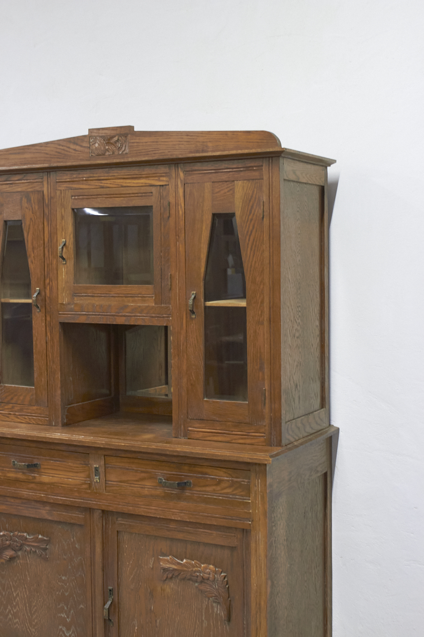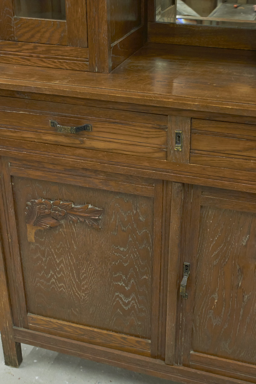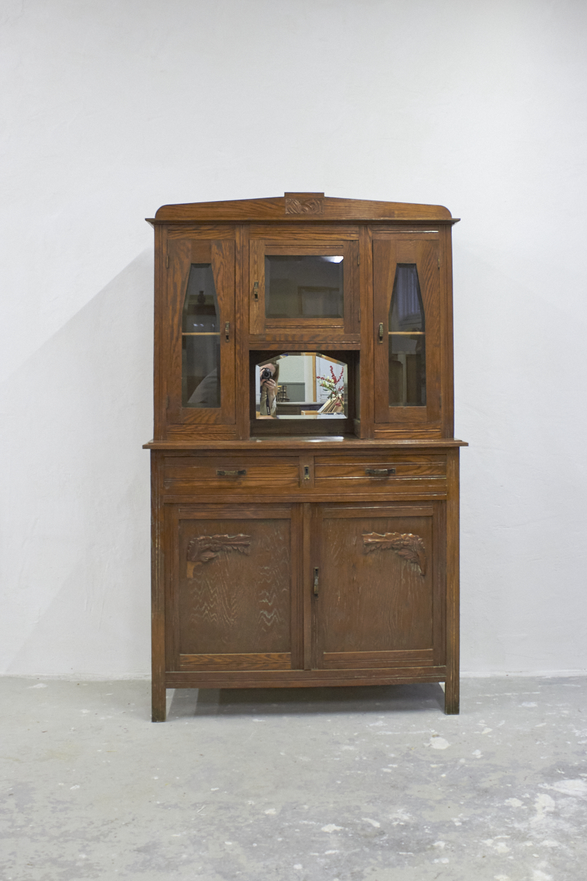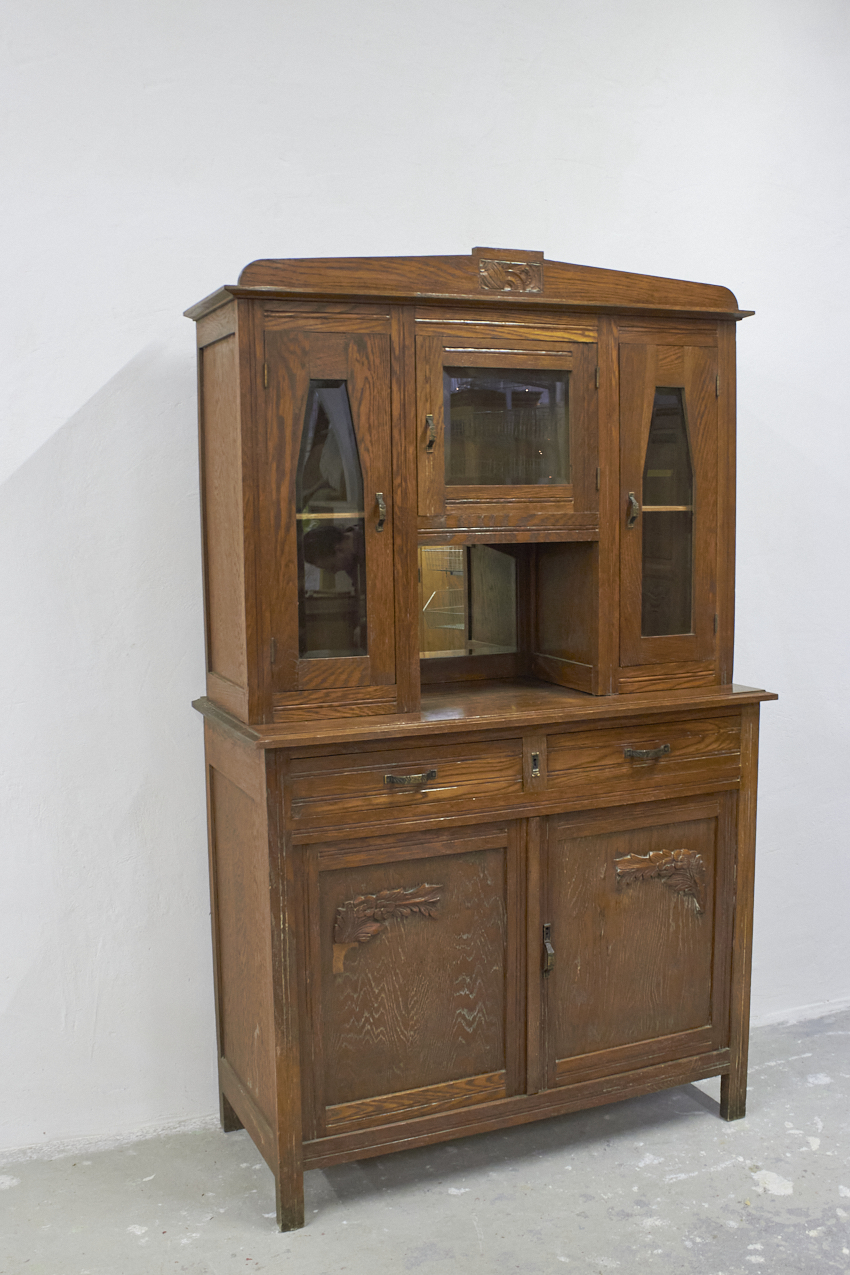 Een prachtig, vintage buffetkast, die op dit moment in onze opslag staat. Het glas in de bovenkant is nog in tact en zo mooi! Helaas is het houtsnijwerk gesneuveld, dit zouden wij er af halen. Dan heb je mooie strakke paneel deuren. We kunnen ook iets anders terug plaatsen. En we kunnen ook het glas vervangen voor hout en meeschilderen. Kom gerust even kijken om samen met ons alle mogelijkheden te bespreken.