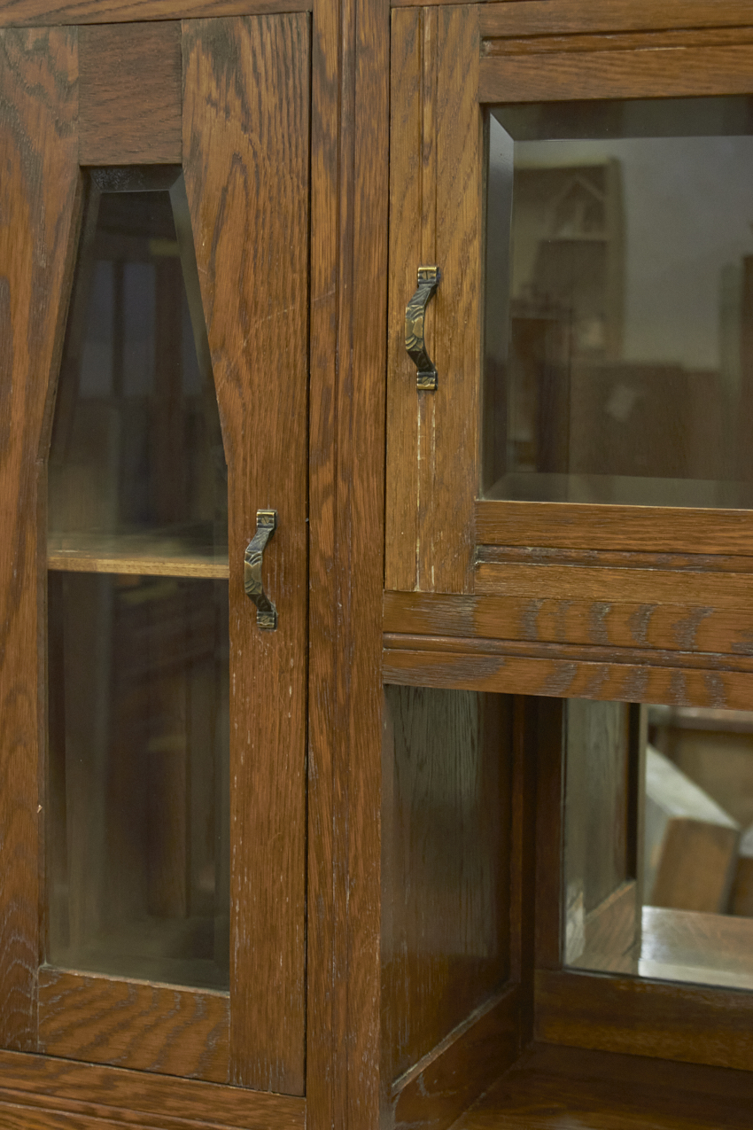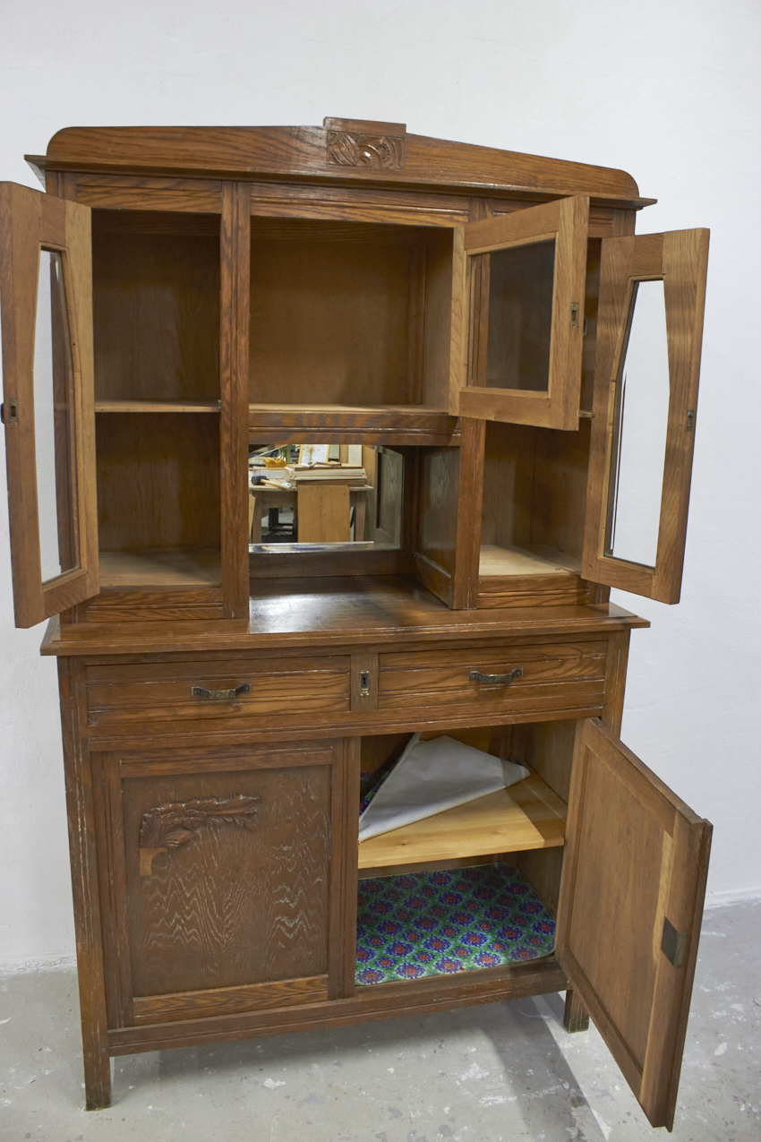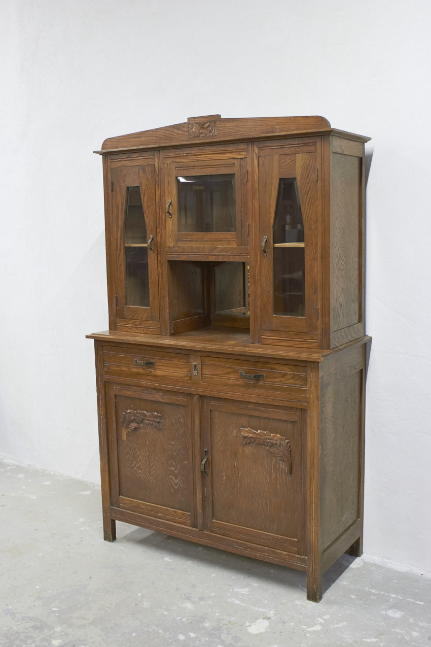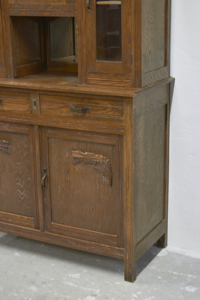 Een prachtig, vintage buffetkast, die op dit moment in onze opslag staat. Het glas in de bovenkant is nog in tact en zo mooi! Helaas is het houtsnijwerk gesneuveld, dit zouden wij er af halen. Dan heb je mooie strakke paneel deuren. We kunnen ook iets anders terug plaatsen. En we kunnen ook het glas vervangen voor hout en meeschilderen. Kom gerust even kijken om samen met ons alle mogelijkheden te bespreken.