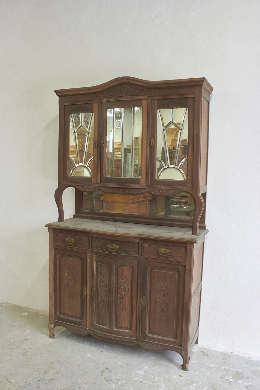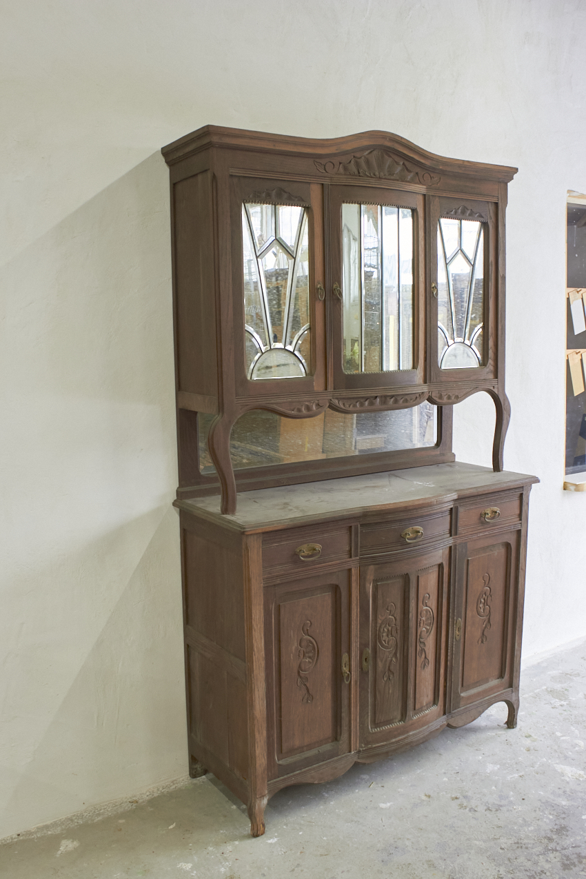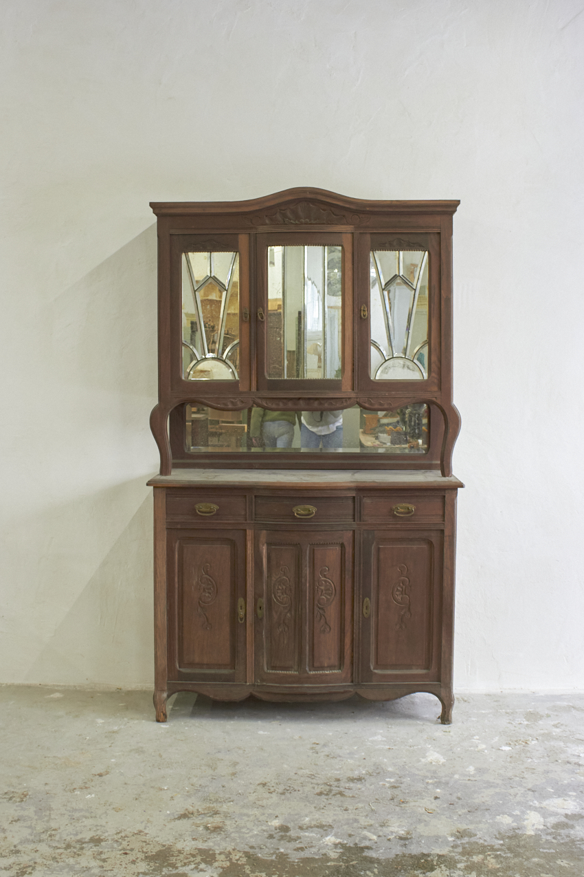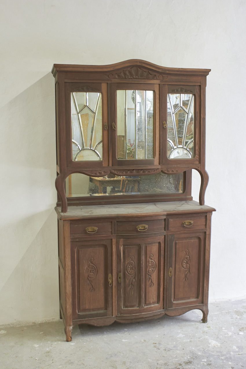 Een prachtig, vintage commode en of buffetkast, die op dit moment in onze opslag staat. Echt perfect voor op de babykamer, je kan de onderkant eerst als commode gebruiken. Vroeger heeft deze gediend als buffetkast, en de bovenkant is ook nog aanwezig. En deze is uitzonderlijk mooi met spiegels.