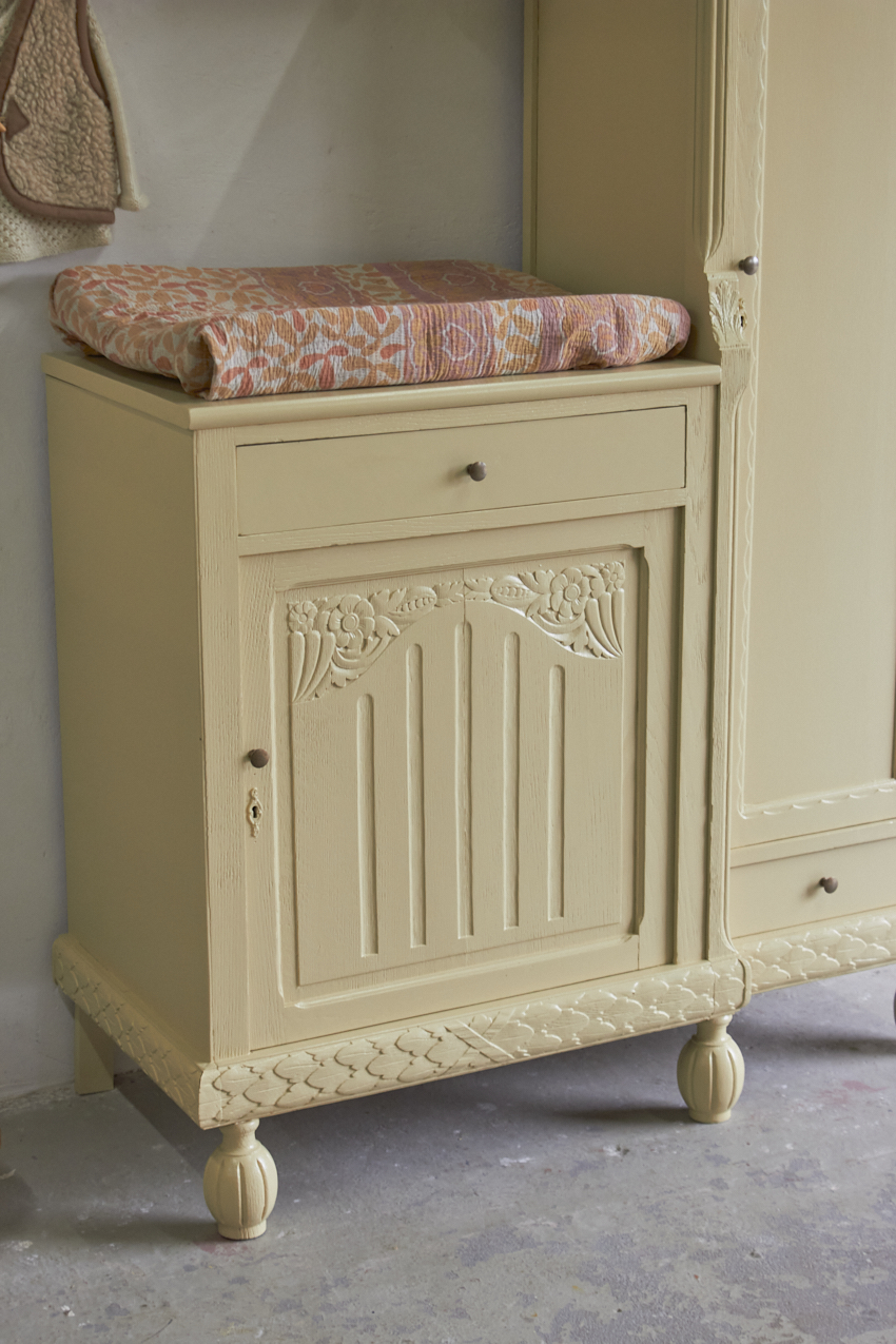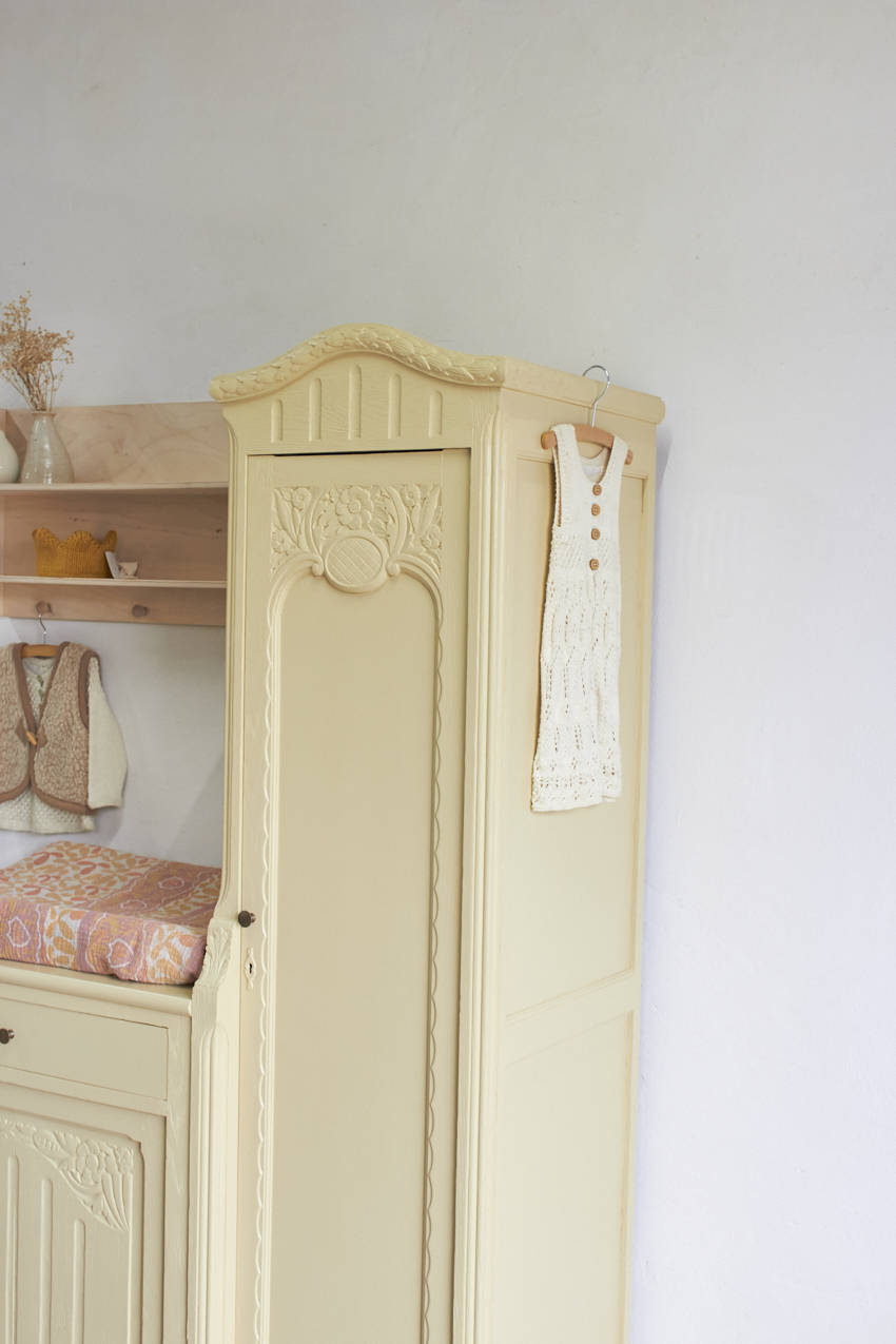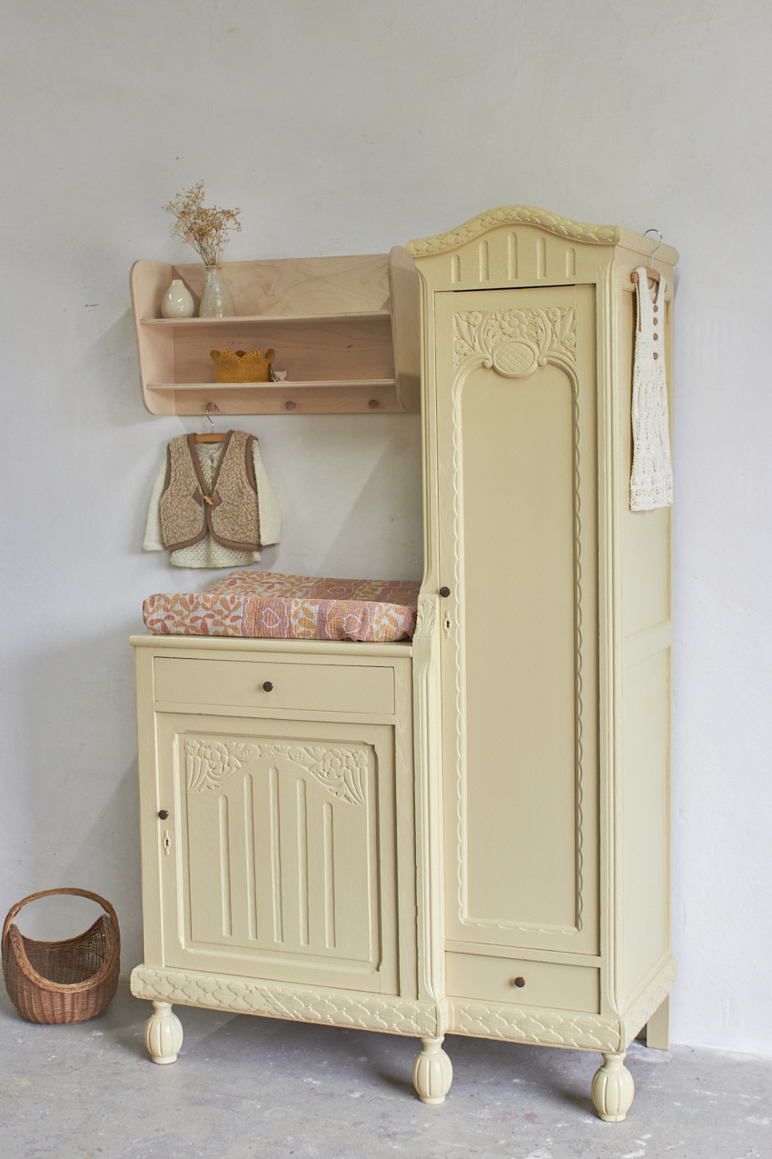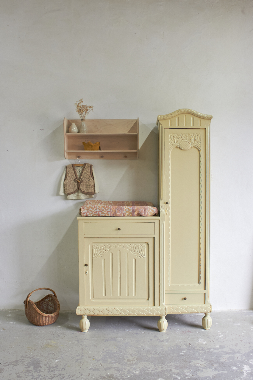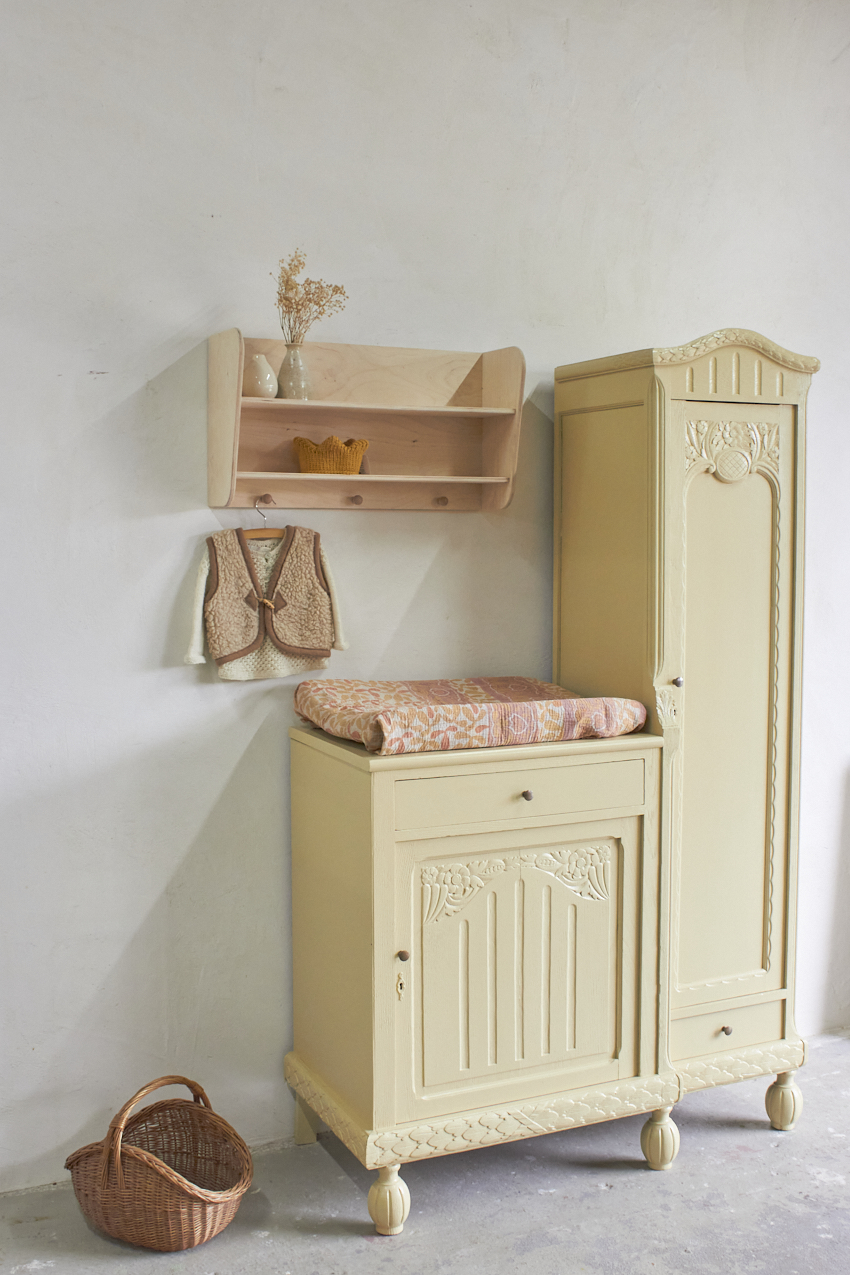 Wauw! Wat een plaatje dit! Een vintage commode in de kleur Kamille. Ze is zo mooi geworden en echt perfect om als commode te gebruiken. Lekker veel opbergruimte door de vele plankjes. Prachtig voor op een babykamer en als de commode niet meer in functie is kan ze vervolgens ergens anders in huis een plekje krijgen, want deze kast zou natuurlijk ook fantastisch staan in de woonkamer als dressoir of als speelgoed kast in de kinderkamer. Kortom, je kan er alle kanten mee op! Wij zijn er heel blij mee.